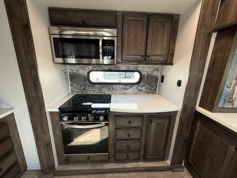 When you adventure out in a Heartland Bighorn Traveler full-profile fifth wheel, you will appreciate the 6-point auto leveling system as you set up camp for a weekend getaway or extended vacation. The electric awning with LED lighting offers protection from the hot sun during the day and extra light for hanging around the campsite in the evening. Inside of each Bighorn Traveler, you will enjoy the class and style that the elegant rain glass shower surround and glazed hardwood cabinetry add to the interior, and the huge panoramic windows will allow you to easily view the amazing scenery that you've chosen to camp beside.
