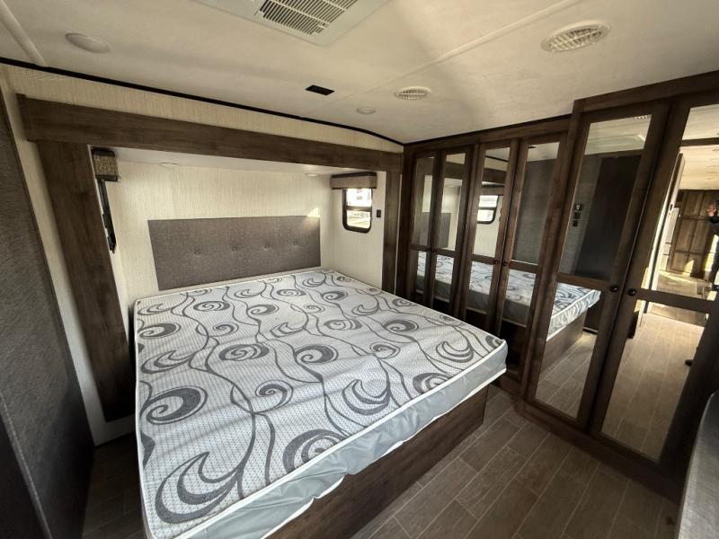 Surprise the family with an exceptional unit like this Bighorn Traveler fifth wheel! The entire luxurious interior is kept open and spacious with five slides so that you can lounge comfortably on the power theater seating or on one of the two sofas. You will also enjoy spending your time in the rear kitchen because the three-burner range top will keep preparations running smoothly, and all the snacks can go in the two pantries. End your evening by heading to the front private bedroom where you will find a king bed slide for the ultimate relaxation.