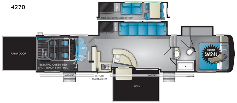 Come load up your off-road toys and your family, and head out to your favorite destination where you can camp and play outdoors. This Heartland Cyclone 4270 toy hauler fifth wheel features a side patio where you can enjoy being outdoors but yet you are up off the ground. In the garage, after your riding gear is unloaded you then have 13' of livable space. Here there are plenty of cabinets, an electric queen bed plus a split bench seat which converts into a bed. Above the garage there is a loft which adds a fun spot for your kids, plus with a dual entry bath everyone can easily get ready for the day. In the front bedroom you will find a tilting king bed where you can relax and get a good night's rest!