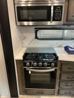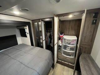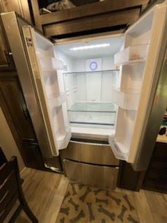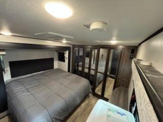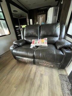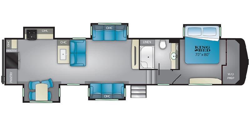 No camping trip is complete without this ElkRidge fifth wheel! In the front private bedroom, you will find a king bed slide which is extremely useful because it not only provides a comfortable place to rest your head at night, but it also slides out so that there is more walking space in the bedroom. The main living area is also decked out with great features, like the power theater seating with heat and massage, the opposing sofa slides, and the entertainment center. For those who enjoy cooking, the rear kitchen will be your favorite place to spend your time. Since there are also opposing slides in this area, there is more space to cook freely, and the two pantries are super helpful for keeping your snacks and spices stored away.