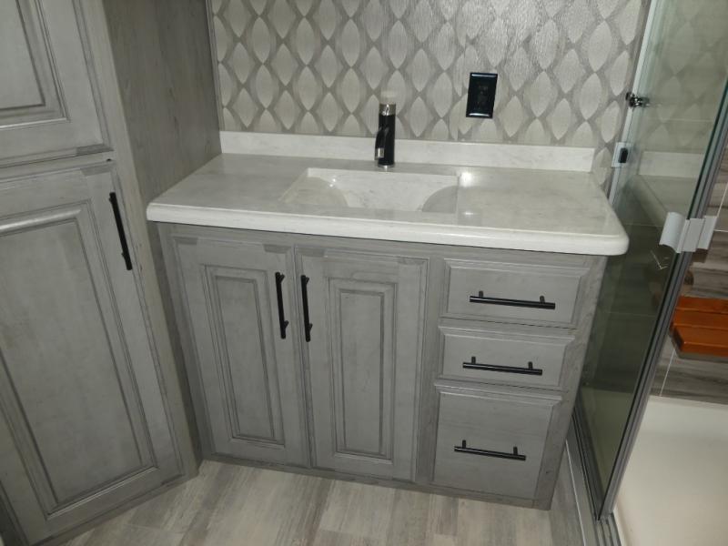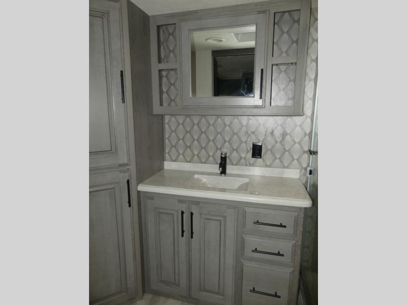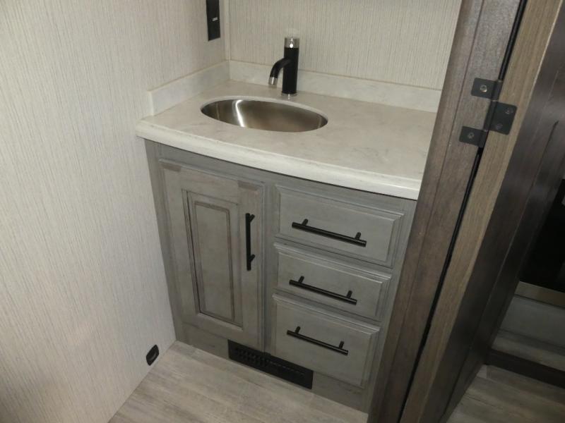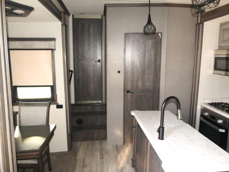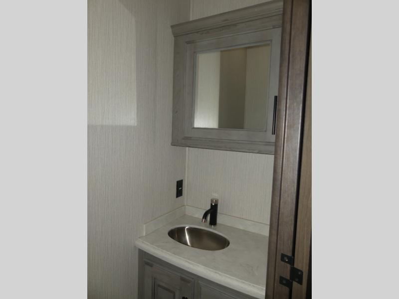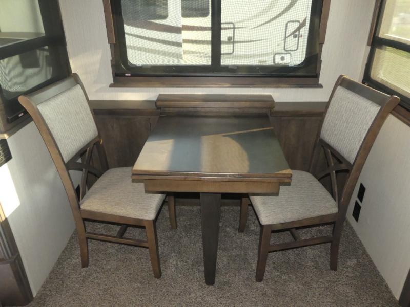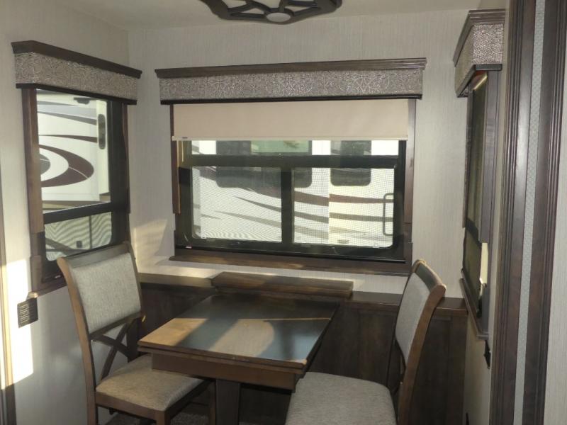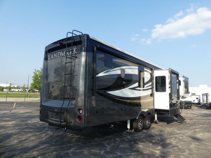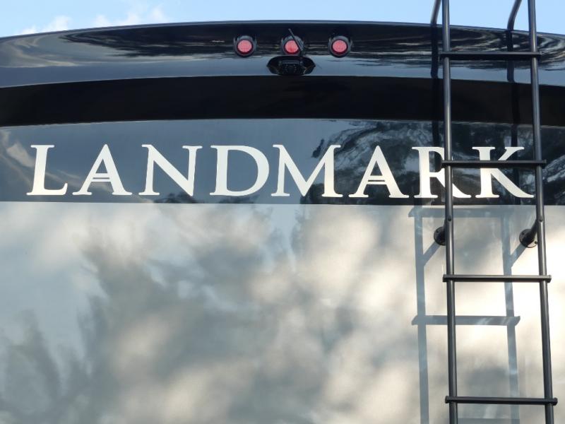 Don't forget to pack your sense of adventure before you take off with this Landmark 365 fifth wheel! This model lets you feel like you've never left home with its separate living room up front and its completely accommodating master suite in the back. In the central living area, there is an additional half bath next to the kitchen so that you don't have to go far while you are preparing dinner on the three-burner gas cooktop or in the convection microwave. Sit down with a hot meal at the free-standing table with chairs before heading outside to check out the night sky underneath the two electric awnings with LED lights.