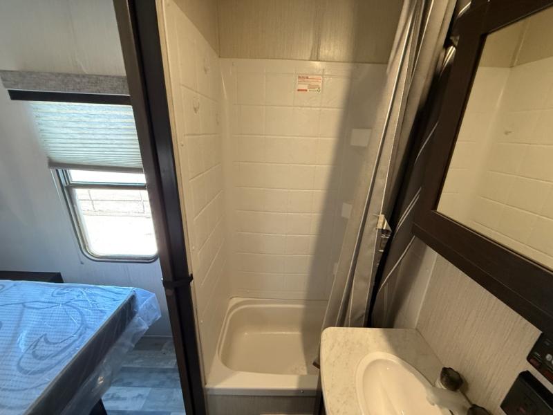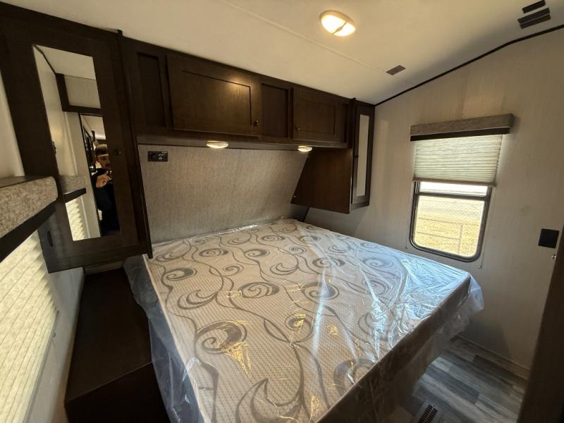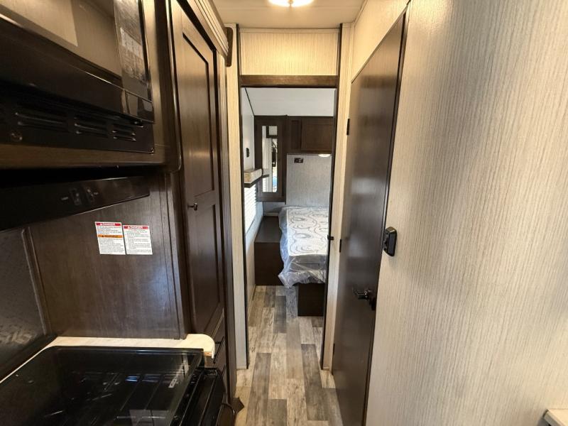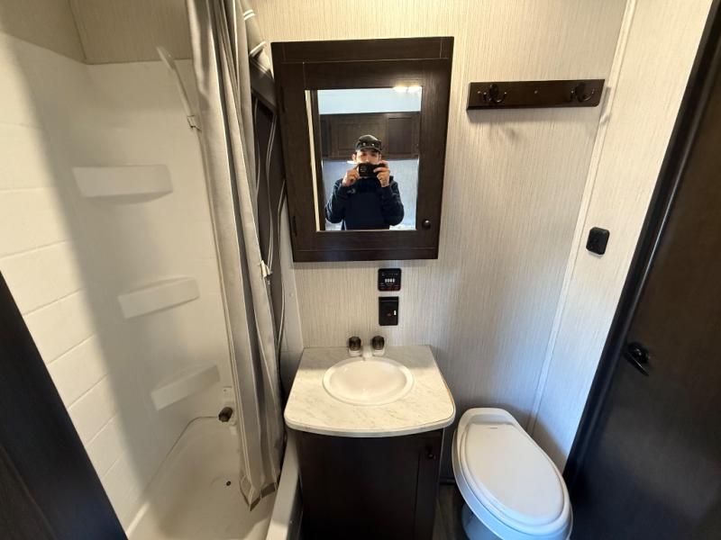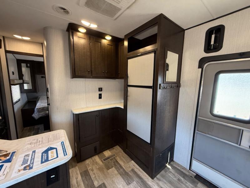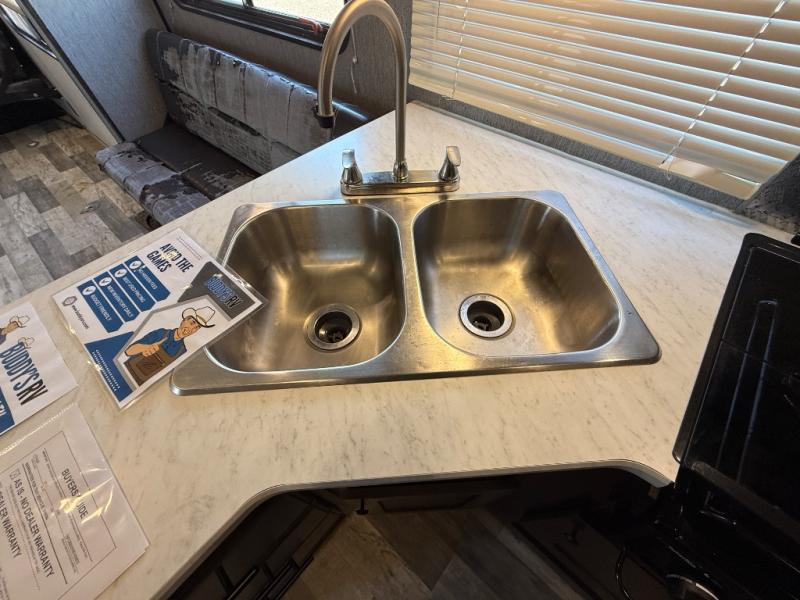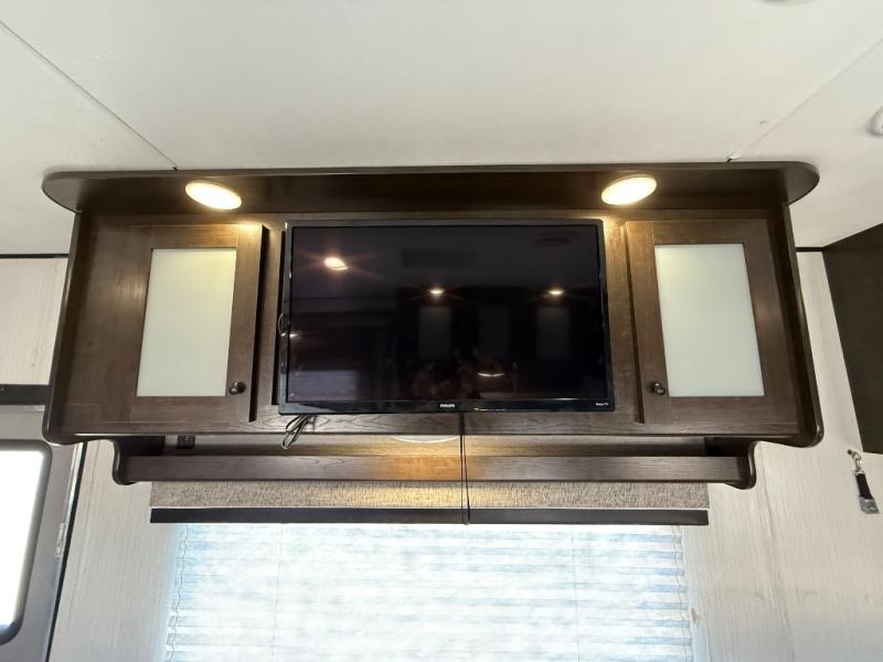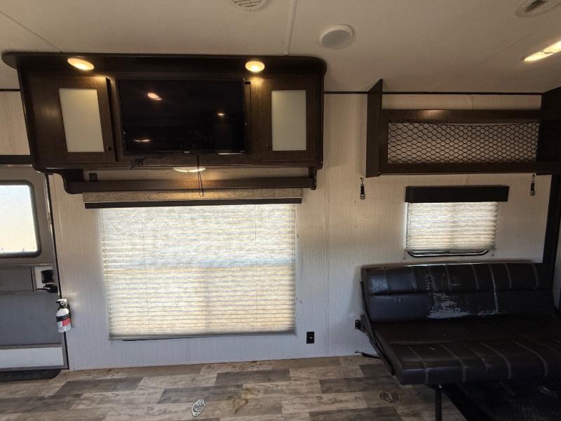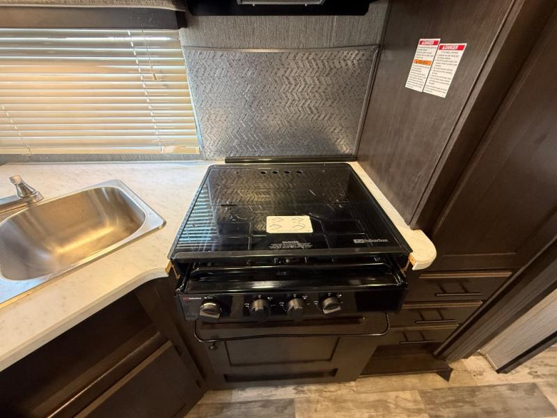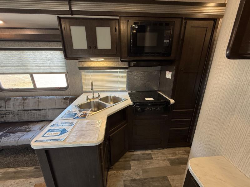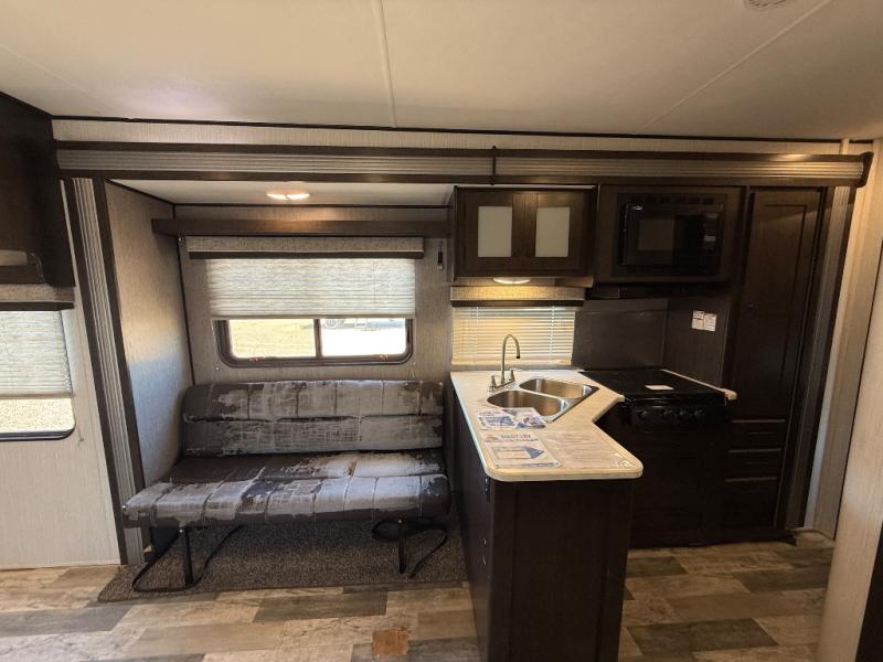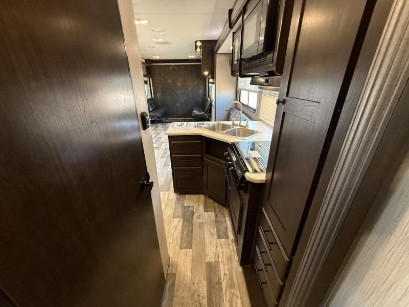 This Lithium toy hauler is such a great unit to take with you this season! The king bed in the front master suite will be so relaxing to sleep on each night. Before heading to bed, you can even spend a little time chatting with your fellow campers on the sofa, the lounge chair, or the fold-up sofas with table in between. If you all get a little hungry, you can even whip up some grilled cheese in the kitchen on the three-burner range, or simply heat up some popcorn in the microwave if you prefer to have a quicker snack.