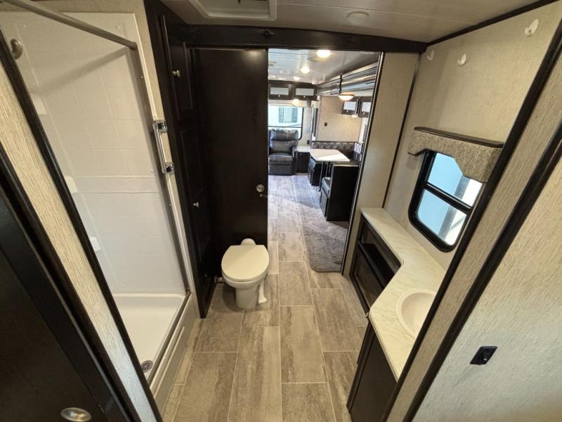 Get ready to make memories after memories with your family when you choose to camp in this single-slide North Trail travel trailer. With the convenience of two entry doors, you can enter either the front or back portion of the trailer. Within the slide out there is a U-shaped dinette where you can enjoy your meals, and at night the dinette converts into additional sleeping space. The walk-through bathroom has sliding doors along either side for complete privacy, and you will also find all of the amenities needed to get ready for the day such as a shower, toilet, sink, and large vanity!