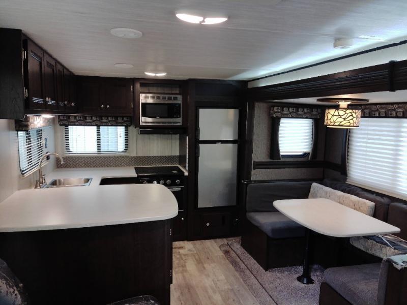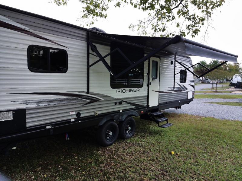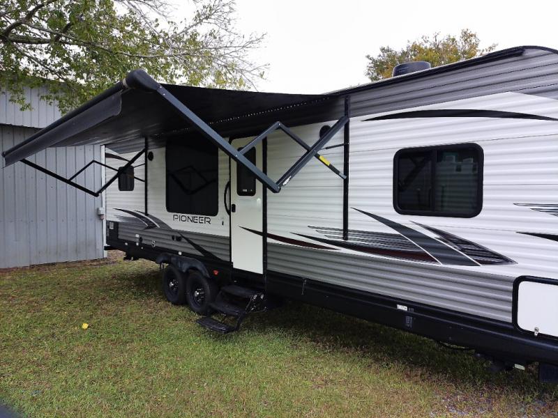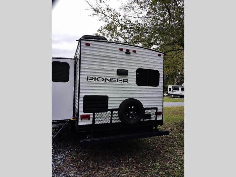 Get away to the countryside or spend a weekend exploring local tourist attractions with this Pioneer travel trailer! You will appreciate how easy it will be to take care of your family with the features that have been included in this trailer, like a full kitchen with a residential sink, microwave, three-range, and double-door refrigerator. With the removable dinette table, you can enjoy your meals both indoors and outdoors, and the 15' power awning will protect you from overheating while you eat your dinner outside.