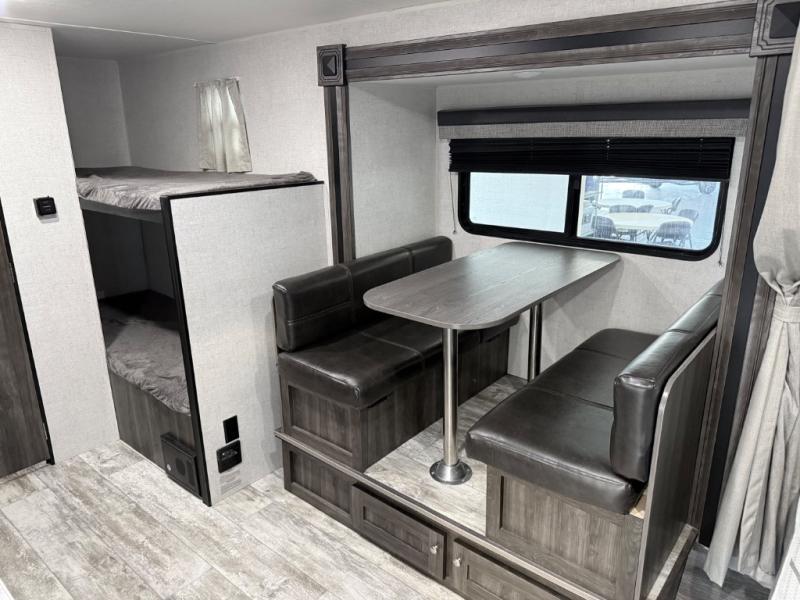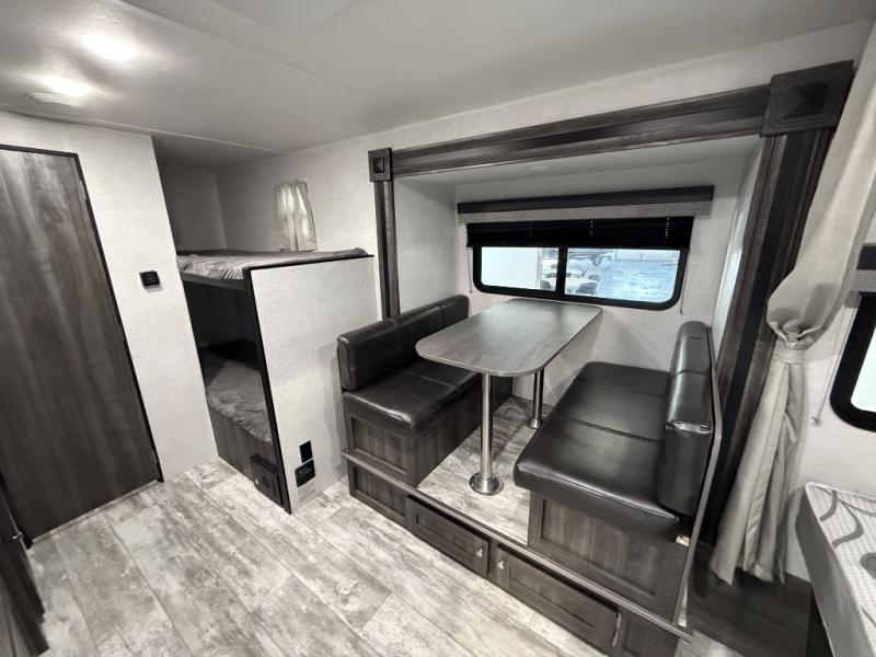 For a fun weekend getaway, take a look at this Mesa Ridge Conventional travel trailer! Whether you're backpacking in the woods or fishing on the lake, the exterior storage will allow you to bring along all of the gear you need, and the rear set of bunk beds, a booth dinette, and a front queen-size bed will give you plenty of sleeping space to bring along your family and friends. If you enjoy spending your evenings outdoors by the campfire, then you will certainly appreciate the 11' power awning with LED lights that has been included with this model.