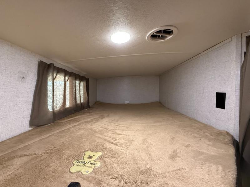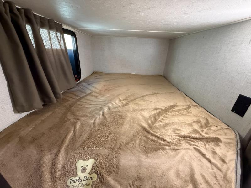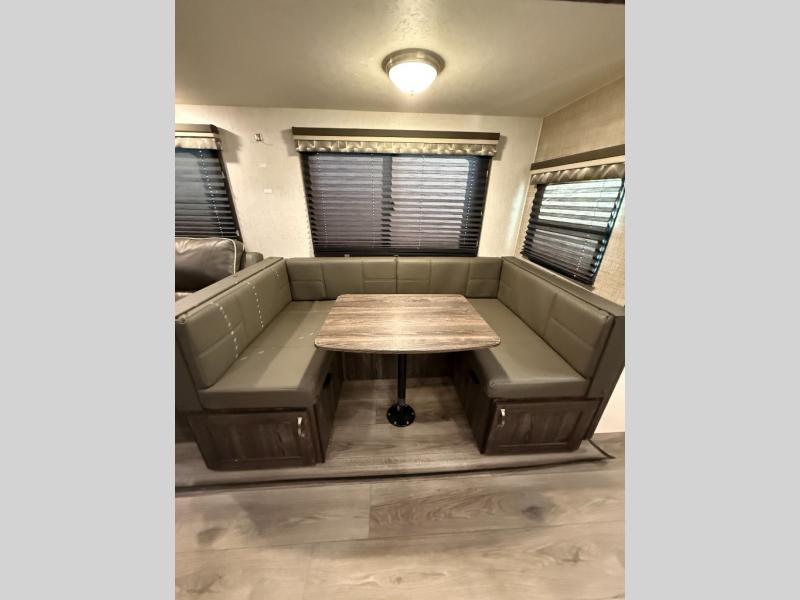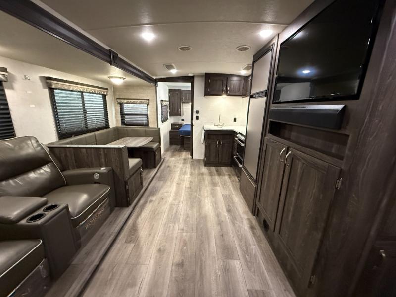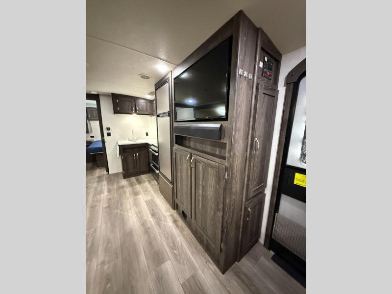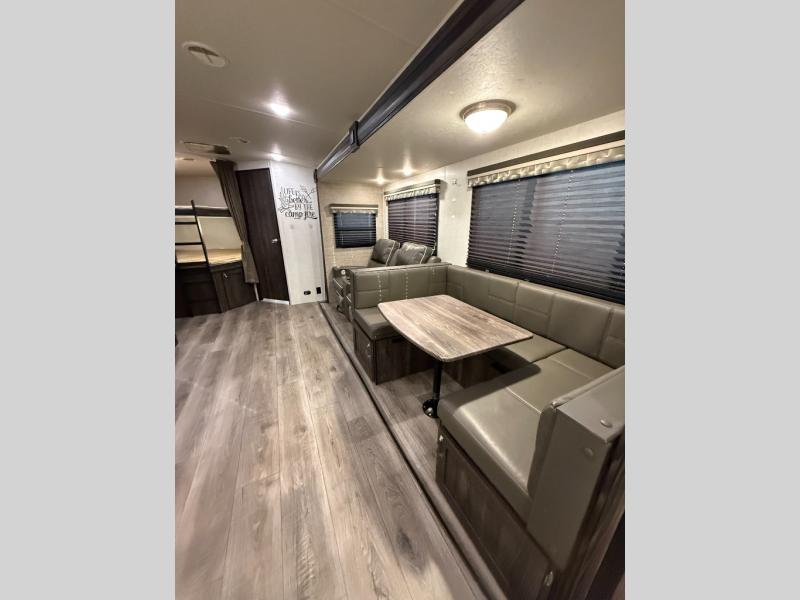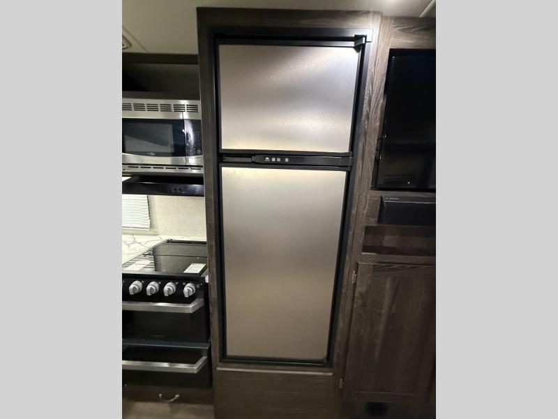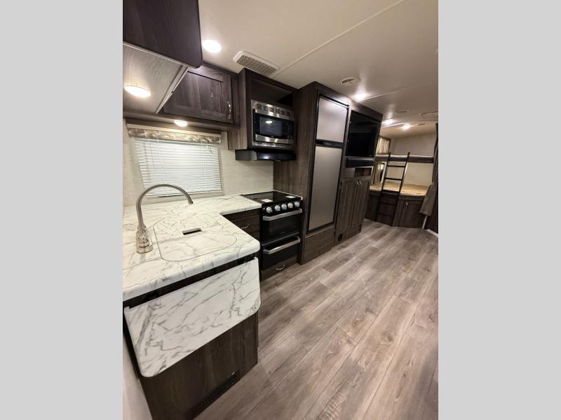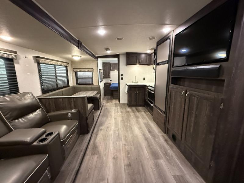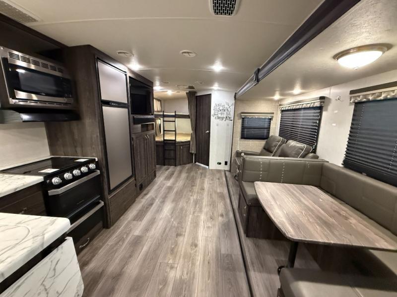 Are you looking for the perfect travel trailer for you and your family, even your pet? From the double size bunks for the kiddos next to the full bathroom to the theater seats and dinette to relax on inside to watch the 39" LED TV, everyone will find their favorite spot for the weekend. The chef in the family can choose to cook inside using the stainless steel appliances or outside with the outdoor kitchen while watching the kids ride their bikes around the campsite. You will find your own sleeping accommodations in the private front bedroom on the queen bed with pet kennel underneath, plus the second entry/exit into the trailer as an added convenience. And the laundry chute, the entry closet, and the power awning will provide even more features you will love.