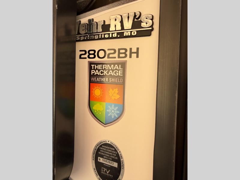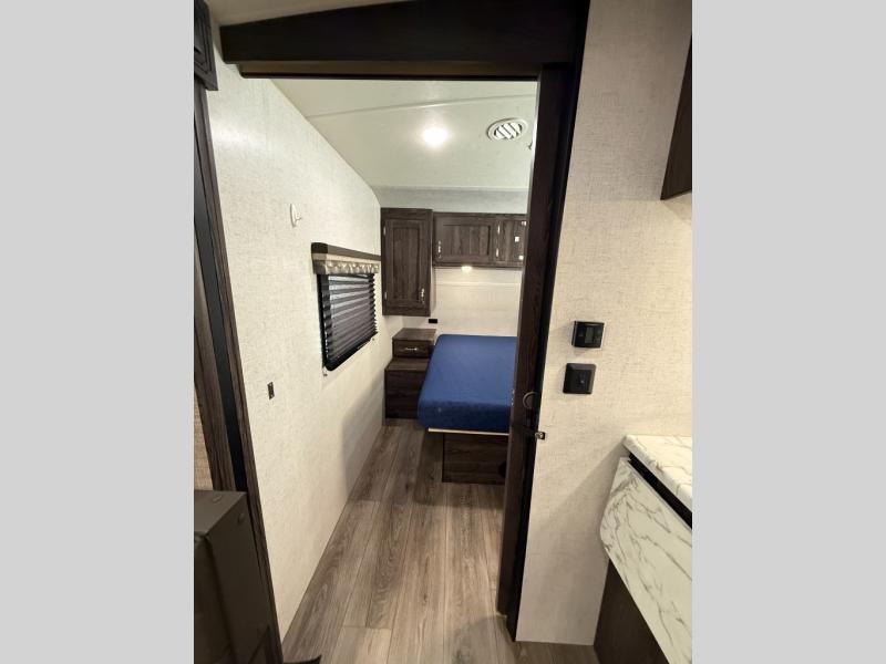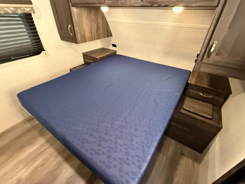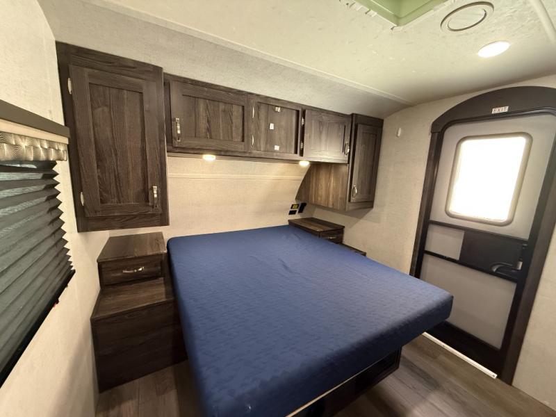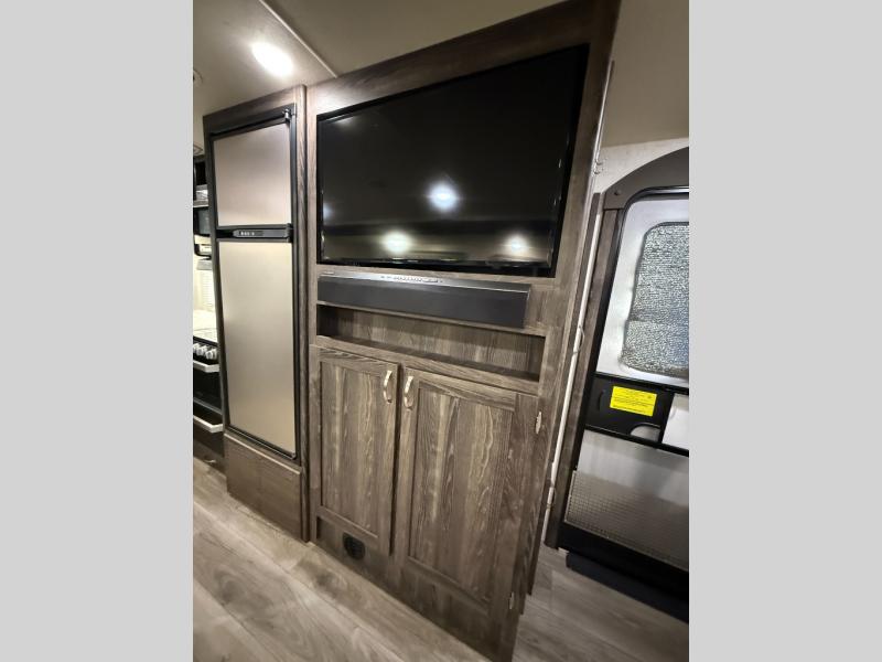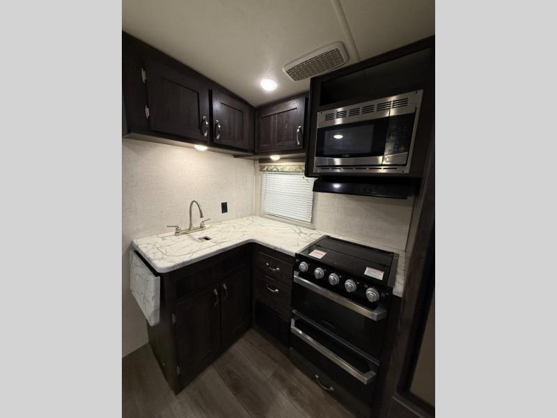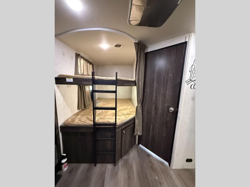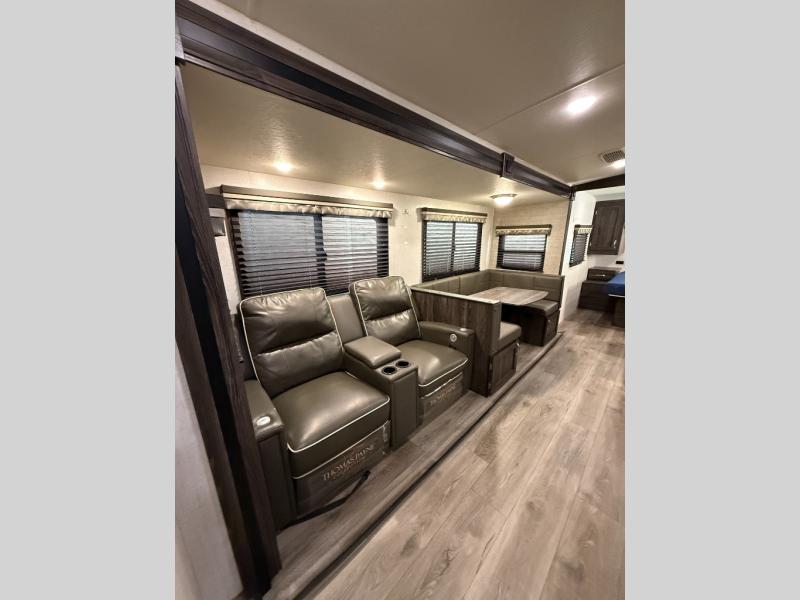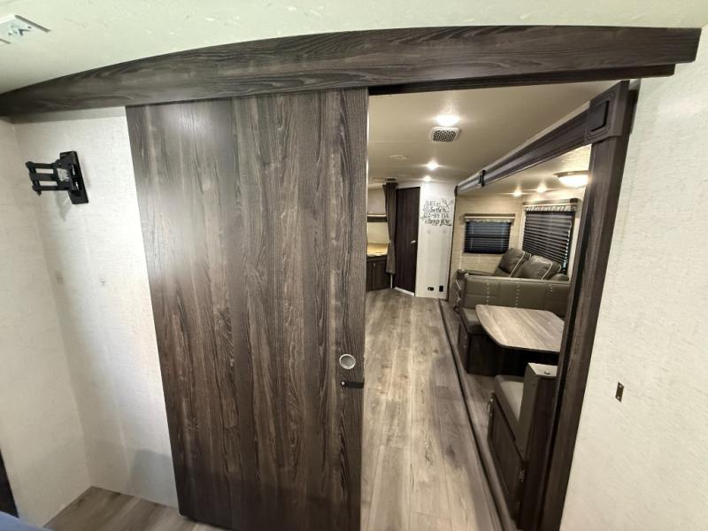 Are you looking for the perfect travel trailer for you and your family, even your pet? From the double size bunks for the kiddos next to the full bathroom to the theater seats and dinette to relax on inside to watch the 39" LED TV, everyone will find their favorite spot for the weekend. The chef in the family can choose to cook inside using the stainless steel appliances or outside with the outdoor kitchen while watching the kids ride their bikes around the campsite. You will find your own sleeping accommodations in the private front bedroom on the queen bed with pet kennel underneath, plus the second entry/exit into the trailer as an added convenience. And the laundry chute, the entry closet, and the power awning will provide even more features you will love.