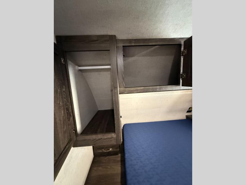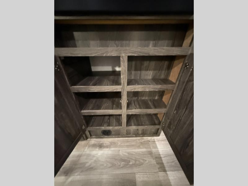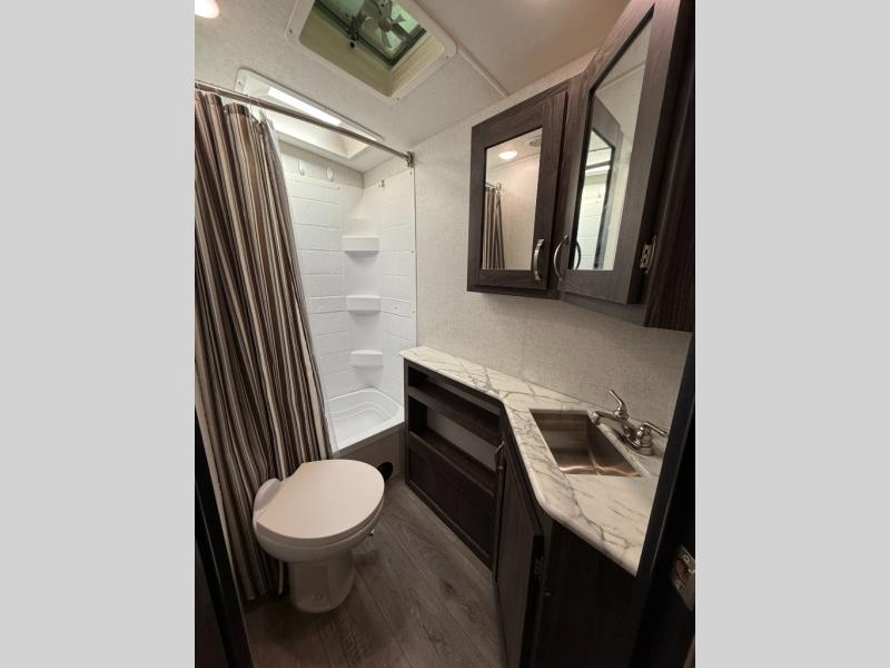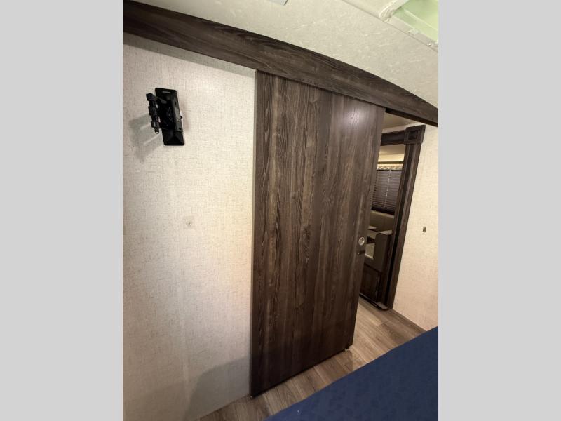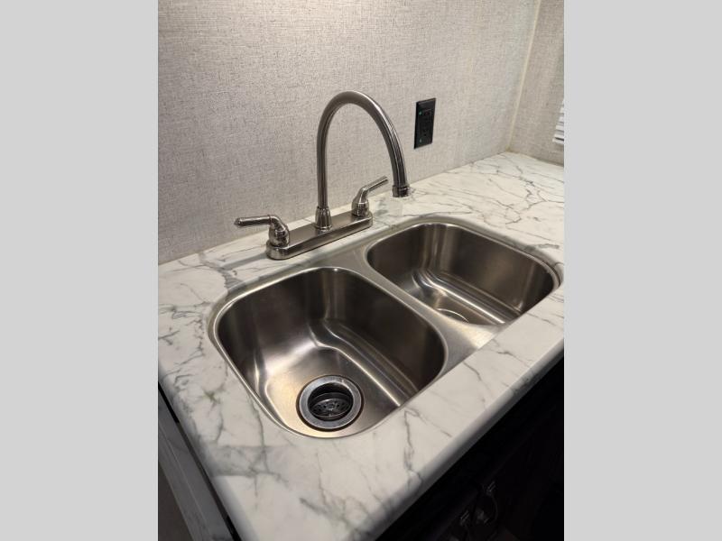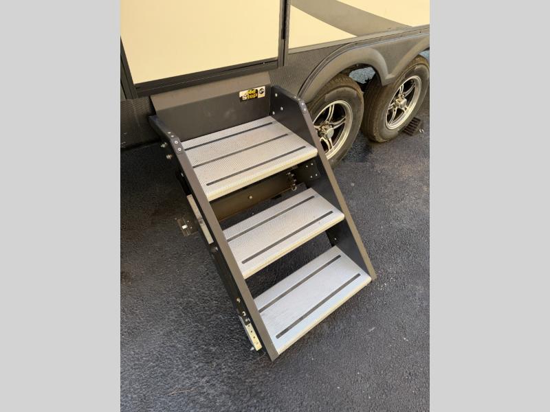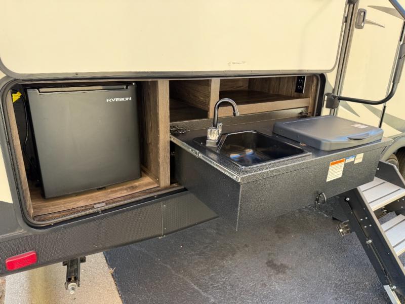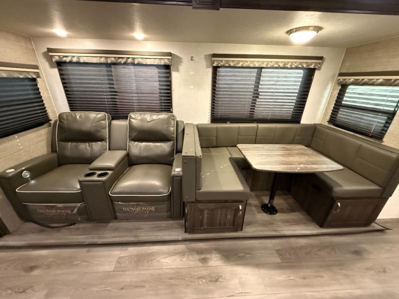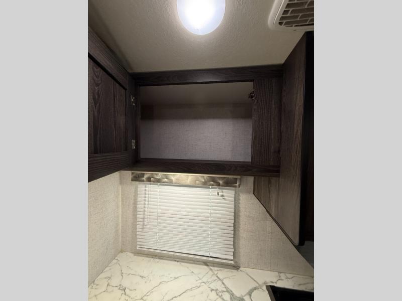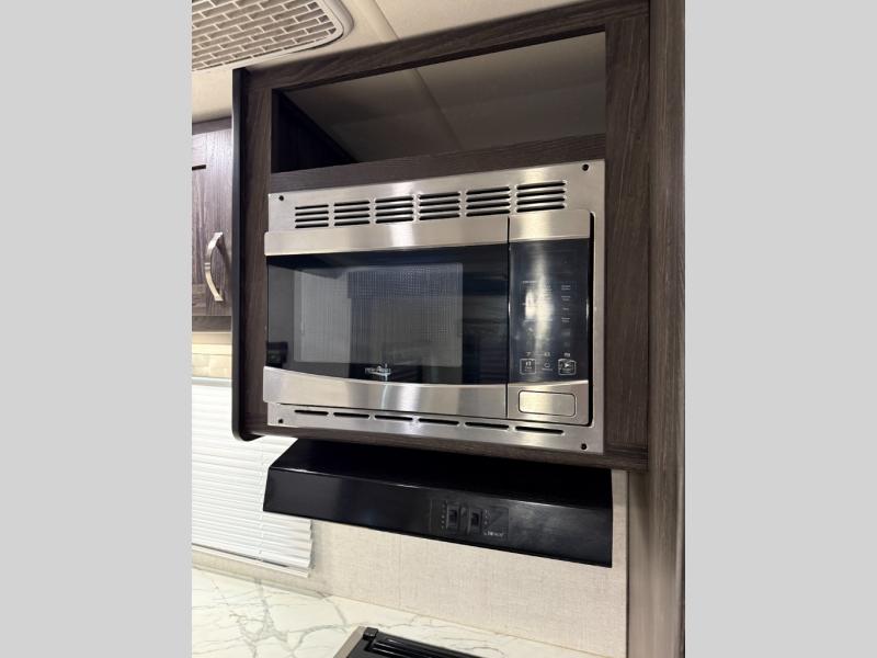 Are you looking for the perfect travel trailer for you and your family, even your pet? From the double size bunks for the kiddos next to the full bathroom to the theater seats and dinette to relax on inside to watch the 39" LED TV, everyone will find their favorite spot for the weekend. The chef in the family can choose to cook inside using the stainless steel appliances or outside with the outdoor kitchen while watching the kids ride their bikes around the campsite. You will find your own sleeping accommodations in the private front bedroom on the queen bed with pet kennel underneath, plus the second entry/exit into the trailer as an added convenience. And the laundry chute, the entry closet, and the power awning will provide even more features you will love.