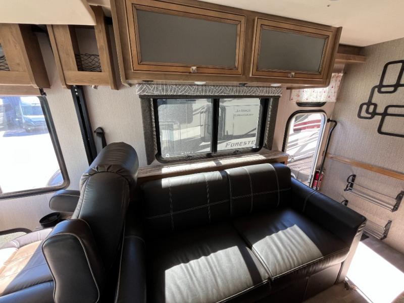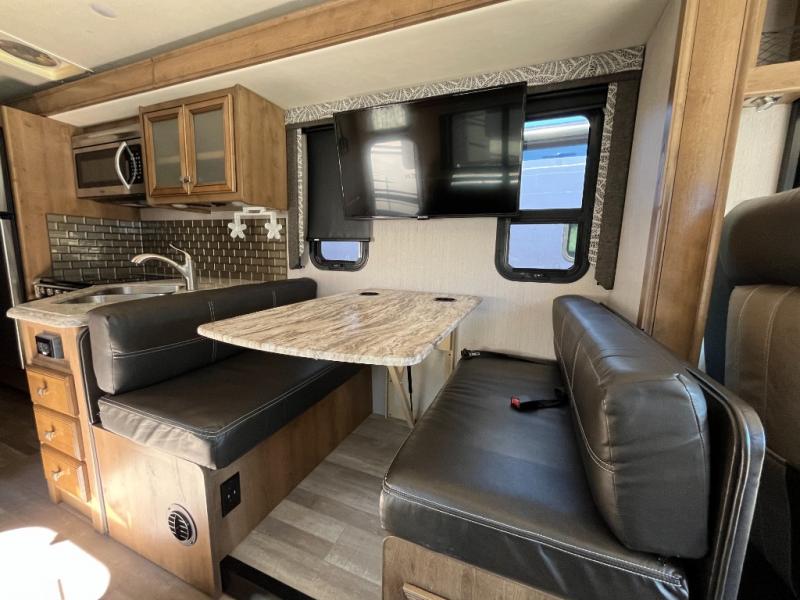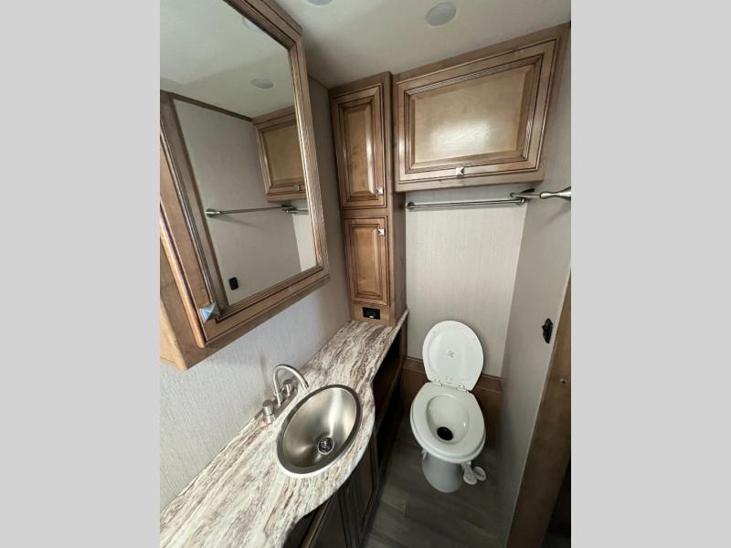 Two full baths, a Hide-A-Loft drop-down queen bed, a Serenity Series King bed, plus many more features makes this motorhome one-of-a-kind! The chef of the family will enjoy cooking breakfast each morning in this kitchen that includes a three burner cooktop, an over the range microwave oven, and a residential refrigerator. You'll find plenty of seating space to relax on, including a jack-knife sofa, a booth dinette, or take your cold drink outside to sit under the electric awning with LED lights. This model features a full-wall slide plus a slide out in the bedroom for even more space and the two full baths makes this unit one you don't want to pass up!