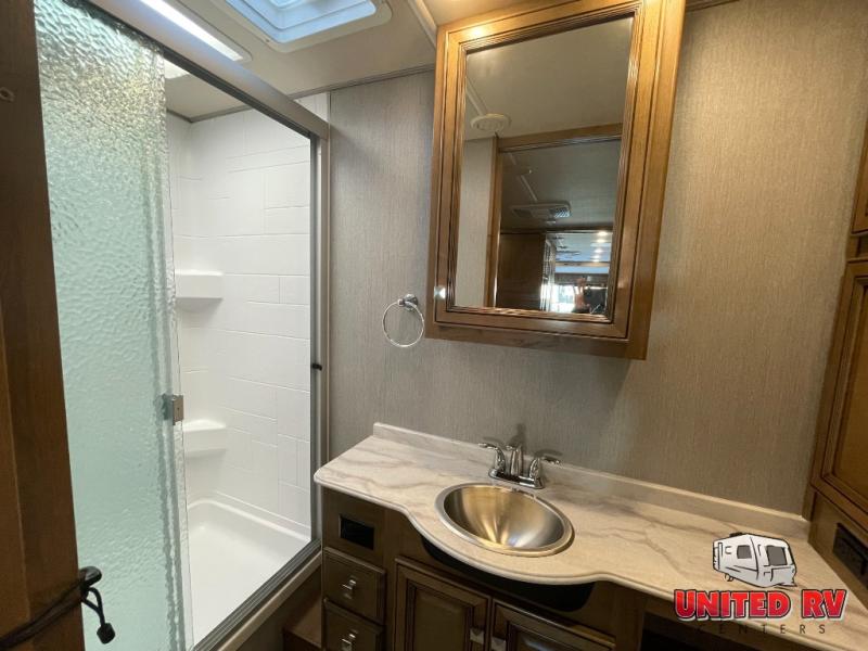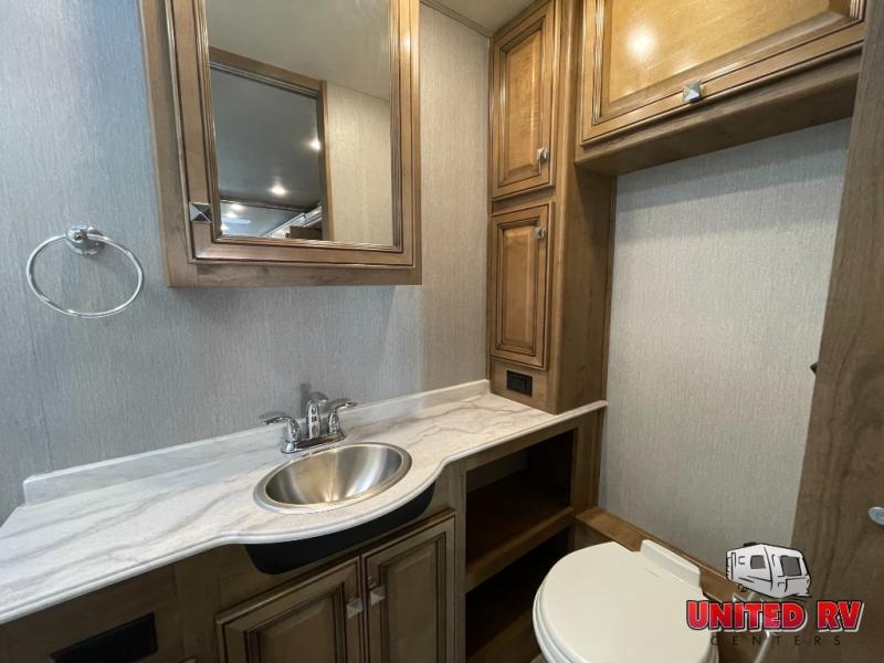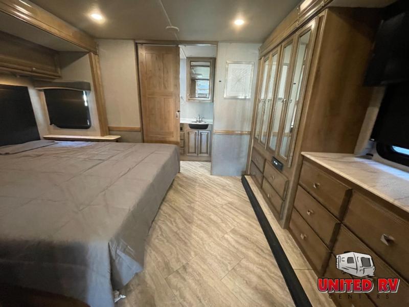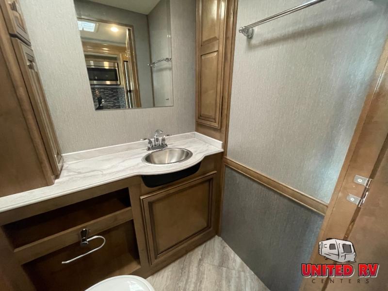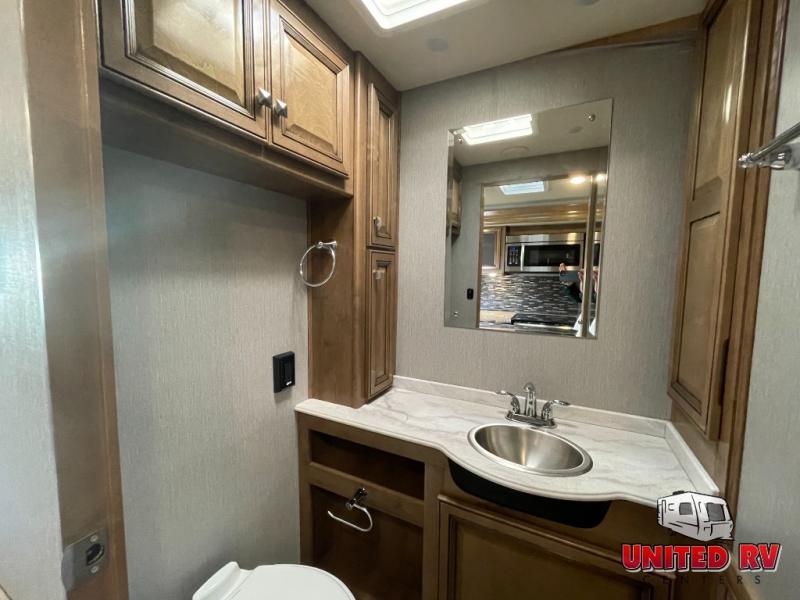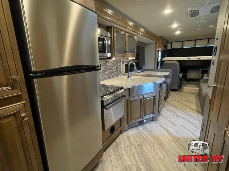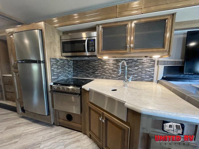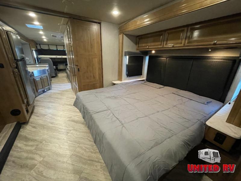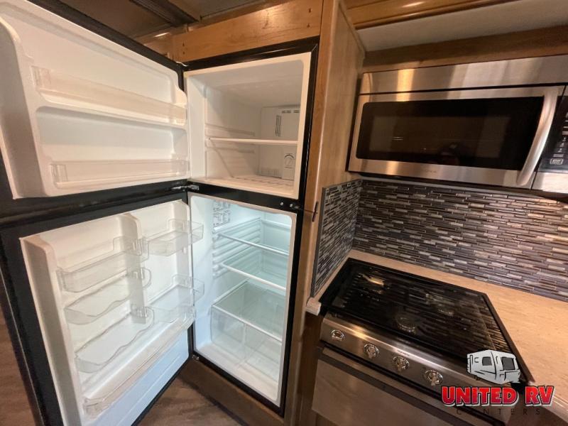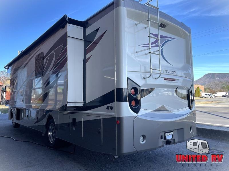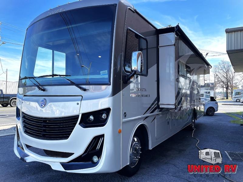 Achieve the very best adventures with this Invicta Class A gas motorhome! This luxurious coach will wow you from the moment you step foot inside and see the feature wall with accent wall covering, the vinyl tile flooring, the raised panel solid wood cabinets, and the energy-efficient flush-mount ceiling and under-cabinet reading lights. All of these features set the stage for the rest of the extravagant features, like a rear master suite with a king-size bed, full bathroom, and 32" LED TV and an additional half bath in the main living area. The residential refrigerator will be super helpful for stocking up on ingredients before leaving home, and the pantry will be able to hold any non-perishable items.