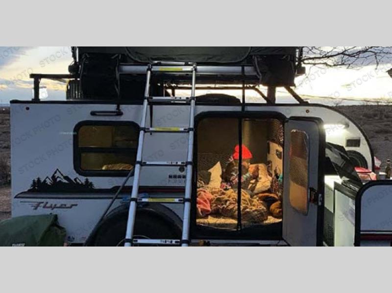 This Flyer Pursue travel trailer can easily be towed behind your family car, SUV, or truck. This micro-lite unit is slightly larger than the Chase Flyer, and it is ready to take your camping to the next level. You will find loading is easy with the rear double doors and side entry with window. Two additional windows offer natural light inside, as well as cross ventilation when needed. This model easily sleeps two, and you can choose the optional add-a-room tent for additional space if you wish. You might even decide to add the optional kitchen slide out with 12V refrigerator. There are plenty more standard features and options to see!