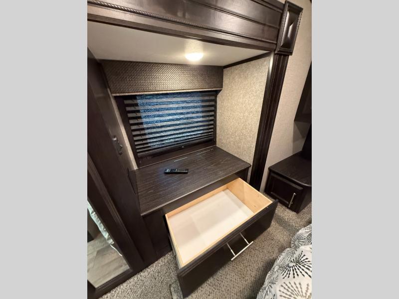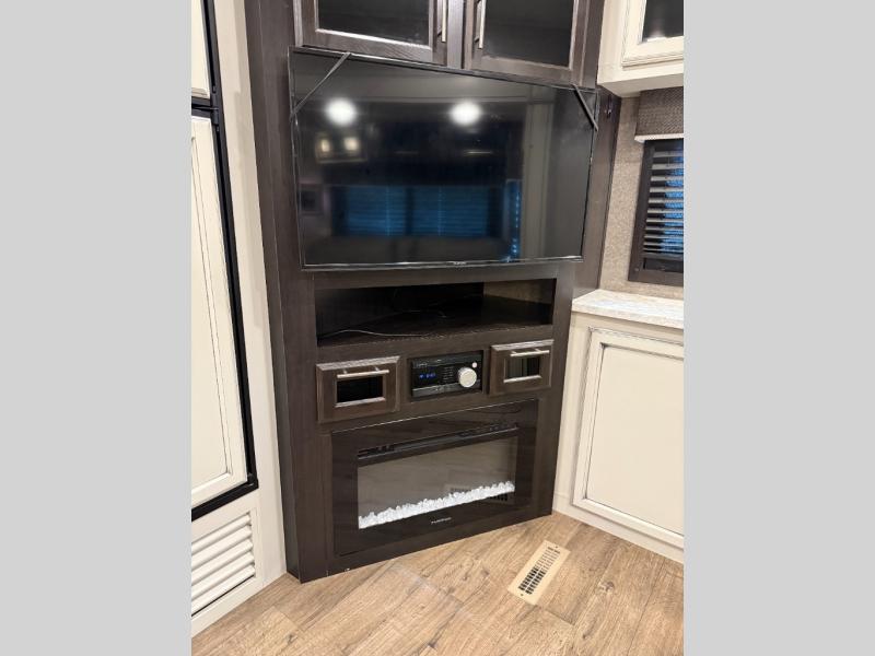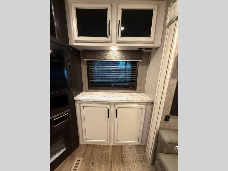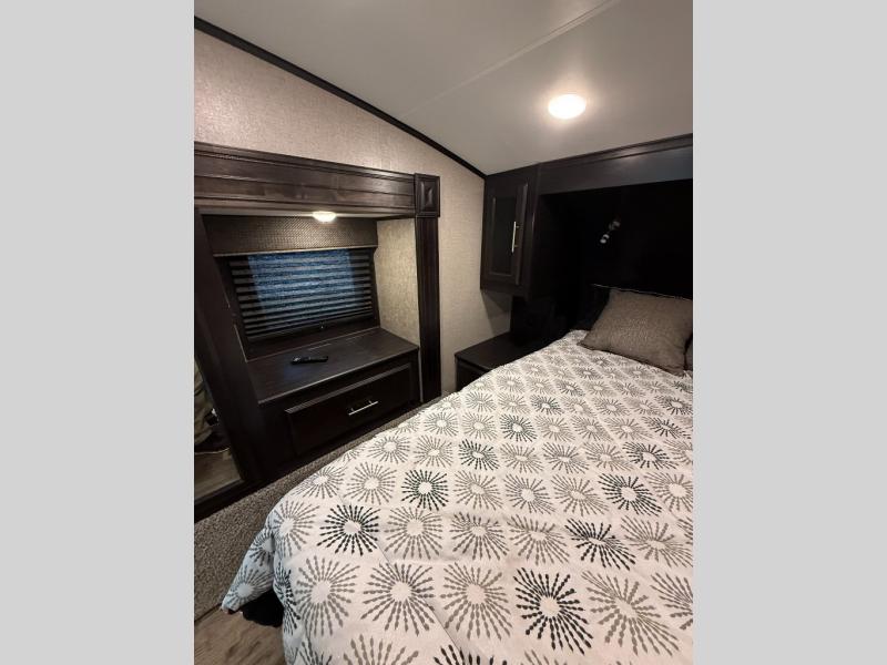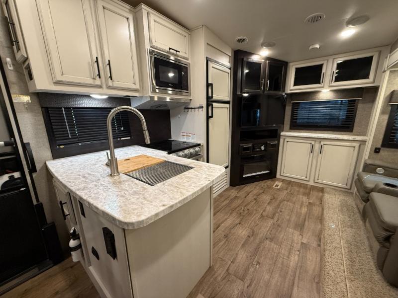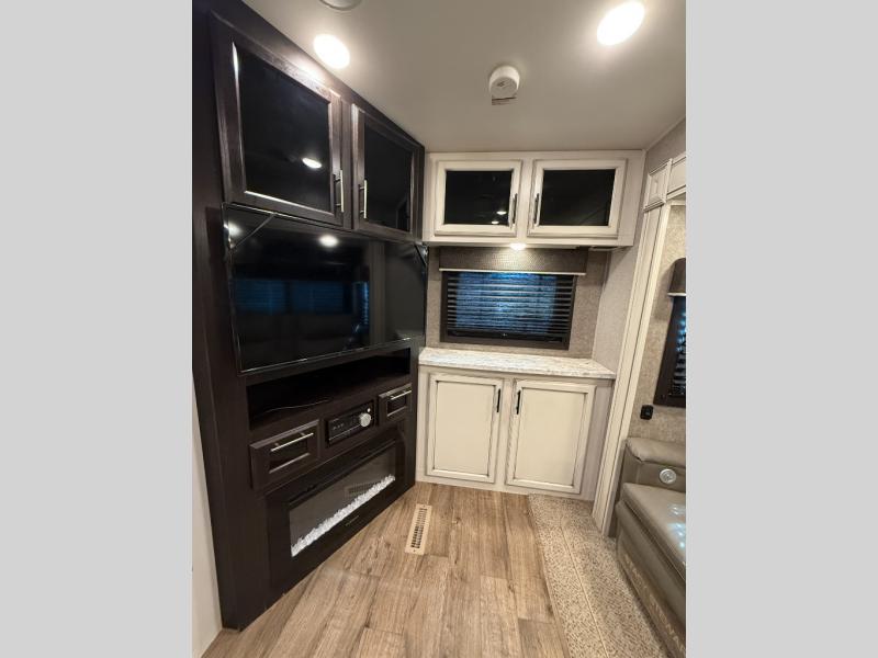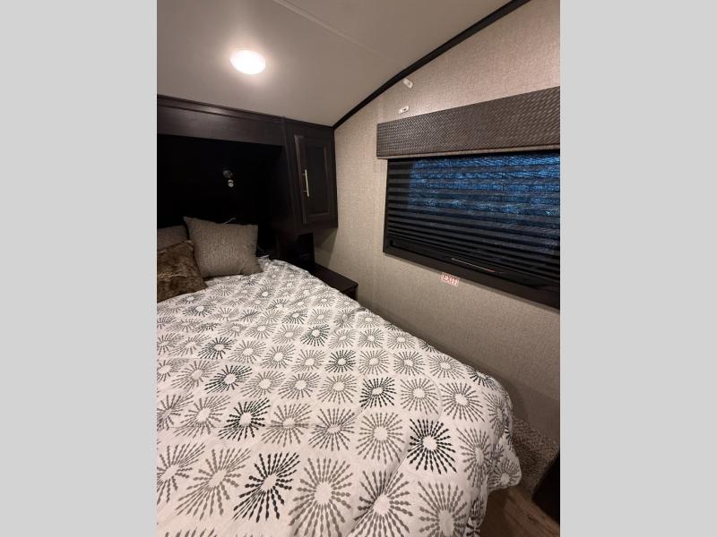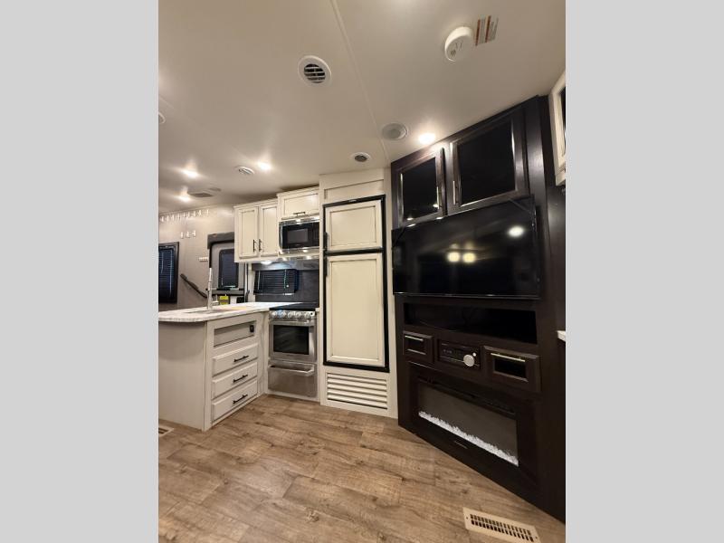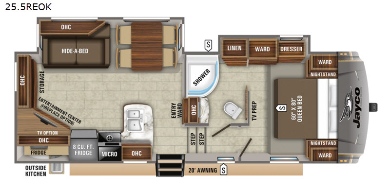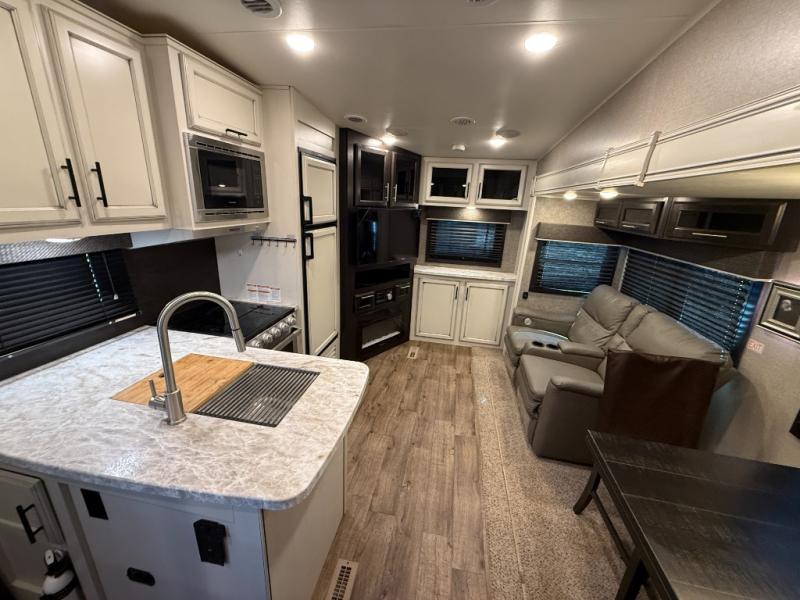 Jayco's shortest half-ton towable Eagle HT fifth wheel offers a smaller unit that can easily fit in campsites at state and national parks, and it includes lots of features, such as an outside kitchen to make meals, a bedroom wardrobe slide with a window for cross-ventilation and natural light, and a double-entry bathroom for convenience. As you enter, you will appreciate the floor space in the main living and kitchen area with seamless countertops, stainless steel appliances, and a digital entertainment center along the rear corner wall for easy viewing. The LED HDTV will allow you to watch what you like on rainy days or before bedtime, and the 20' awning gives you some protection and LED lights when wanting to relax outside during the day or night hours. You might even like to add a few options such as 16" Goodyear tires, an LED fireplace, and/or theater seating in place of the sofa.