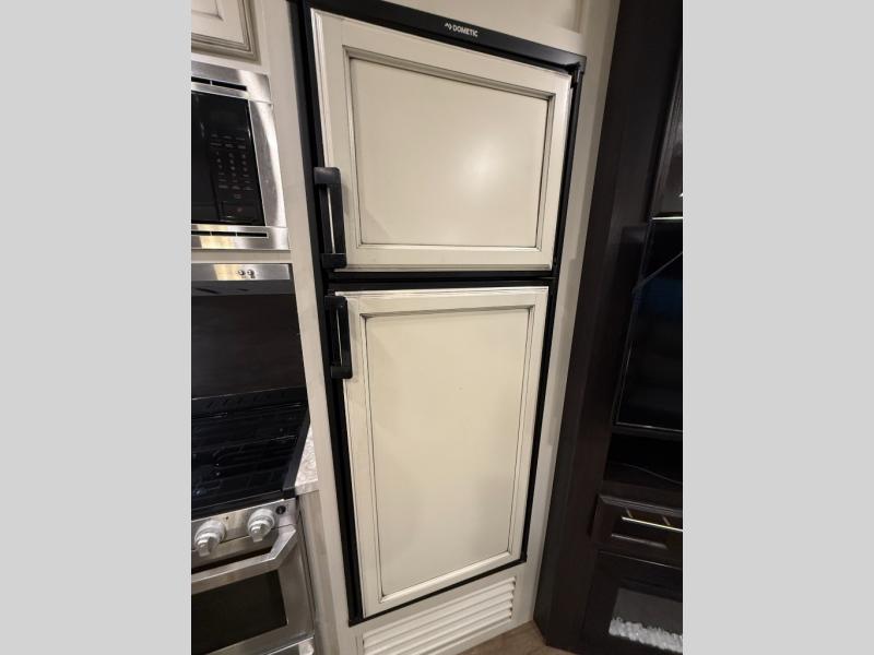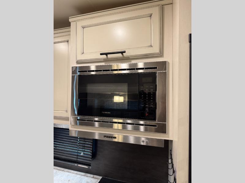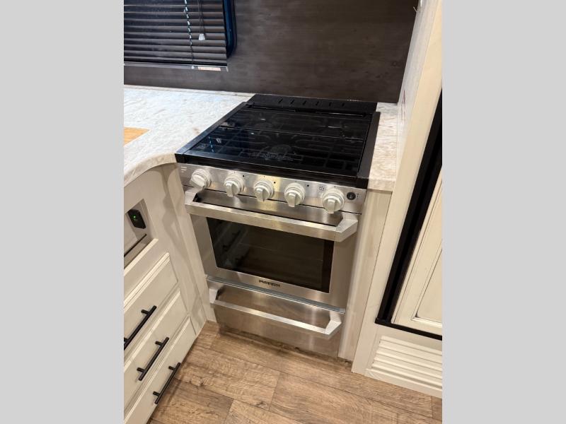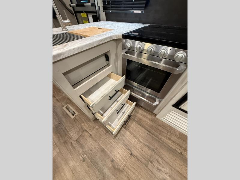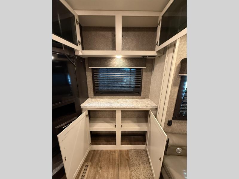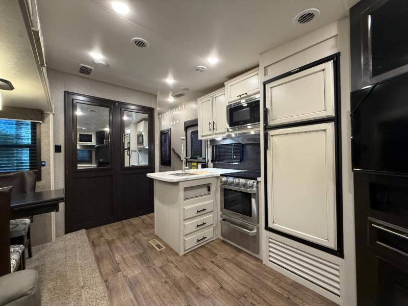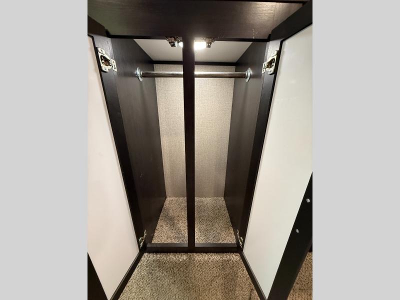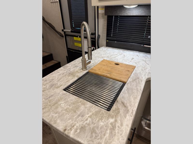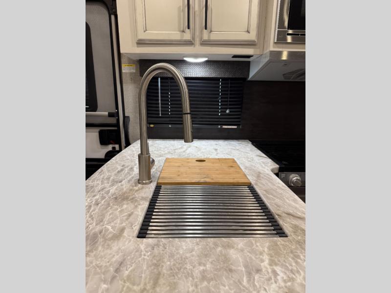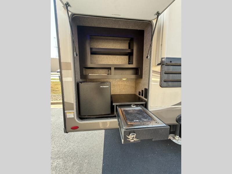 Jayco's shortest half-ton towable Eagle HT fifth wheel offers a smaller unit that can easily fit in campsites at state and national parks, and it includes lots of features, such as an outside kitchen to make meals, a bedroom wardrobe slide with a window for cross-ventilation and natural light, and a double-entry bathroom for convenience. As you enter, you will appreciate the floor space in the main living and kitchen area with seamless countertops, stainless steel appliances, and a digital entertainment center along the rear corner wall for easy viewing. The LED HDTV will allow you to watch what you like on rainy days or before bedtime, and the 20' awning gives you some protection and LED lights when wanting to relax outside during the day or night hours. You might even like to add a few options such as 16" Goodyear tires, an LED fireplace, and/or theater seating in place of the sofa.