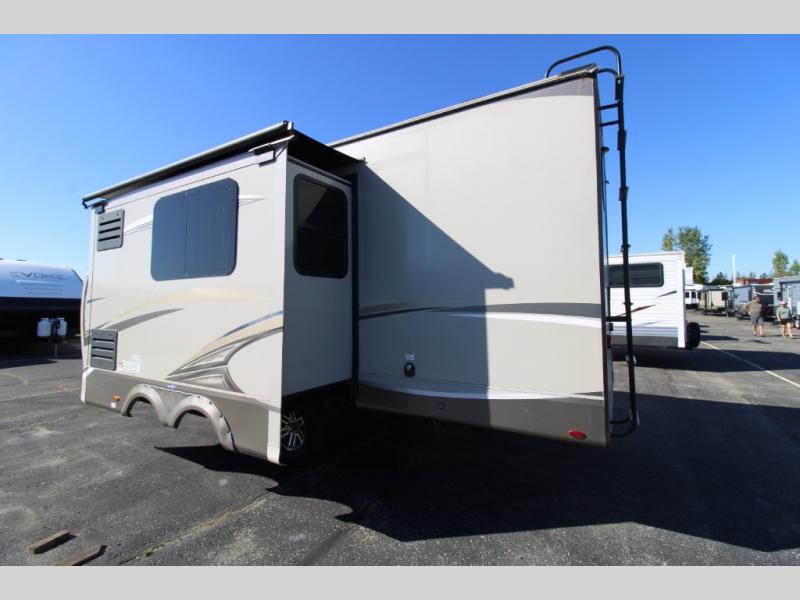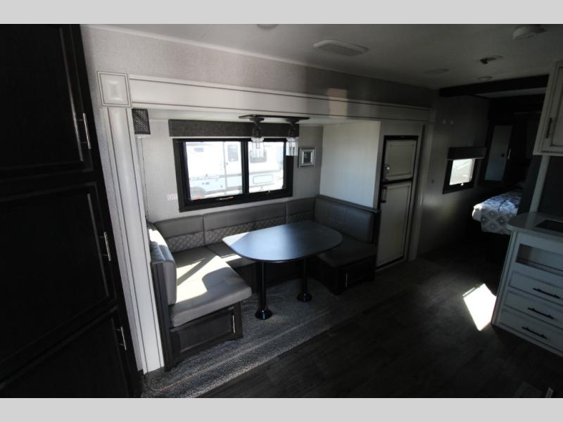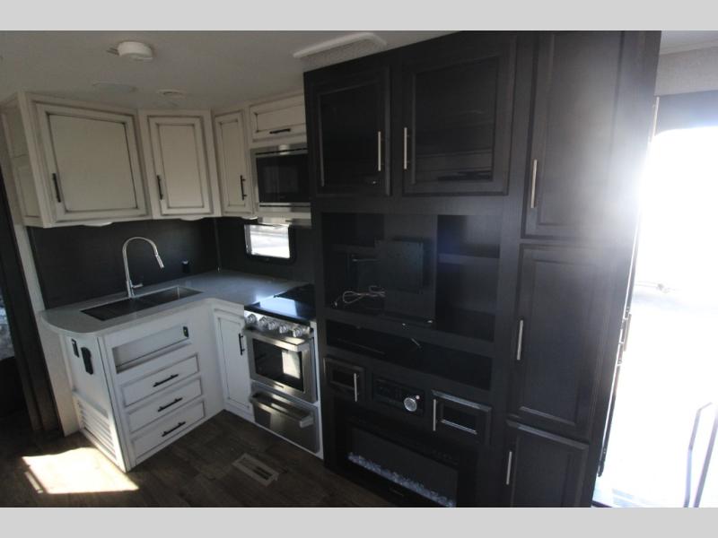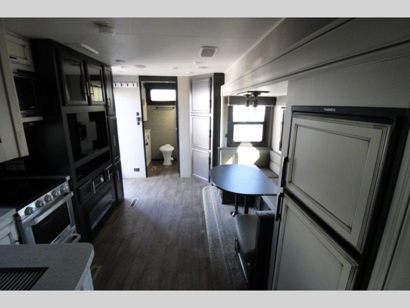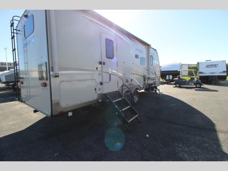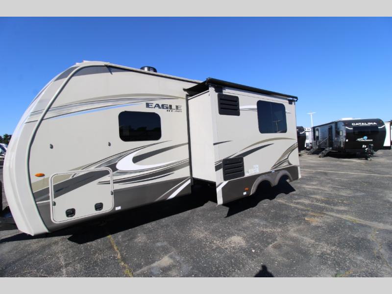 Your search is over! This rear-bathroom Eagle HT travel trailer offers a spacious vanity, 30" x 36" shower, plus linen storage to stay refreshed and ready for shopping in town or hiking the trails. You will have the choice of cooking inside at the L-shaped kitchen with stainless steel appliances, dining at the U-shaped dinette that also offers extra sleeping space, and napping in your own private bedroom with the second entry door for a smooth flow of traffic. The drop-frame chassis includes a huge pass-through storage and universal docking station. The outside kitchen allows you to cook while visiting with your camping friends, and the 17' awning gives you LED lights. You might like to add a few options, such as an exterior TV, a chaise lounge, a king bed, an LED fireplace, and/or 16" Goodyear tires.
