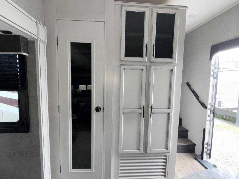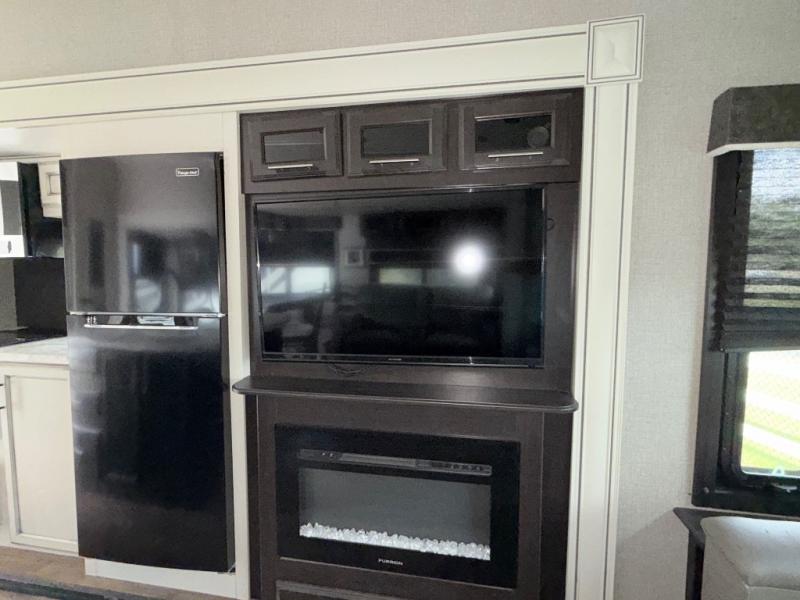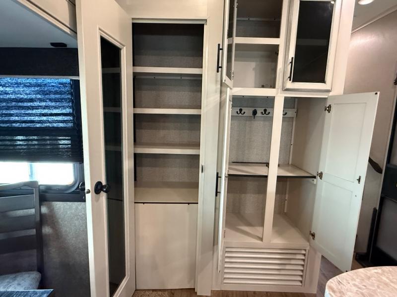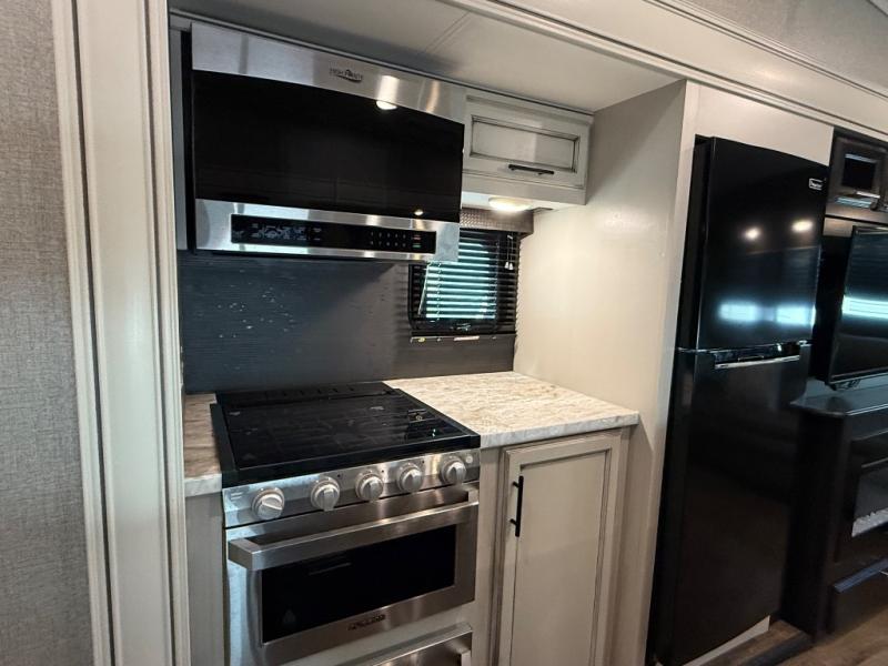 Someone in the family always loves cooking outdoors, and they can with the outside kitchen which includes a mini-fridge and hybrid grill on this Eagle HT fifth wheel. The 14' awning offers an outdoor living area and a place you can relax while your food is cooking. You can always go inside to make more food with the stainless-steel appliances, and the kitchen island gives you a great place to prepare and serve meals. When it's time to retire for the night, the carpeted bedroom is waiting with a queen bed and plenty of storage with the wardrobe slide that has a window for cross-ventilation and natural light. You might even like to add a few more options such as 16" Goodyear tires, a booth dinette, and/or theater seating.