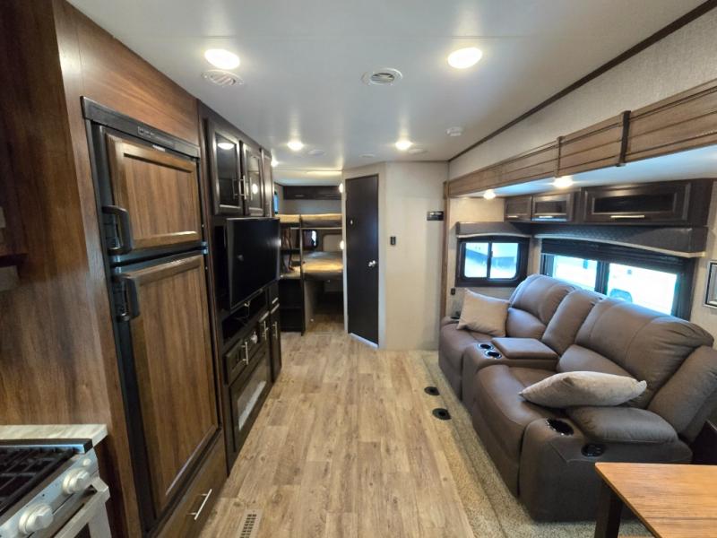 You can easily load all your clothes into the four wardrobes, store some items under the fold-up double-size bunks that support up to 600 pounds, place your dry goods into the pantry and overhead cabinets, and then add your cold items into the refrigerator for a fun camping trip with the whole family in this Eagle HT travel trailer! You get to choose to cook inside with all the stainless steel appliances or outdoors on the "Industry's Best" outside kitchen, and you can dine under the 21' electric awning or inside at the U-shaped dinette. The bathroom is conveniently located next to the bunks and main entry, and the front bedroom has the second entry door and a queen bed which makes this your oasis away from it all.