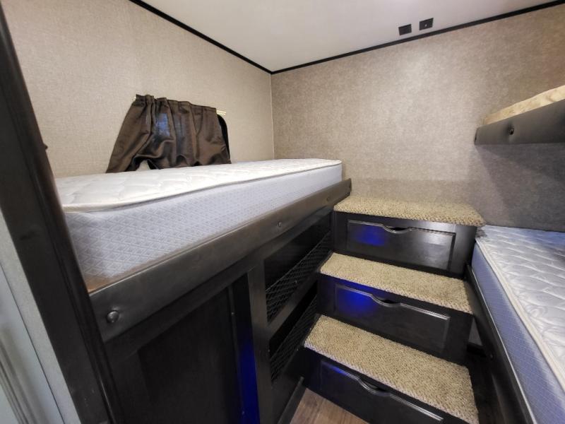 Four bunk beds make a rear bunkhouse with unique stair-step storage drawers loads of fun for the kids and their friends in this Eagle HT fifth wheel. The kids will love having their own privacy, and they can even switch bunks each night if they wish. If more family members joined you, the furniture in the main living area doubles as extra sleeping space. You will appreciate having your own privacy in the front bedroom which is quite spacious with a wardrobe slide that includes a window and linen storage for the double-entry bathroom. The kitchen offers stainless steel appliances to make any meals, plus the "Industry's Best" outside kitchen is a nice feature when you enjoy being outdoors. You also have several options you might like to include such as a 13.5 cu. ft. refrigerator, an LED fireplace below the LED HDTV, theater seating, 16" Goodyear tires, an LED fireplace, a free-standing table, and/or a party sofa.