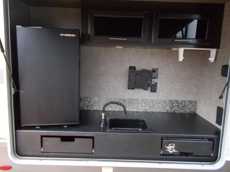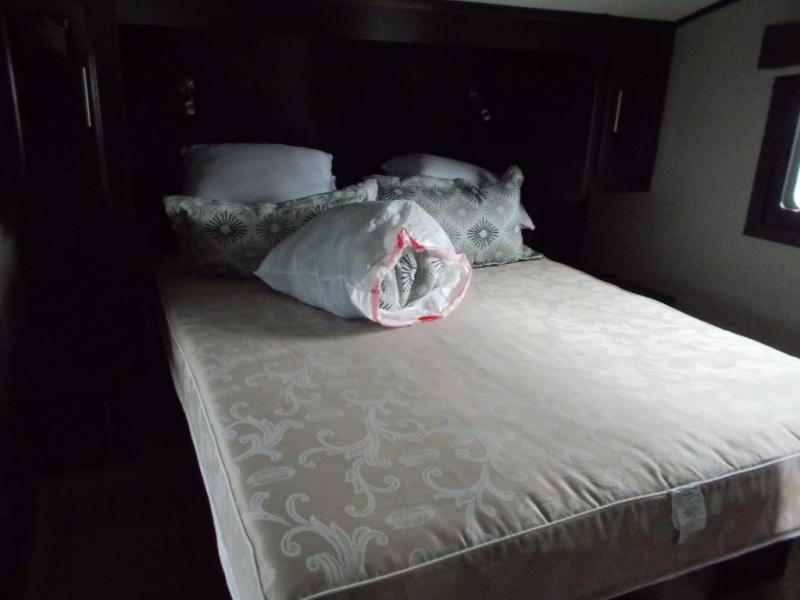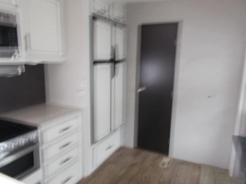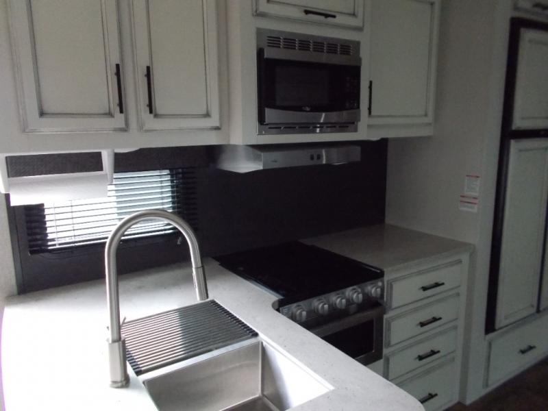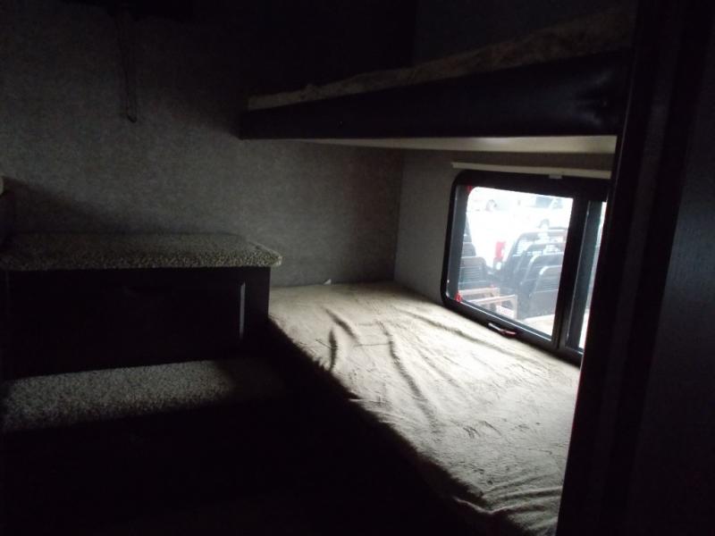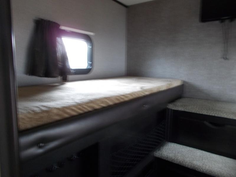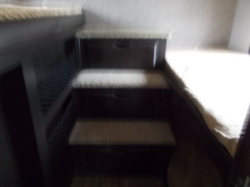 Four bunk beds make a rear bunkhouse with unique stair-step storage drawers loads of fun for the kids and their friends in this Eagle HT fifth wheel. The kids will love having their own privacy, and they can even switch bunks each night if they wish. If more family members joined you, the furniture in the main living area doubles as extra sleeping space. You will appreciate having your own privacy in the front bedroom which is quite spacious with a wardrobe slide that includes a window and linen storage for the double-entry bathroom. The kitchen offers stainless steel appliances to make any meals, plus the "Industry's Best" outside kitchen is a nice feature when you enjoy being outdoors. You also have several options you might like to include such as a 13.5 cu. ft. refrigerator, an LED fireplace below the LED HDTV, theater seating, 16" Goodyear tires, an LED fireplace, a free-standing table, and/or a party sofa.