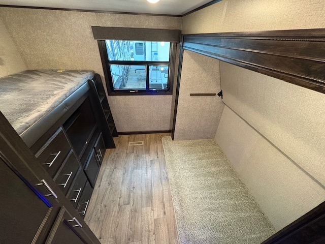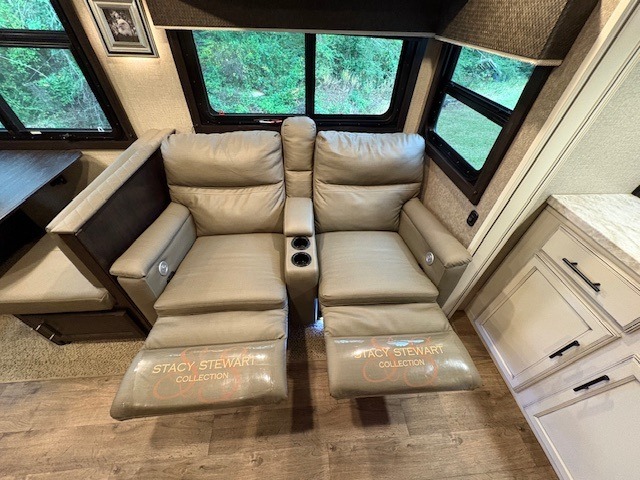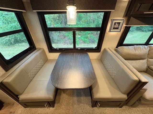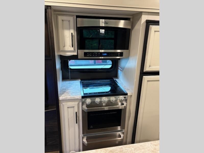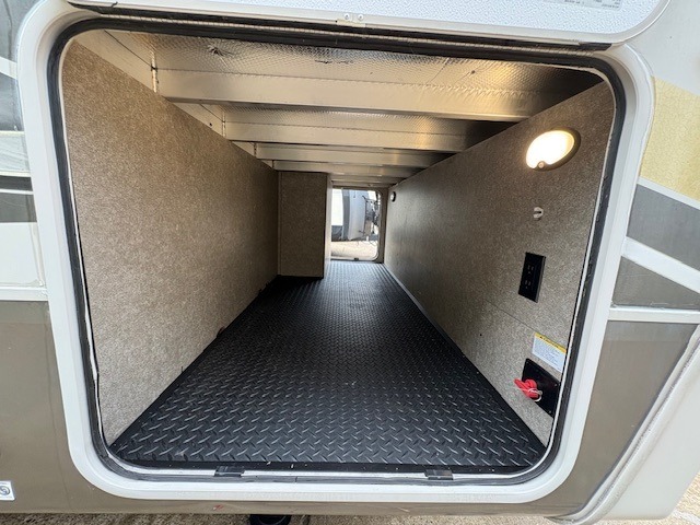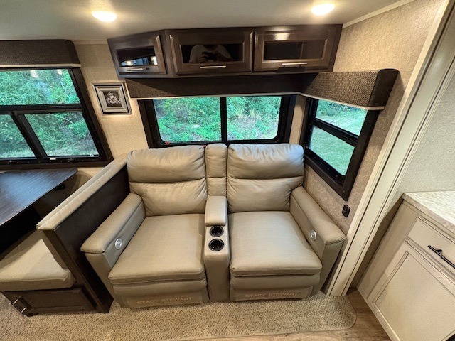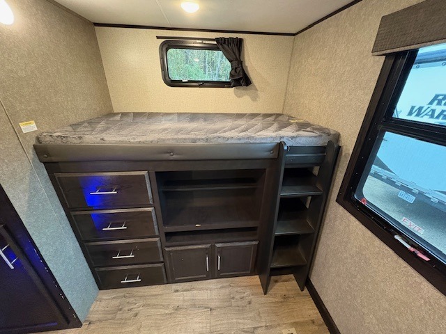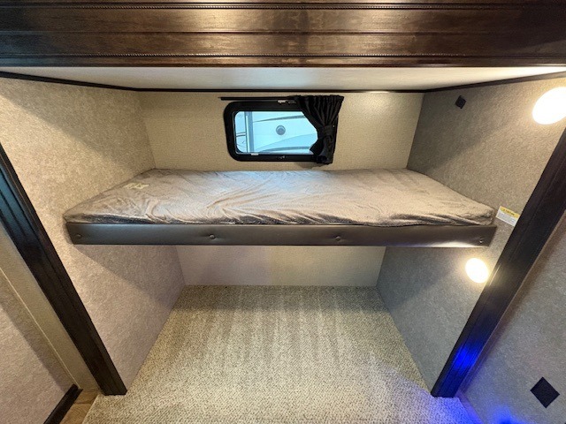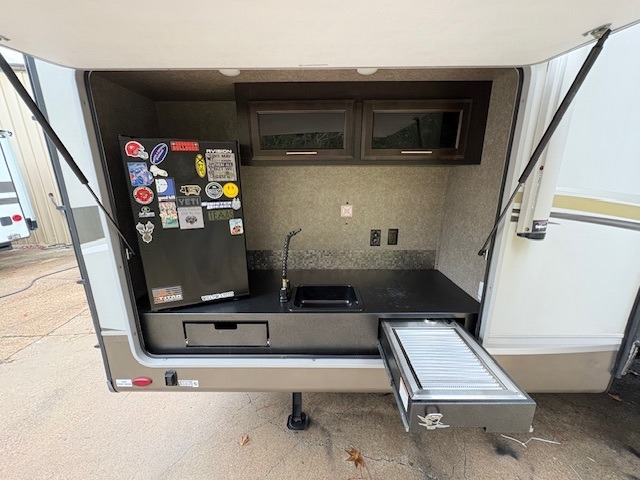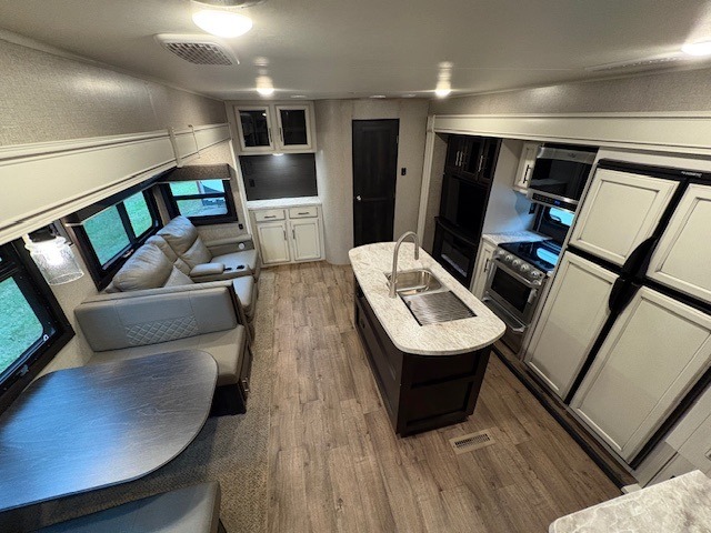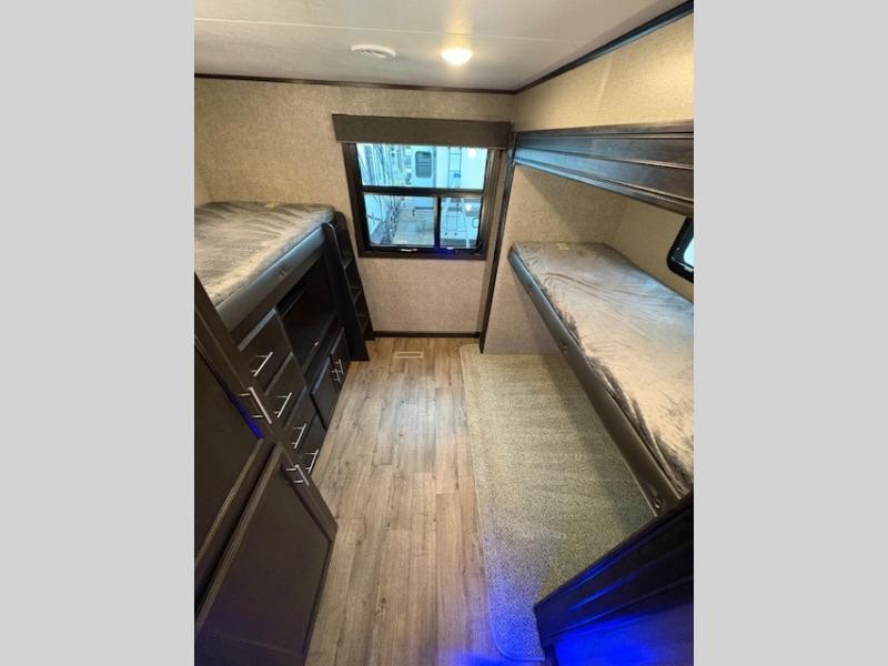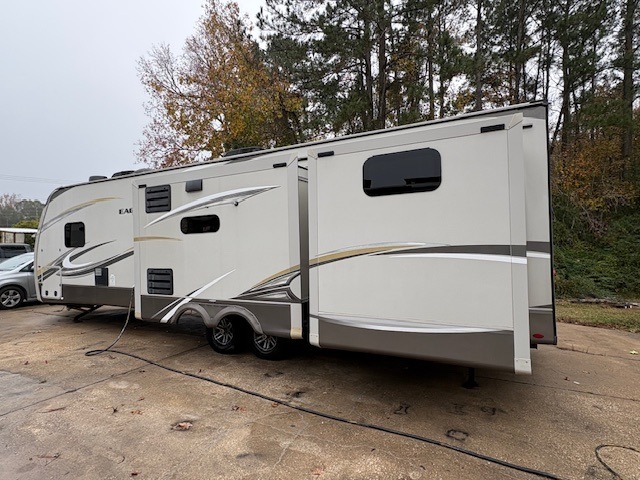The drop-frame chassis on this Eagle HT travel trailer includes a huge pass-through storage and universal docking station allowing you to pack fishing poles, camping chairs and such, plus there is a rear bunkhouse that will allow the kids to have some privacy while they relax on the tri-fold sofa or bunk beds. The chef can decide to make meals in the full kitchen with stainless steel appliances or outdoors on the outside kitchen. The 21' awning includes LED lights allowing you to stay outside into the evening. You might like to add a few options such a free-standing table in place of the booth dinette, a king bed in place of the queen bed, a washer and dryer, an LED fireplace, and even a party sofa instead of the tri-fold sofa.
