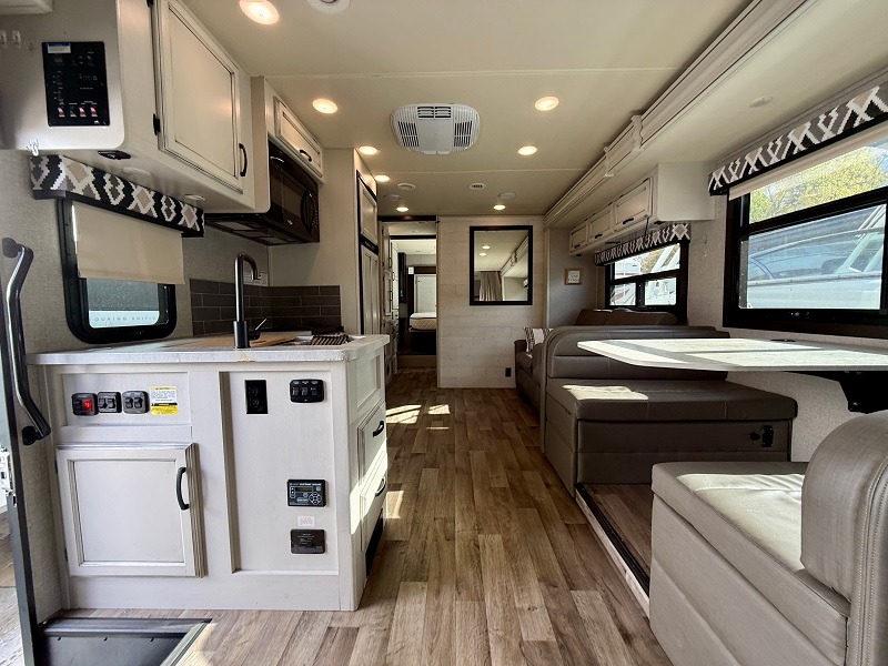 Start any road trip with this Class C gas motorhome. You will love all of the at-home features throughout from the rear queen bed slide out and dresser in the private bedroom, and the split bath's location and convenience to the entertainment center including a 50" TV in the main living area. You can relax on the tri-fold sofa, dine at the booth dinette, and sleep on these furnishings once folded down. The cab-over bunk offers the kids a fun place to sleep. Take a look today and start your next road trip tomorrow!