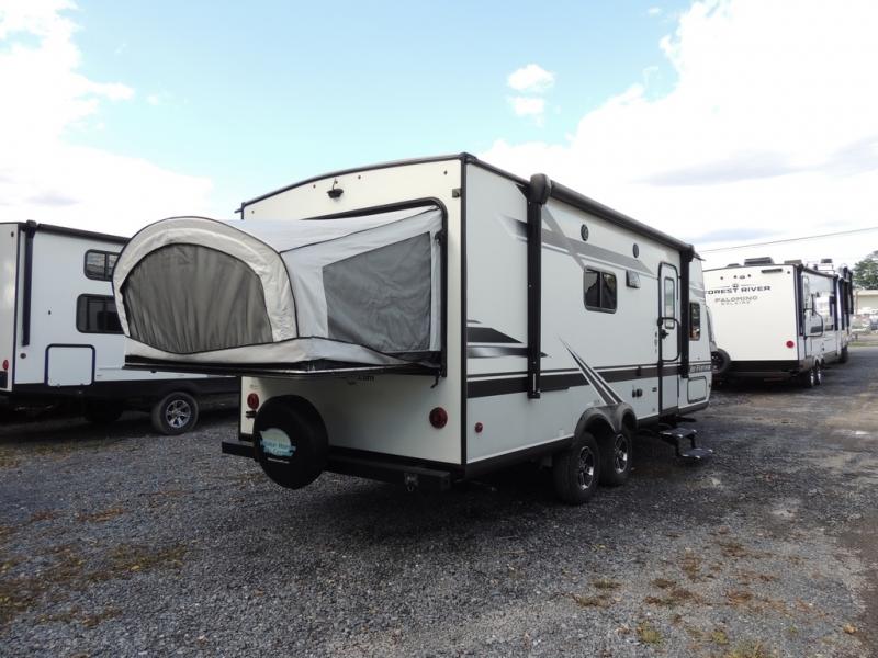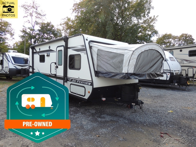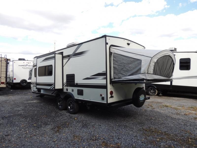 The Jayco Jay Feather hybrid expandable offers an aerodynamic, rounded front profile with a diamond plate, a modern retro graphics package with a two-colored sidewall, Stronghold VBL vacuum-boned, laminated floor, side, rear and front walls on an American-made Norco frame with integrated A-frame. You will appreciate the water-repellent, scratch resistant Jayco DuraTek vinyl tent material with zipper windows and permanently attached tent-to-bed base design. Inside you will find smoked glass decorative inserts in select overhead cabinets, ball-bearing drawer glides, Jayco exclusive teddy bear "soft-touch" residential-style bed mats, and more! Choose your favorite floorplan, and start a new adventure!