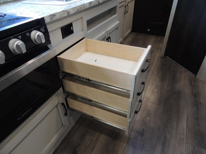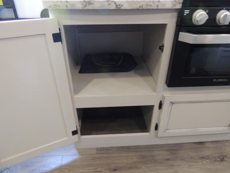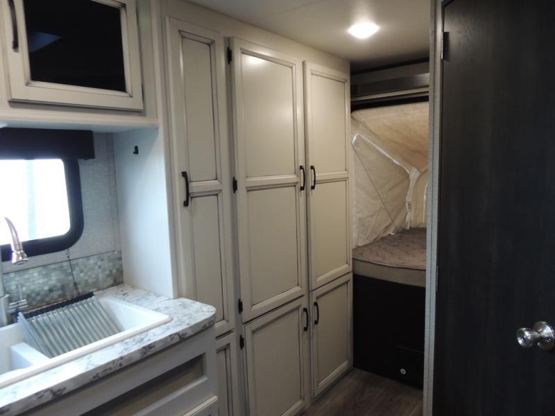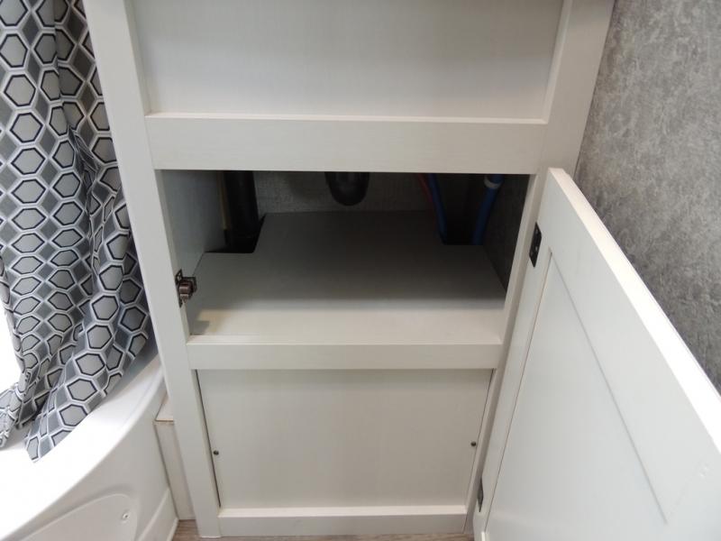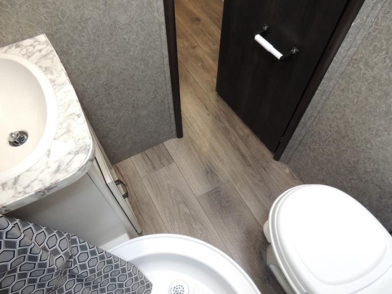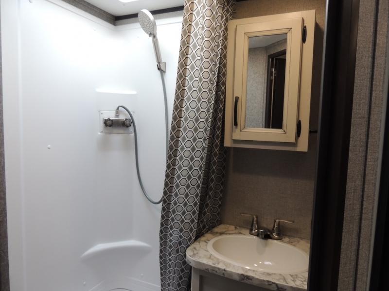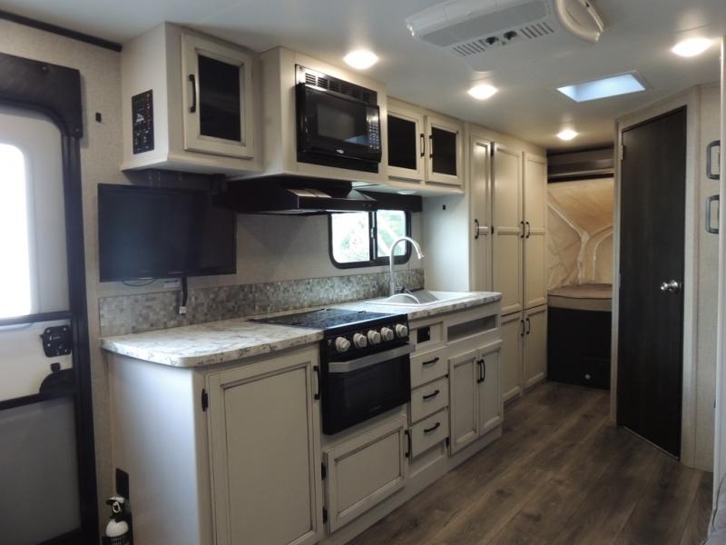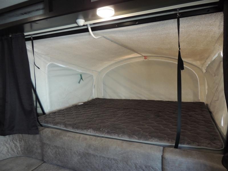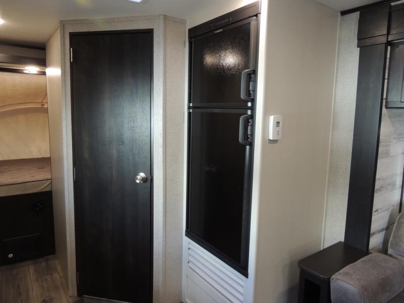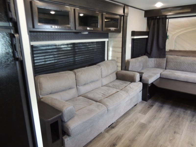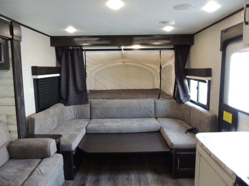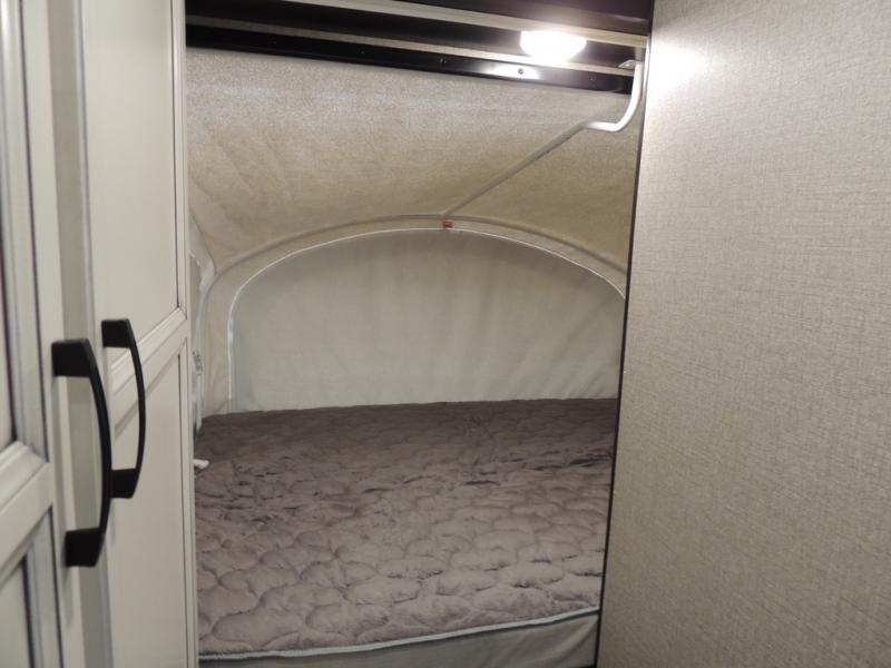 The whole family can enjoy dinner together around the U-shaped dinette and play a board game before preparing this space for two people to sleep. The sofa slide out also doubles as sleeping space, and the two tent end beds offer plenty of room for four more family members, and each bed offers a privacy curtain and overhead storage. You will be able to cook in the kitchen area and store leftovers in the fridge, get cleaned up in the full bathroom, and choose to be inside whenever you like. You will soon find out that the 13' power awning with LED lights provides an outdoor living area, the storage along the exterior gives you space for outdoor gear, and the aluminum-tread entry steps help when the campsite isn't so flat.
