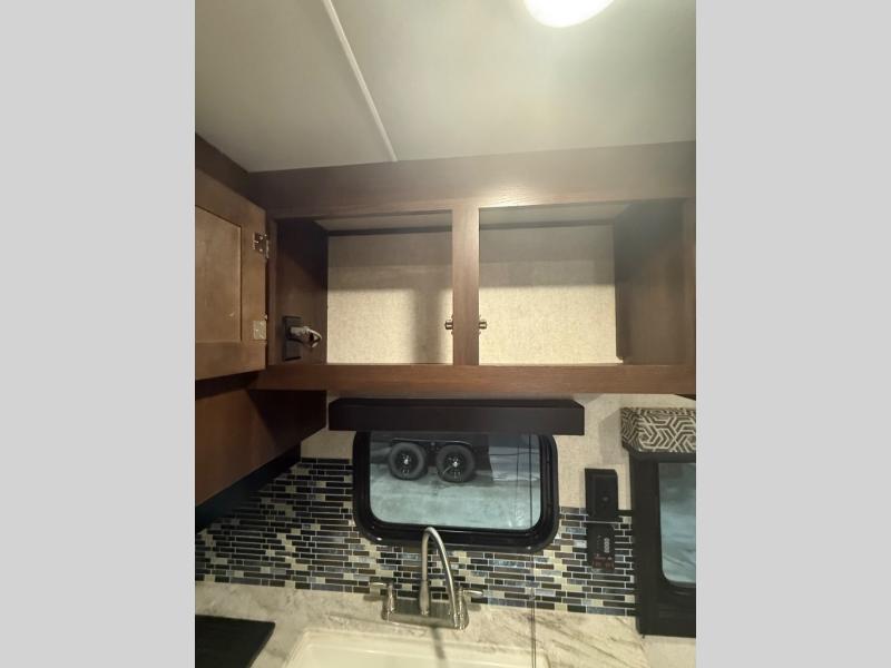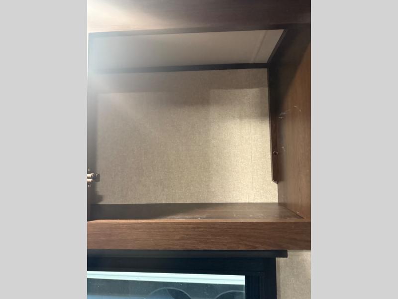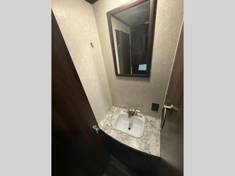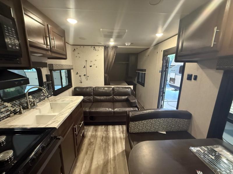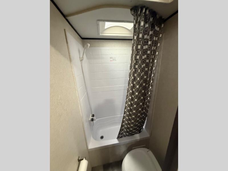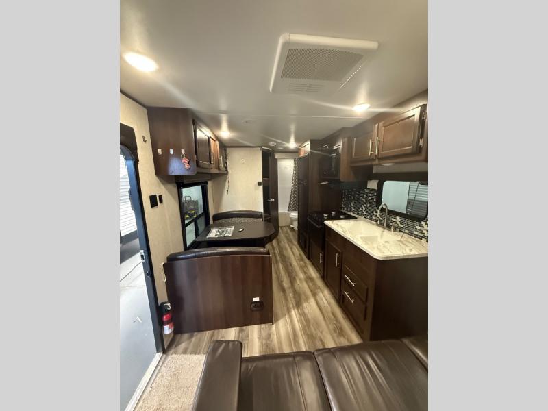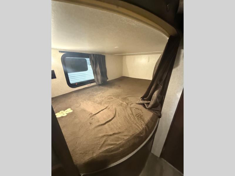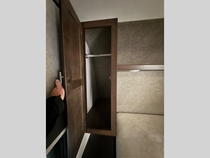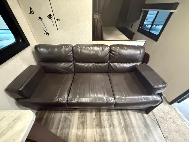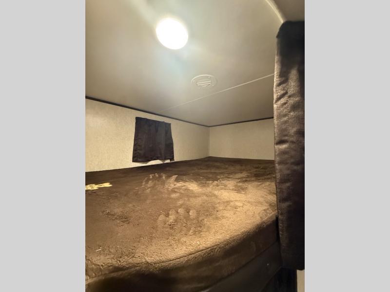 The kids are ready, are you! The double size bunks have been claimed by the kids and their friends, while you get to enjoy your own walk-around queen Serta mattress, dual solid wood cabinet wardrobes and a shelf above the bed for your personal items. You can close the curtain for privacy as the kids have that same choice with the bunks. There is a sofa and booth dinette for inside seating, and outside you can grab your camp chairs from the pass-through compartment to relax under the power awning during the day or at night thanks to the LED lights. And the full kitchen, plus the private tub/shower and toilet room allow you to make meals and stay clean as long as you plan to stay.