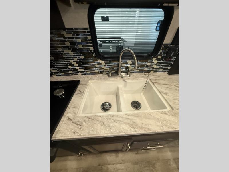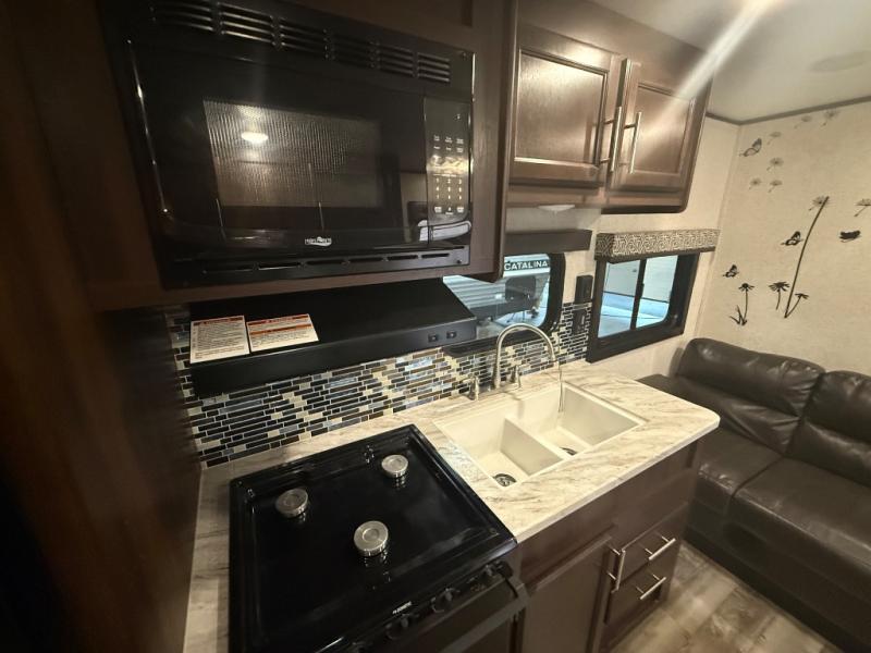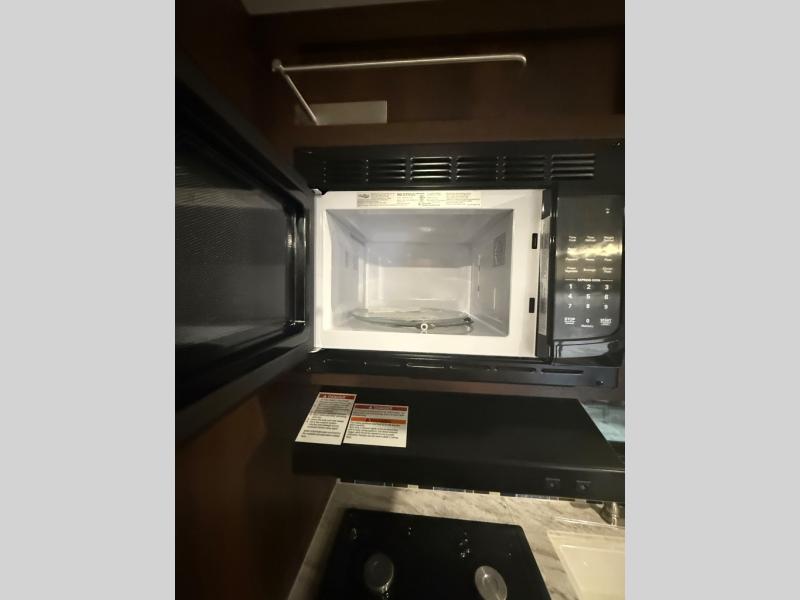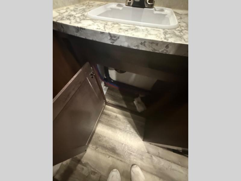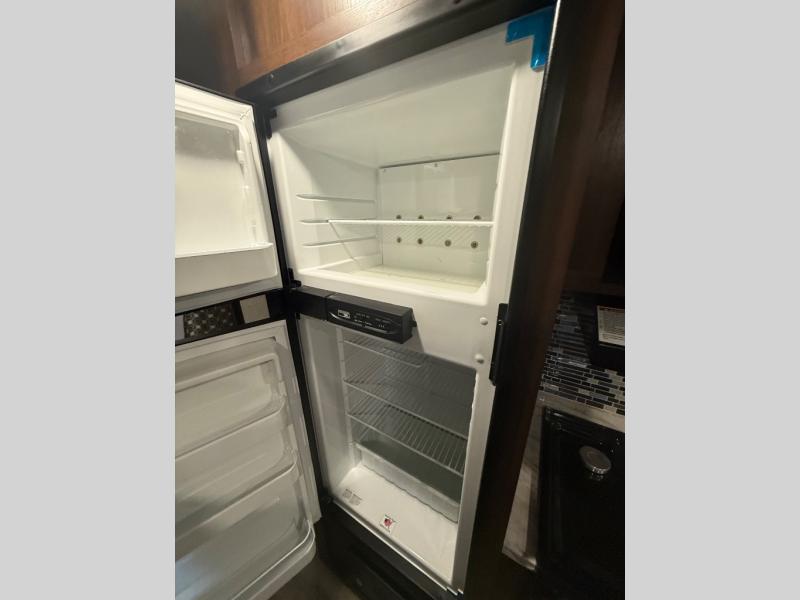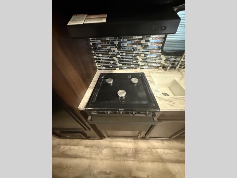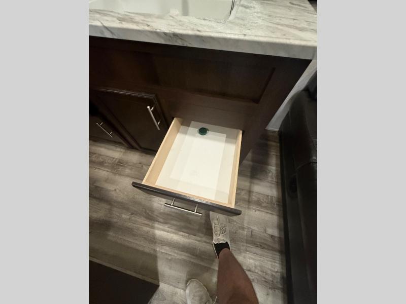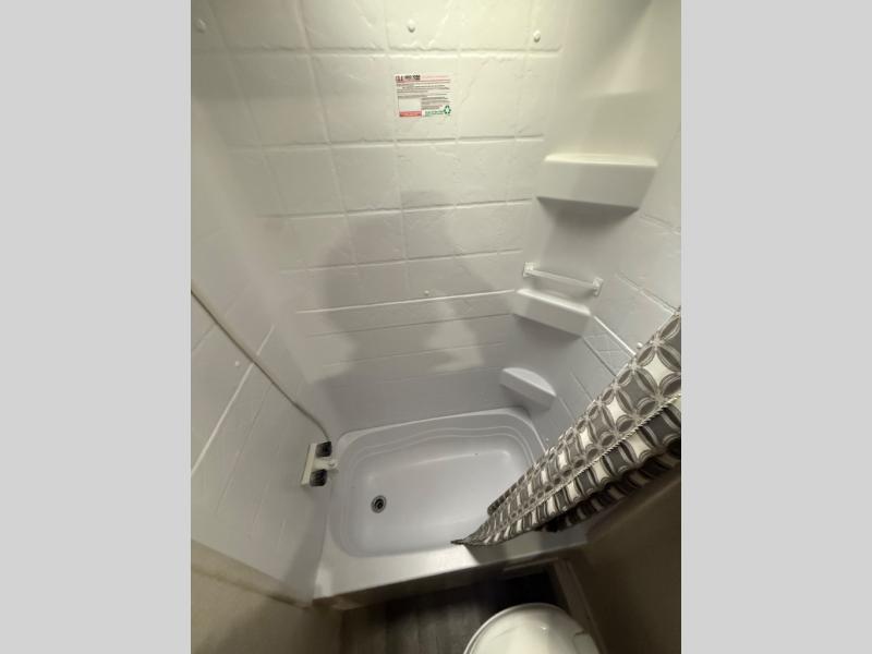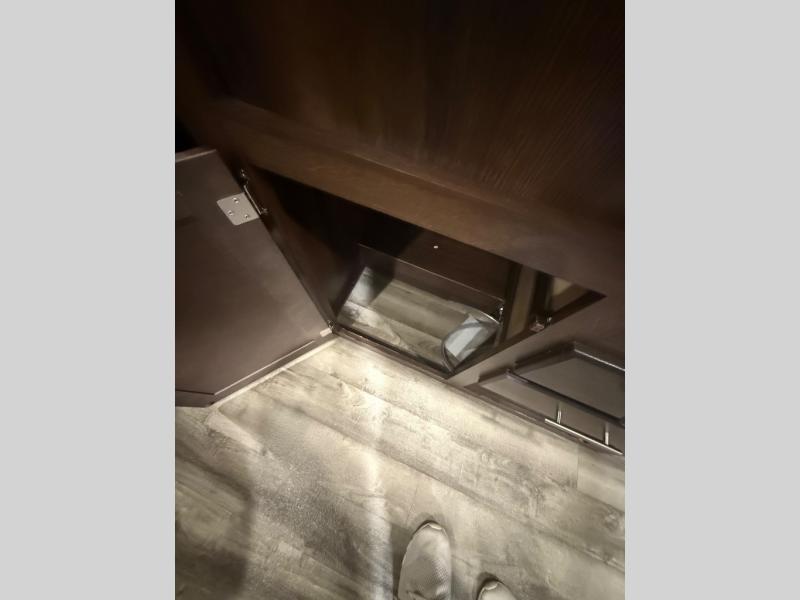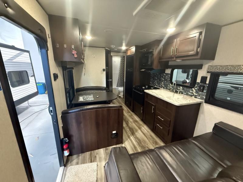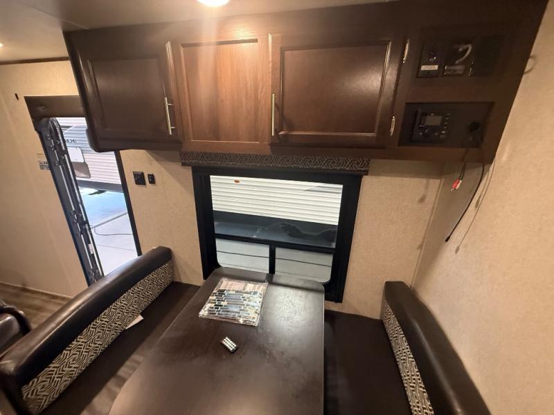 The kids are ready, are you! The double size bunks have been claimed by the kids and their friends, while you get to enjoy your own walk-around queen Serta mattress, dual solid wood cabinet wardrobes and a shelf above the bed for your personal items. You can close the curtain for privacy as the kids have that same choice with the bunks. There is a sofa and booth dinette for inside seating, and outside you can grab your camp chairs from the pass-through compartment to relax under the power awning during the day or at night thanks to the LED lights. And the full kitchen, plus the private tub/shower and toilet room allow you to make meals and stay clean as long as you plan to stay.