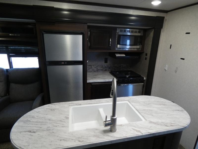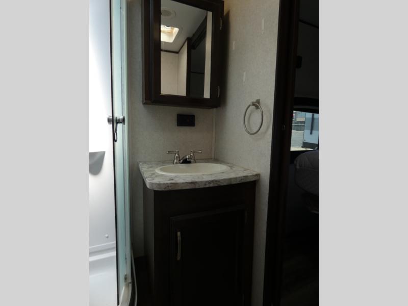This fabulous Jay Flight travel trailer comes with large opposing slides to create extra interior living space! Because of that added space, you'll find a kitchen island which will make it easy to prep dinner or wash dishes afterwards. Another fabulous addition is the master suite up front that has its own private entrance into the bathroom, and since there is a skylight above the radius shower, you'll have more head space while you get clean.