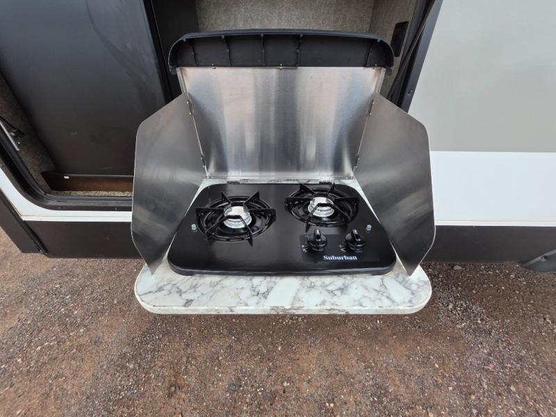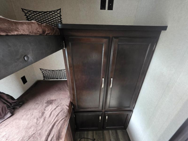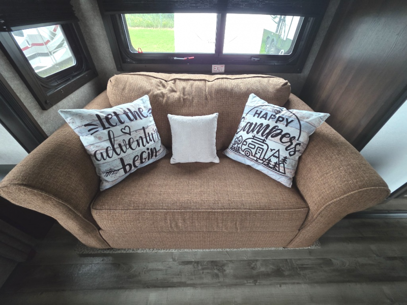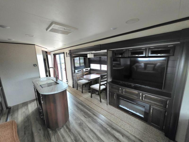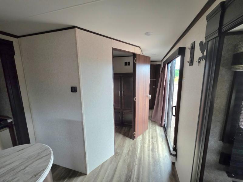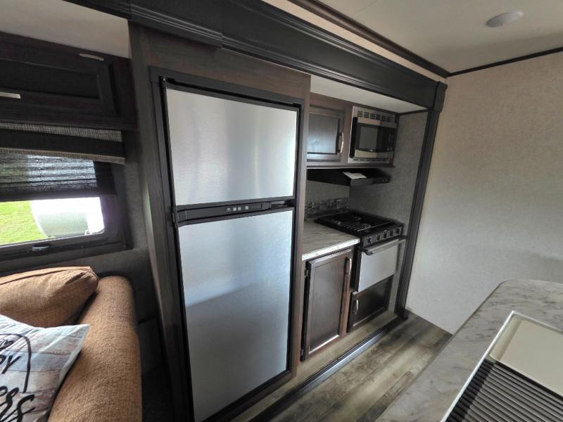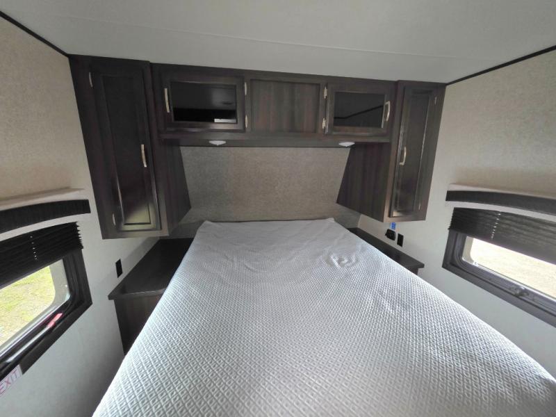 With its stainless steel appliances, island, and residential faucet with pull-out sprayer in the kitchen, you will love spending your time cooking up a delicious dinner in this Jay Flight travel trailer! You also have the choice to prepare dinner outside because of the outdoor kitchen that has been included, and if you want to eat inside so that you are protected from unwanted bugs, you can sit down at the free-standing table to enjoy your meal. Plus, at the end of a long and tiresome day, nothing will feel better than retiring to your own private master suite.