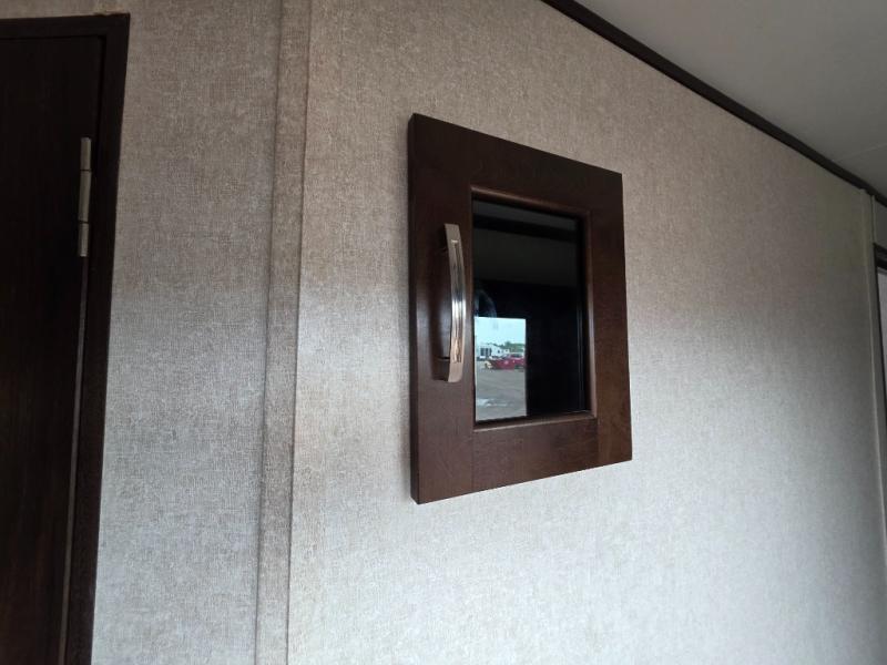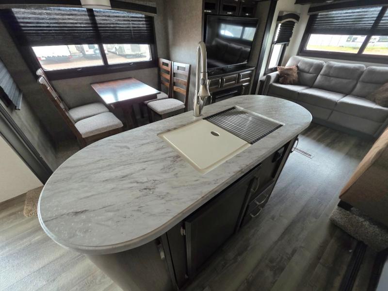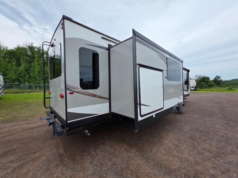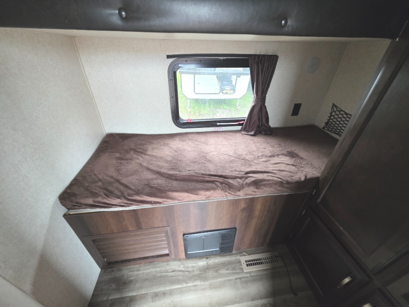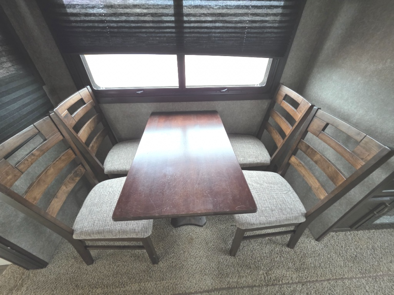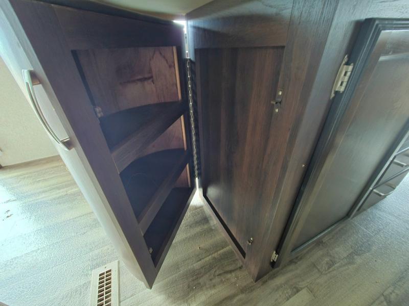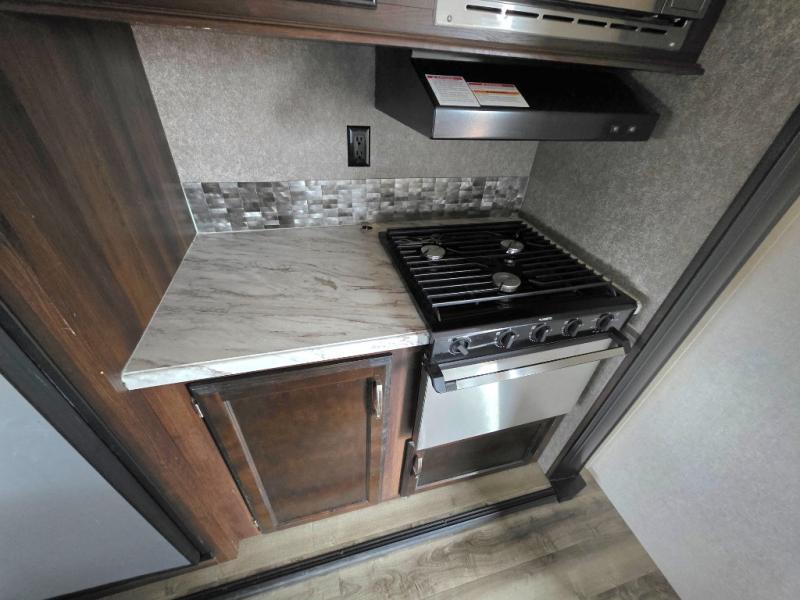 With its stainless steel appliances, island, and residential faucet with pull-out sprayer in the kitchen, you will love spending your time cooking up a delicious dinner in this Jay Flight travel trailer! You also have the choice to prepare dinner outside because of the outdoor kitchen that has been included, and if you want to eat inside so that you are protected from unwanted bugs, you can sit down at the free-standing table to enjoy your meal. Plus, at the end of a long and tiresome day, nothing will feel better than retiring to your own private master suite.