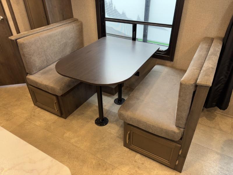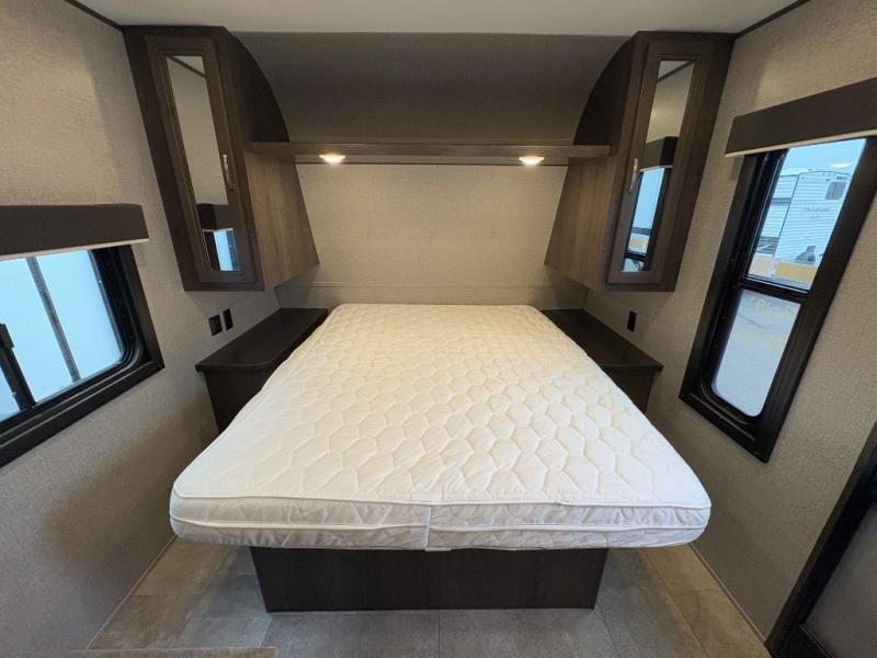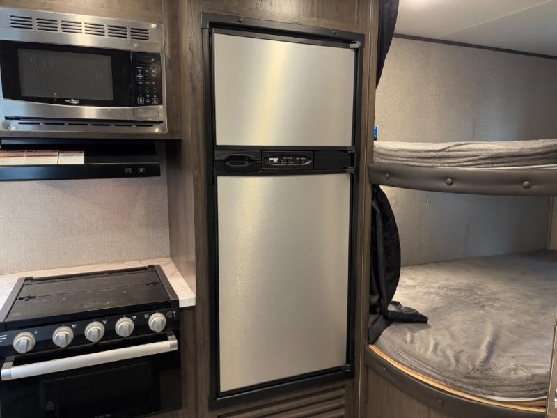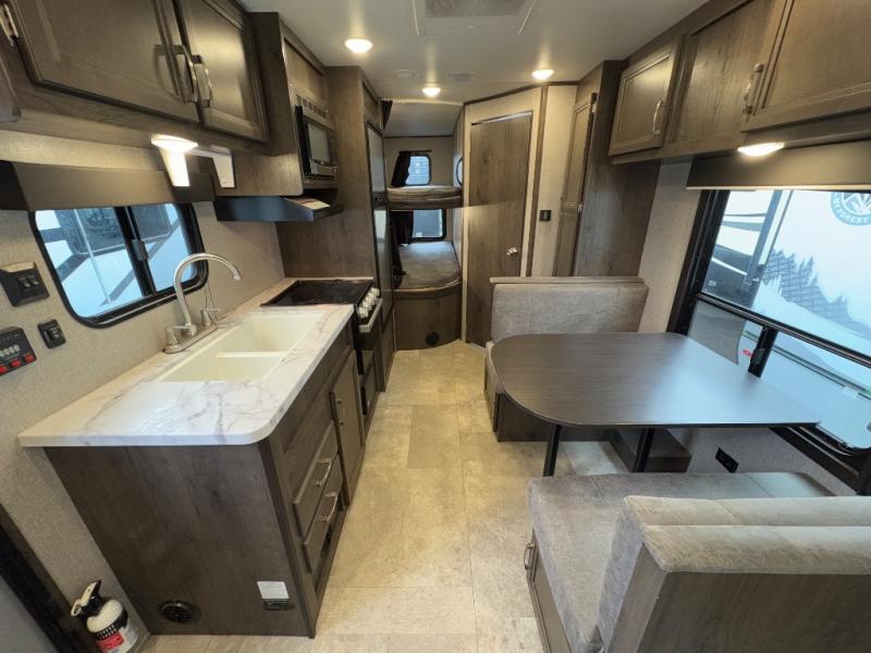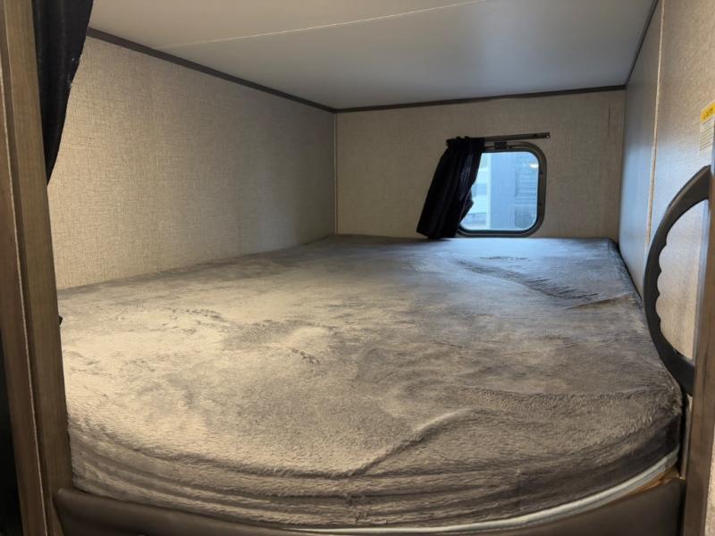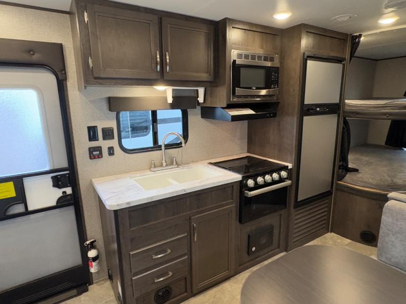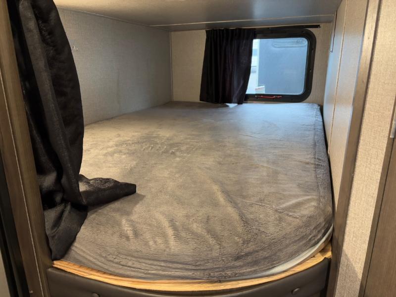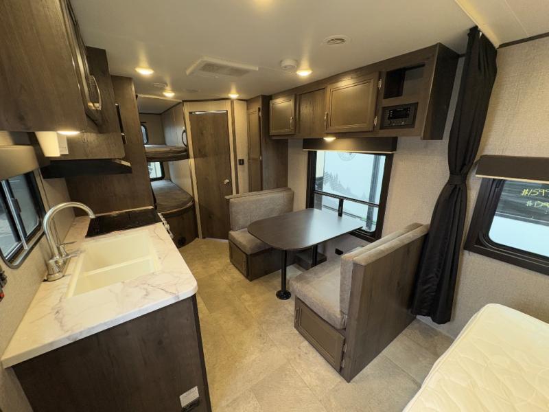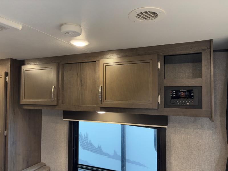 Relax and listen to the music under the 13' power awning with LED lights and speakers while the cook makes a meal on the outside kitchen. You can even grab a drink from the outdoor fridge. When you are ready for some air conditioning, the booth dinette will be a great place to play cards and visit. At night, the kids will love the double size bunks beds and you will appreciate having your own walk-around queen bed with large shelving above to place your things, and solid wood cabinets on each side for your clothing, and a curtain to close for privacy when changing clothes.