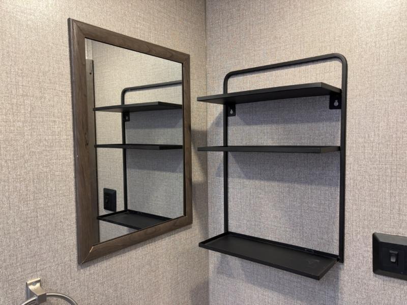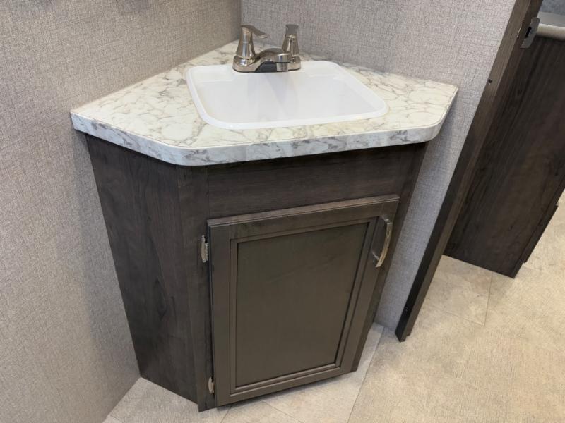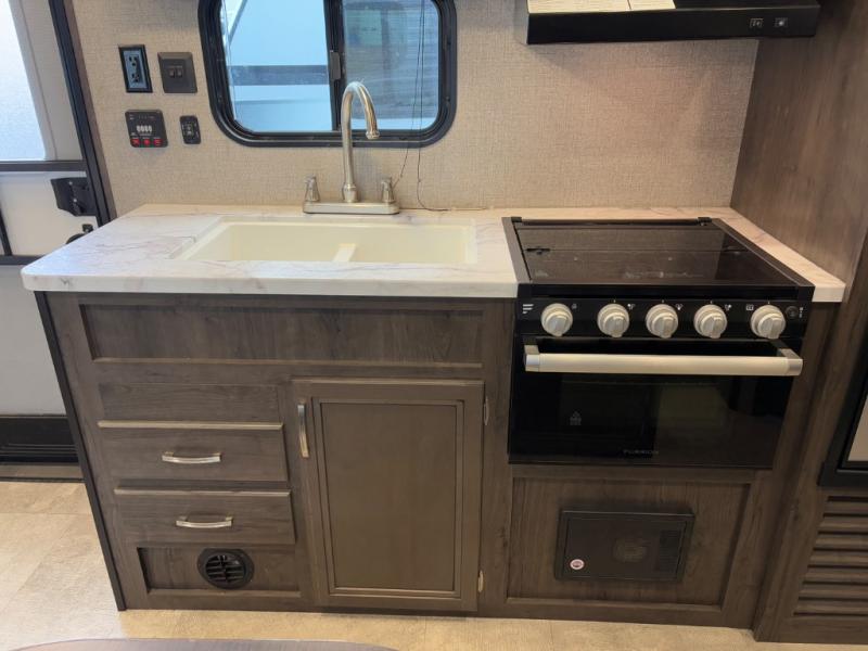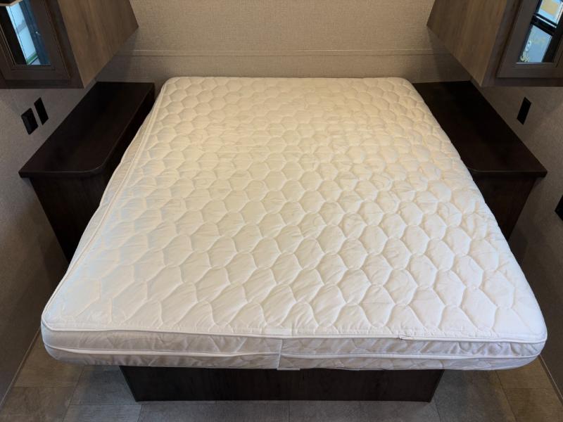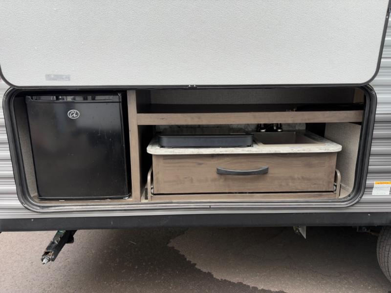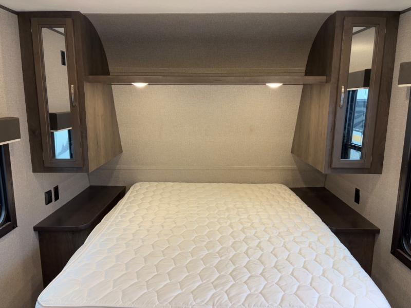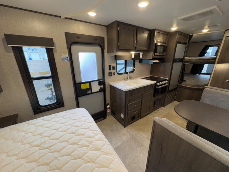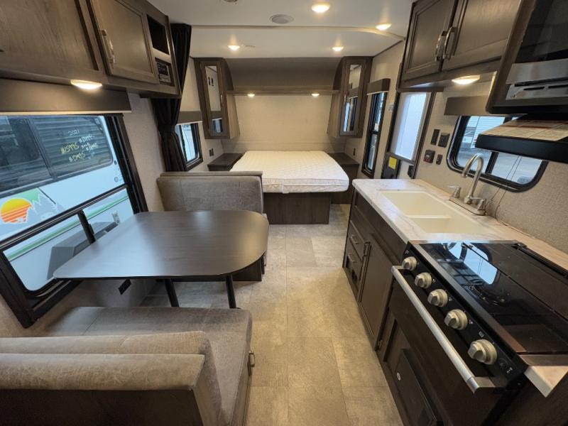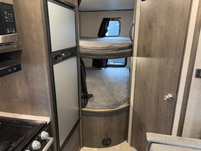 Relax and listen to the music under the 13' power awning with LED lights and speakers while the cook makes a meal on the outside kitchen. You can even grab a drink from the outdoor fridge. When you are ready for some air conditioning, the booth dinette will be a great place to play cards and visit. At night, the kids will love the double size bunks beds and you will appreciate having your own walk-around queen bed with large shelving above to place your things, and solid wood cabinets on each side for your clothing, and a curtain to close for privacy when changing clothes.