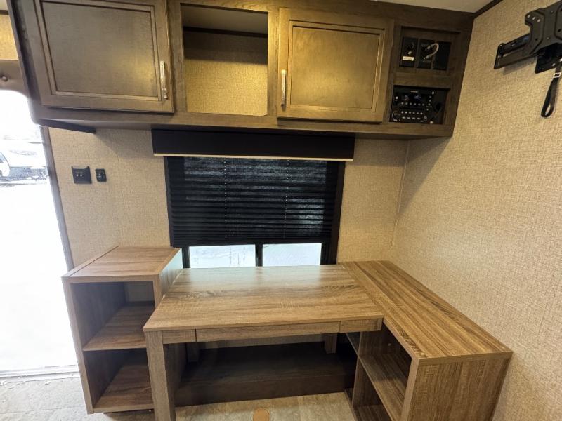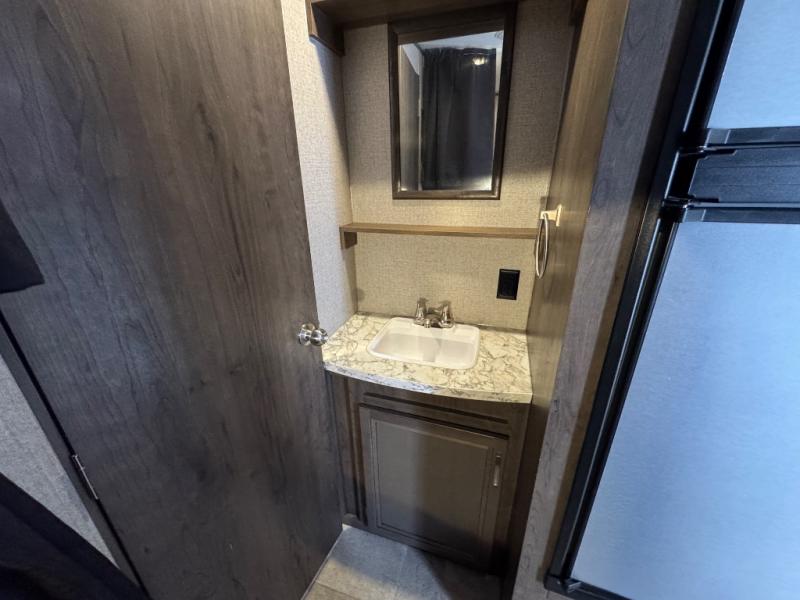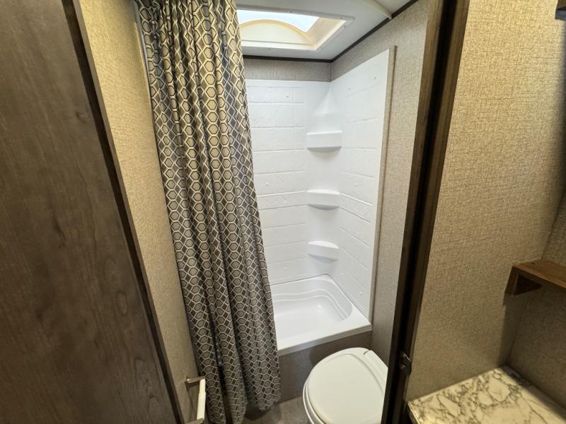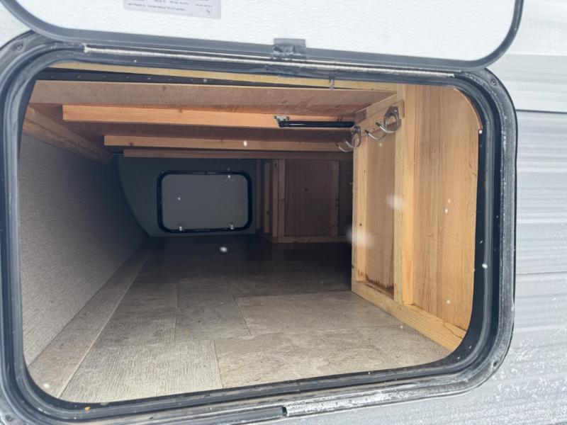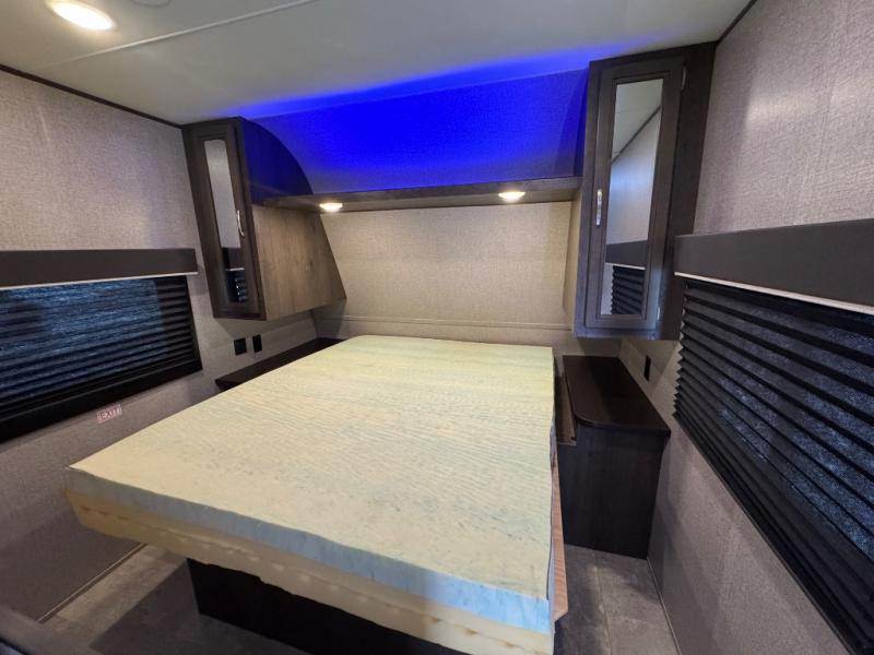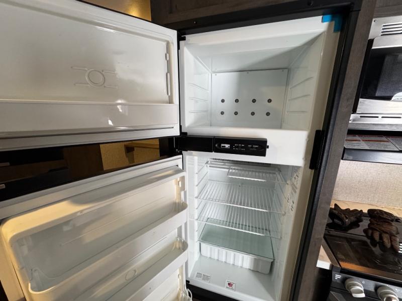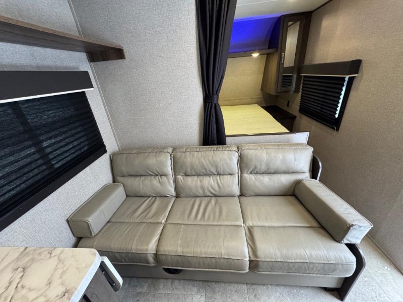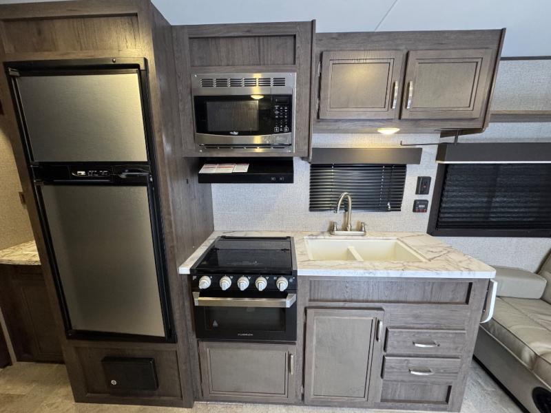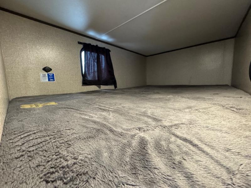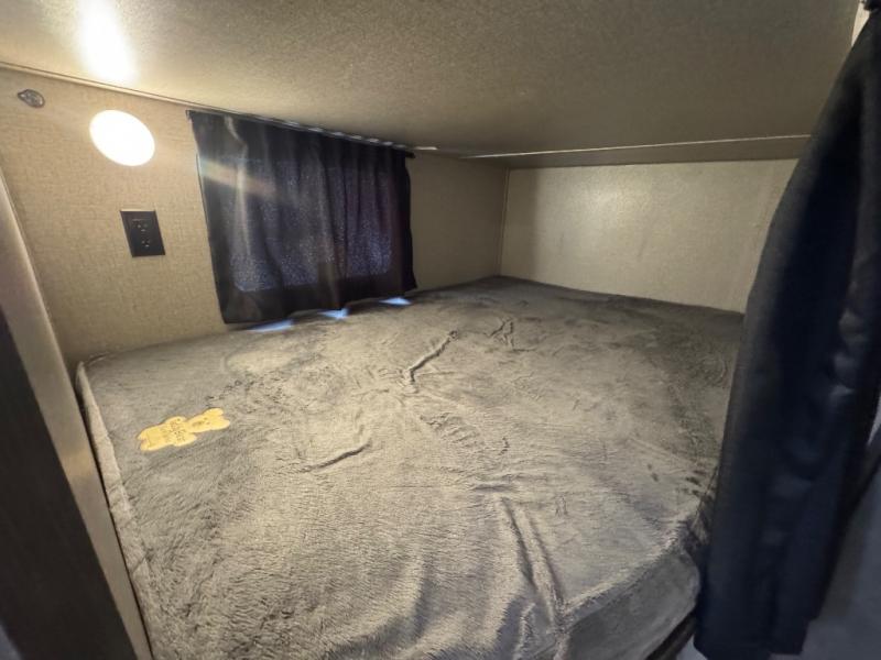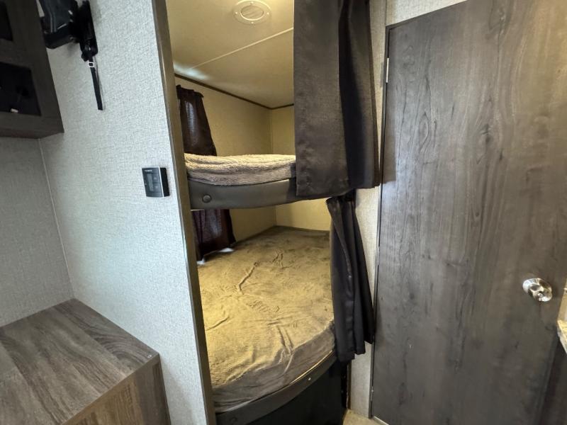 The kids are ready, are you! The double size bunks have been claimed by the kids and their friends, while you get to enjoy your own walk-around queen Serta mattress, dual solid wood cabinet wardrobes and a shelf above the bed for your personal items. You can close the curtain for privacy as the kids have that same choice with the bunks. There is a sofa and booth dinette for inside seating, and outside you can grab your camp chairs from the pass-through compartment to relax under the power awning during the day or at night thanks to the LED lights. And the full kitchen, plus the private tub/shower and toilet room allow you to make meals and stay clean as long as you plan to stay.