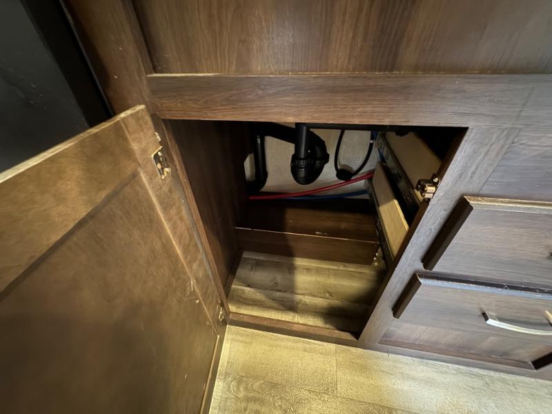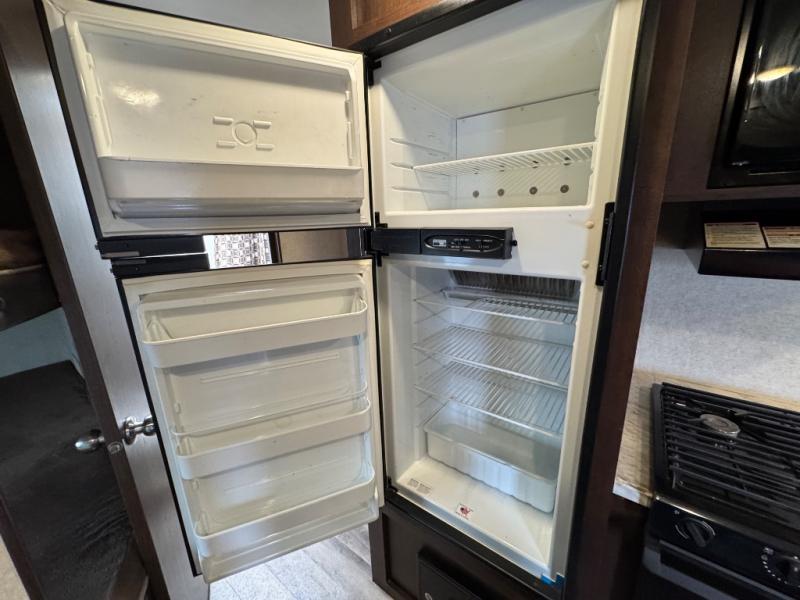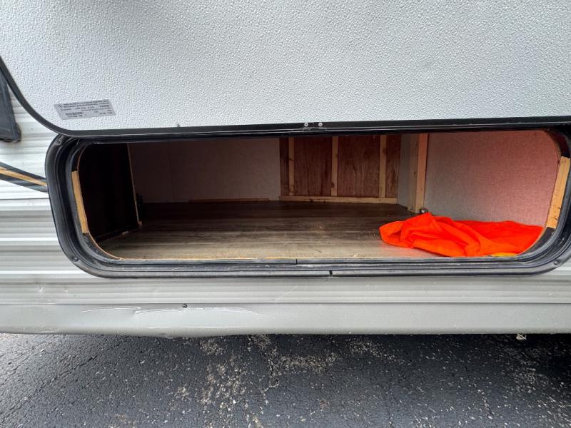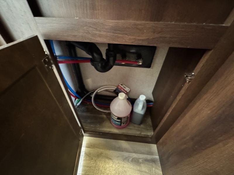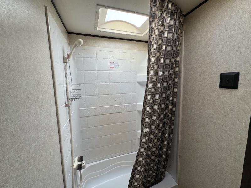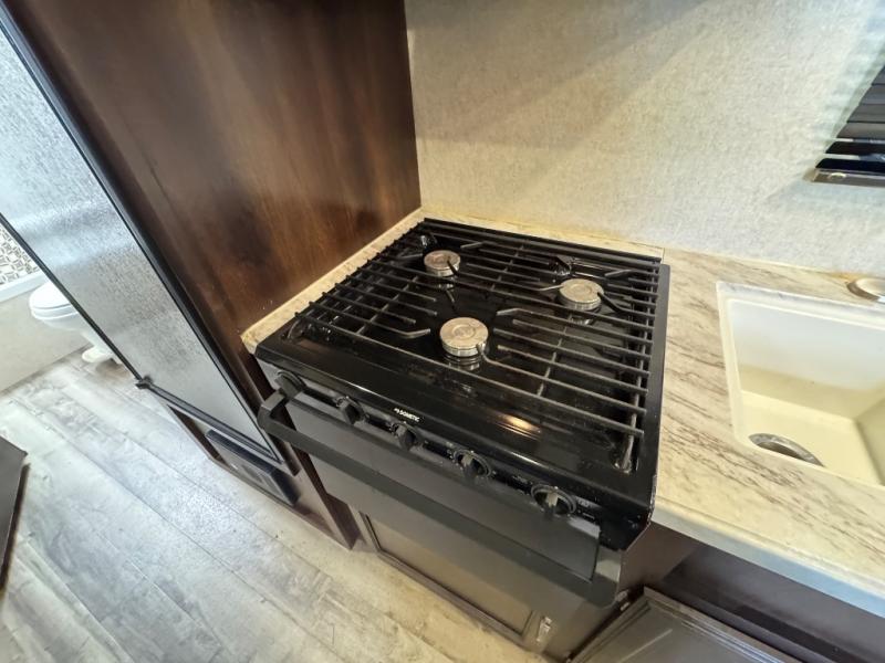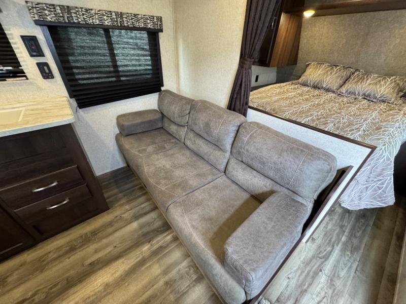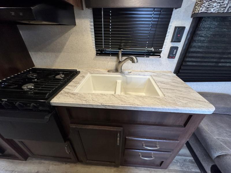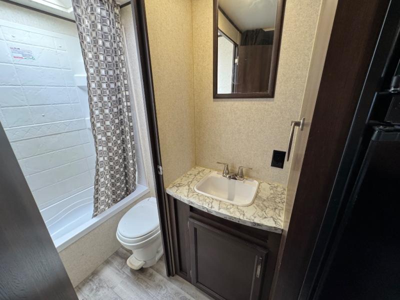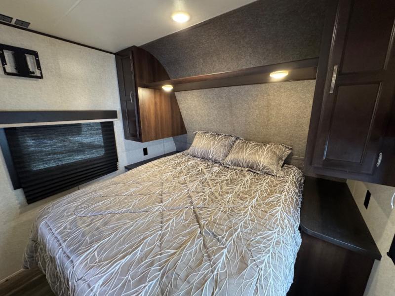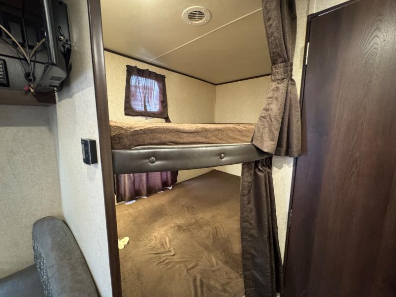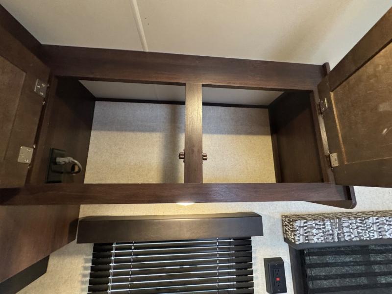 The kids are ready, are you! The double size bunks have been claimed by the kids and their friends, while you get to enjoy your own walk-around queen Serta mattress, dual solid wood cabinet wardrobes and a shelf above the bed for your personal items. You can close the curtain for privacy as the kids have that same choice with the bunks. There is a sofa and booth dinette for inside seating, and outside you can grab your camp chairs from the pass-through compartment to relax under the power awning during the day or at night thanks to the LED lights. And the full kitchen, plus the private tub/shower and toilet room allow you to make meals and stay clean as long as you plan to stay.