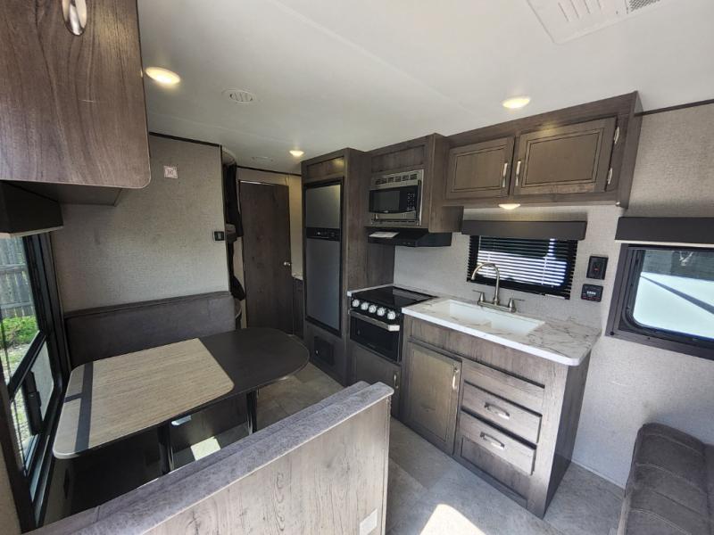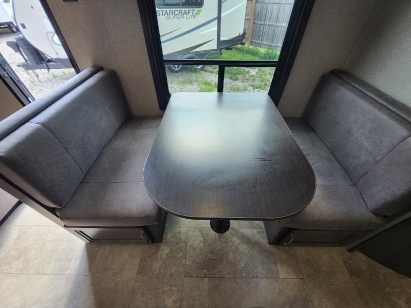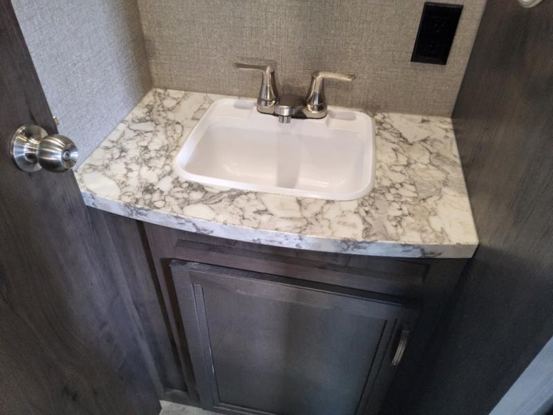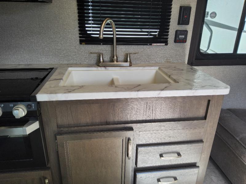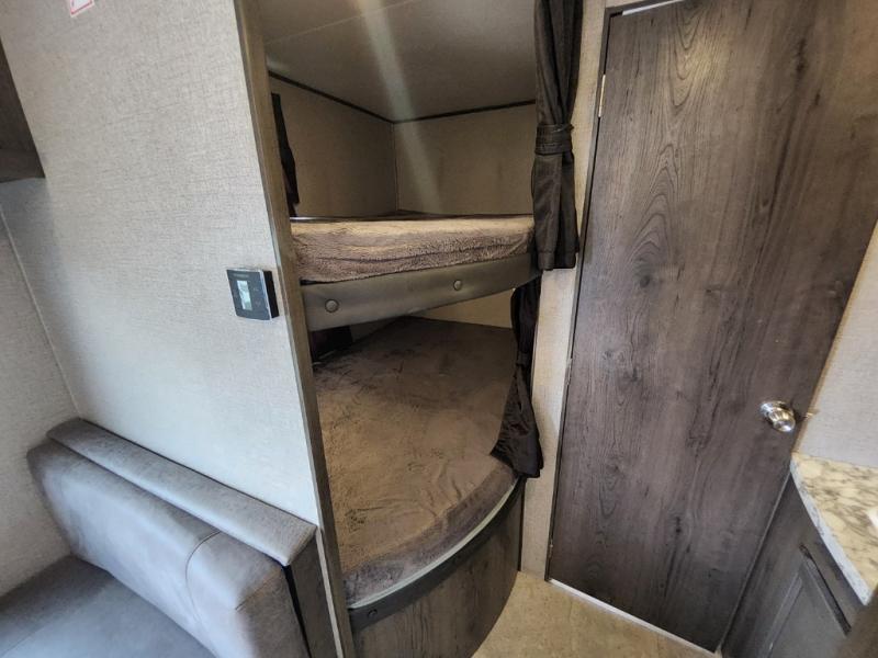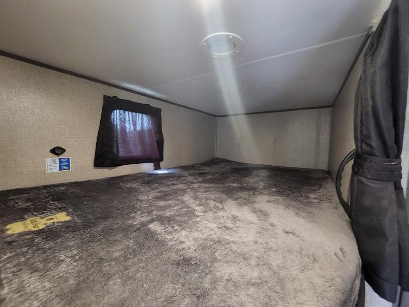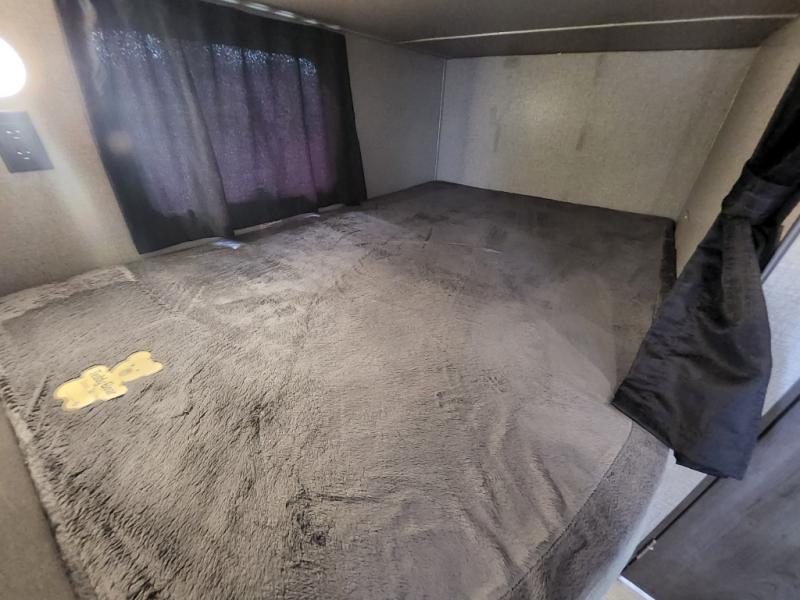 The kids are ready, are you! The double size bunks have been claimed by the kids and their friends, while you get to enjoy your own walk-around queen Serta mattress, dual solid wood cabinet wardrobes and a shelf above the bed for your personal items. You can close the curtain for privacy as the kids have that same choice with the bunks. There is a sofa and booth dinette for inside seating, and outside you can grab your camp chairs from the pass-through compartment to relax under the power awning during the day or at night thanks to the LED lights. And the full kitchen, plus the private tub/shower and toilet room allow you to make meals and stay clean as long as you plan to stay.