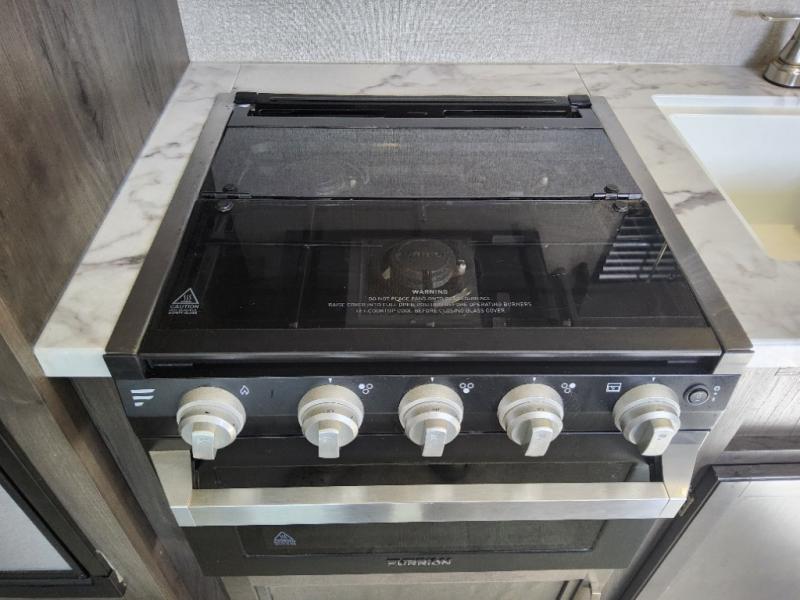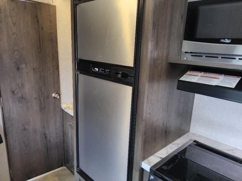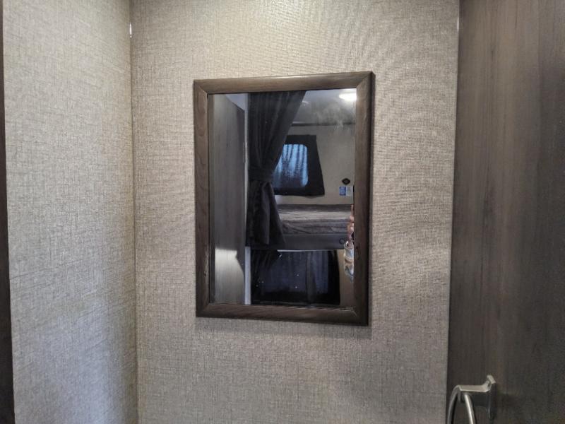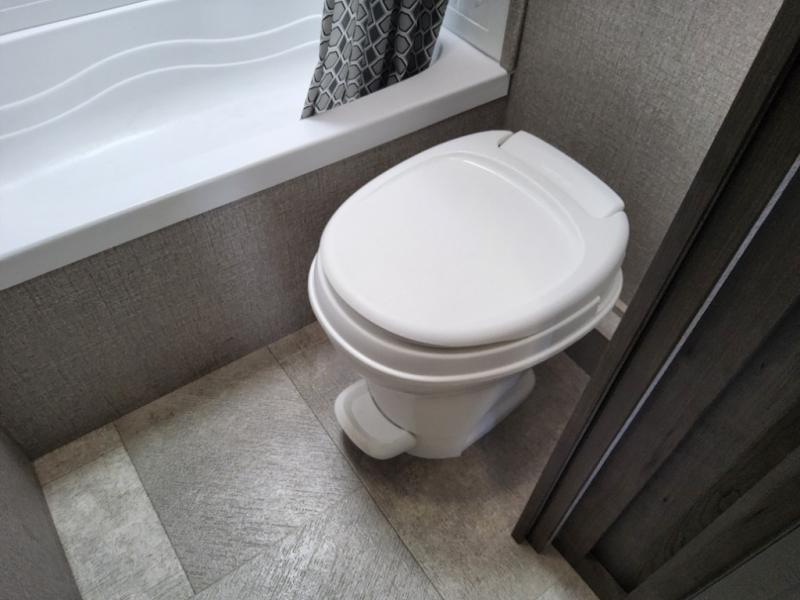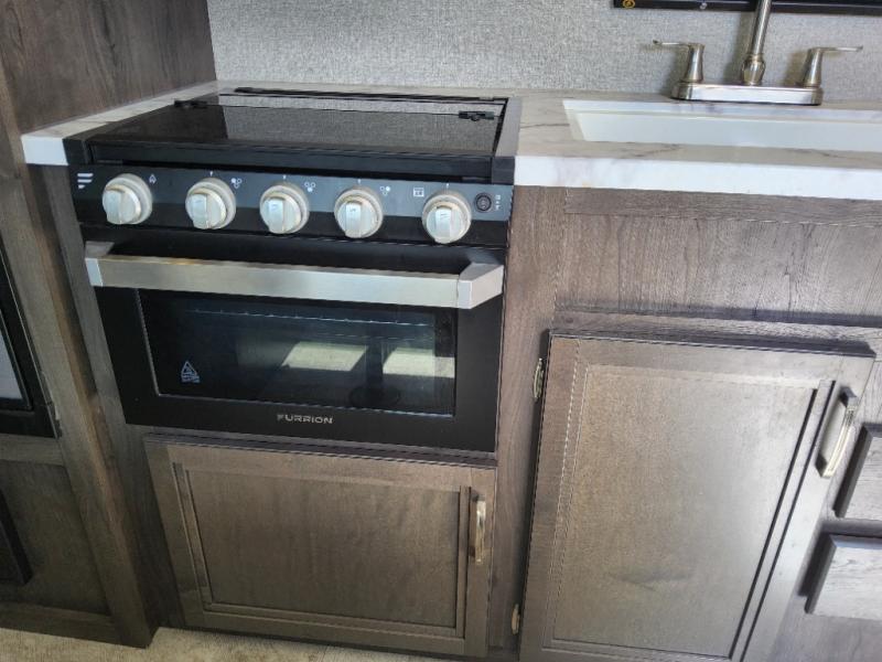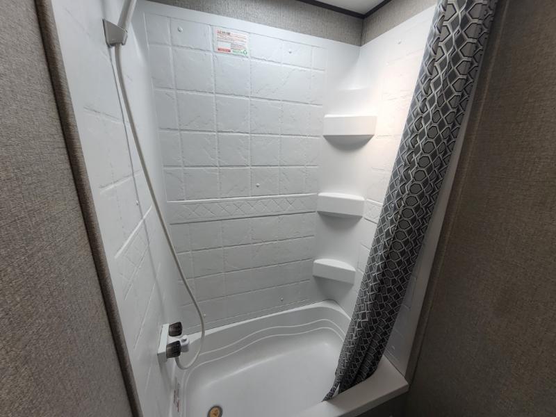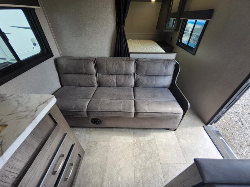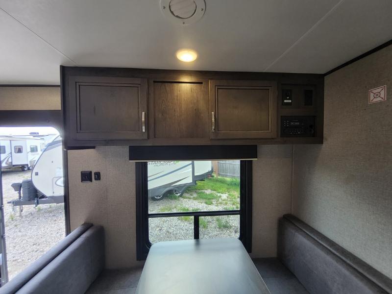 The kids are ready, are you! The double size bunks have been claimed by the kids and their friends, while you get to enjoy your own walk-around queen Serta mattress, dual solid wood cabinet wardrobes and a shelf above the bed for your personal items. You can close the curtain for privacy as the kids have that same choice with the bunks. There is a sofa and booth dinette for inside seating, and outside you can grab your camp chairs from the pass-through compartment to relax under the power awning during the day or at night thanks to the LED lights. And the full kitchen, plus the private tub/shower and toilet room allow you to make meals and stay clean as long as you plan to stay.