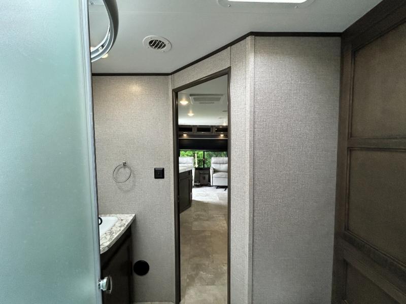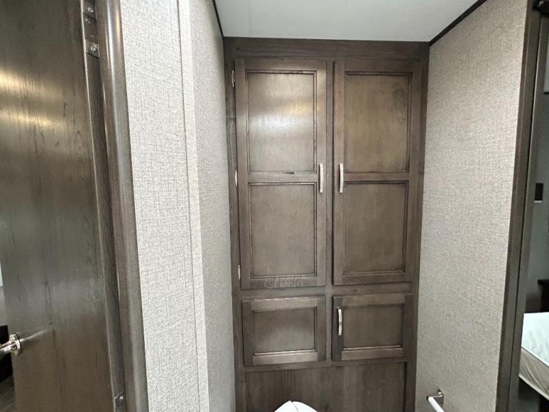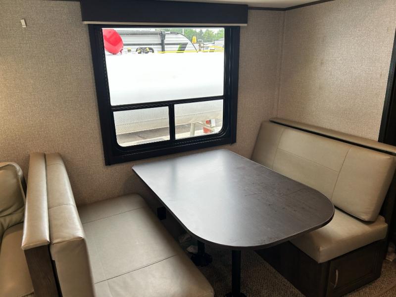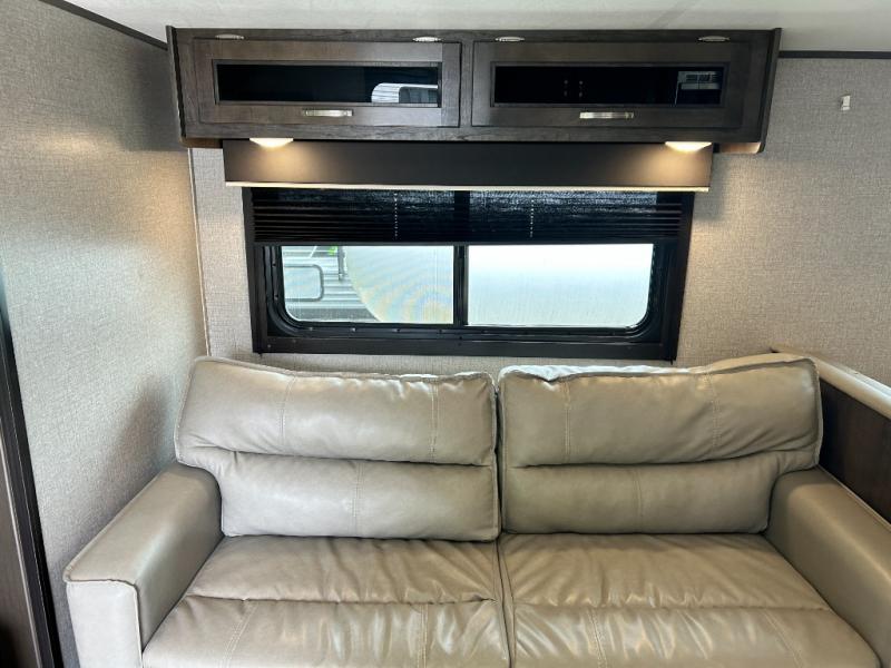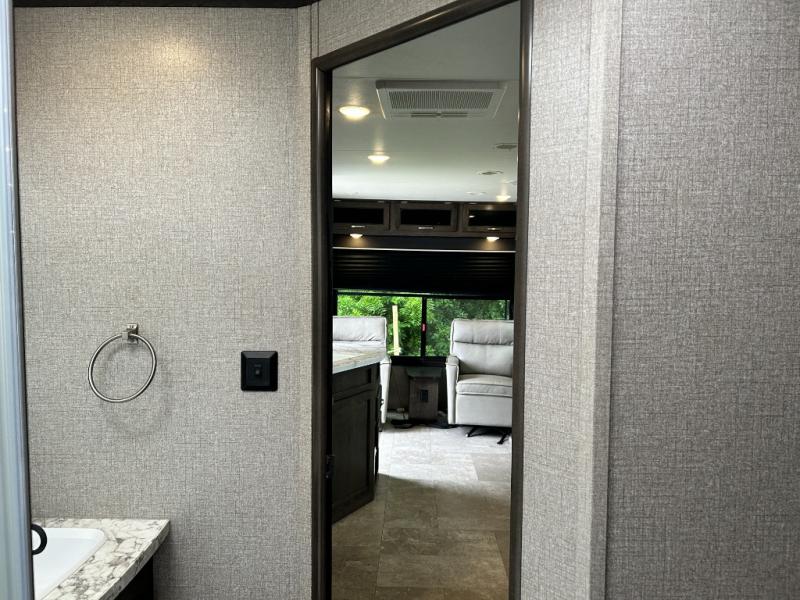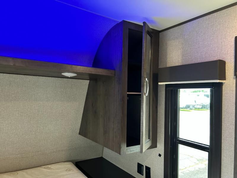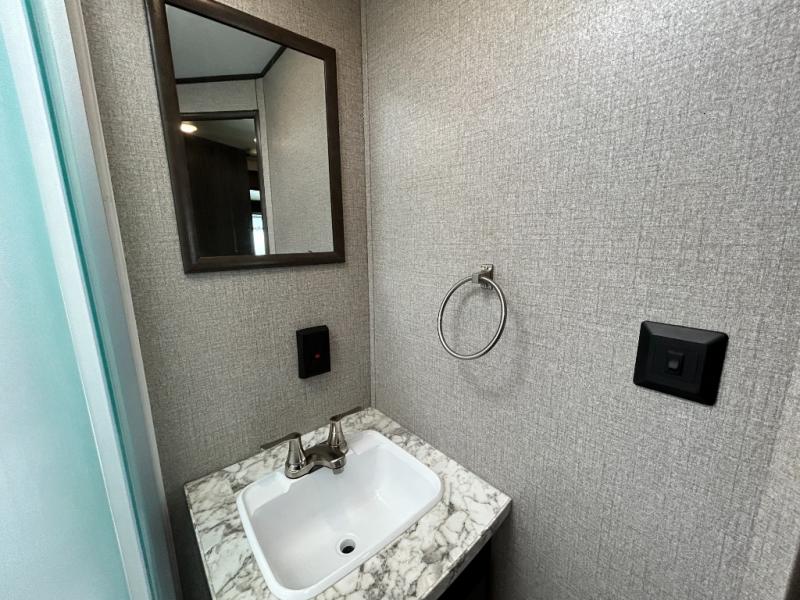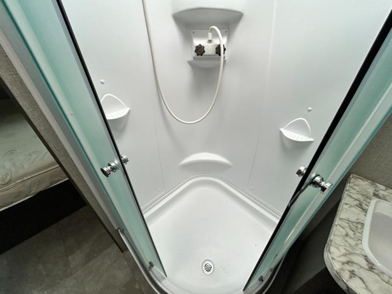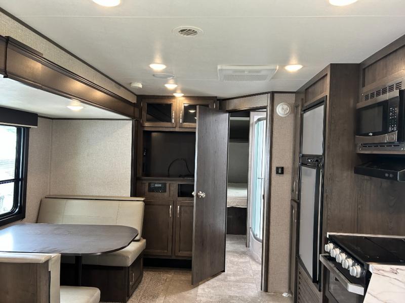 You can easily access the walk-through bathroom through the master bedroom which includes the second exterior entry/exit door or the main living and kitchen area. You will find everything you need to stay clean plus a linen closet. The queen Serta mattress will give you a good night's rest, plus the solid wood cabinet wardrobes and shelf above are stylish and useful. Be sure to claim your swivel rocker for the weekend and you can offer the kids or your guests the sofa or booth dinette in the large slide out after making them a meal or snacks in the full kitchen including a pantry.