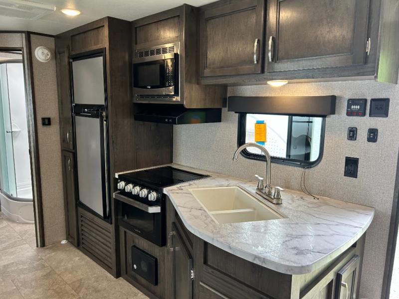 Each Jay Flight SLX 8 travel trailer by Jayco includes the Magnum Truss Roof system which provides seamless DiFlex II material on the roof and plywood decking, and a fully integrated A-frame and I-class cambered structural steel I-beams which is built to last! The roof-mounted air conditioner will come in handy during the hotter months, and the two propane bottles will help keep your showers hot and your meals warm! And when you need to rinse off yourself, your bikes, or the gear, the outdoor shower will do the trick. Choose the floorplan that fits your adventurous side, and load up the family for fun!