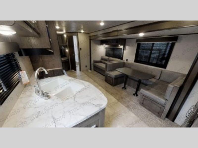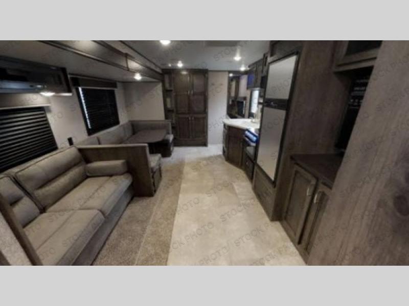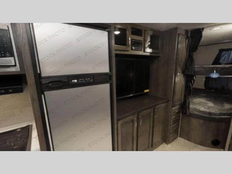 How does cooking breakfast, lunch and even dinner outdoors sound? Well you have that choice each day thanks to the outside kitchen, plus the full kitchen inside offers even more appliances and seamless solid surface countertops. The spacious living area offers a slide out jackknife sofa and U-shaped dinette, and an entertainment center with a 48" TV, plus bench/storage which is quiet handy as you enter the trailer. The kids will enjoy having their own double size bunk with privacy curtain and you can slide the master bedroom door closed and fall asleep on your own queen bed to wake up to grab your clothing from the solid wood cabinet wardrobes.