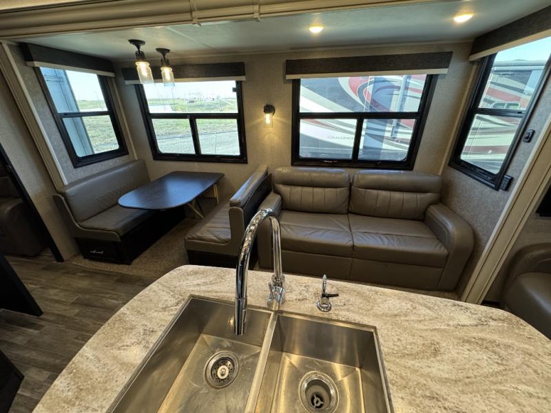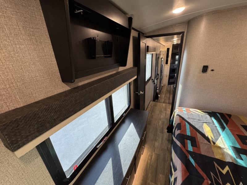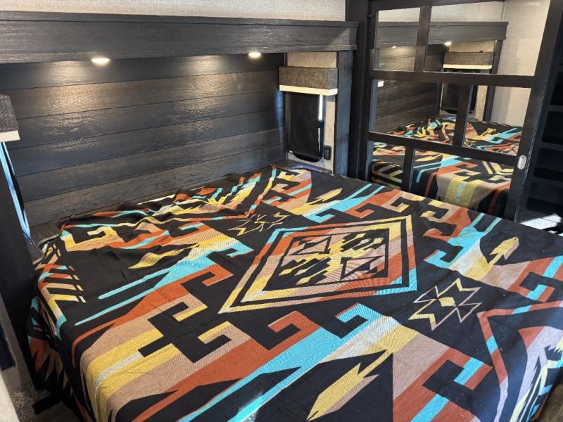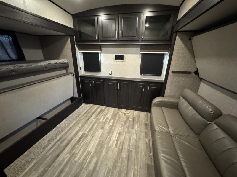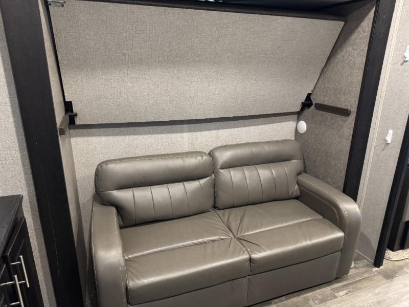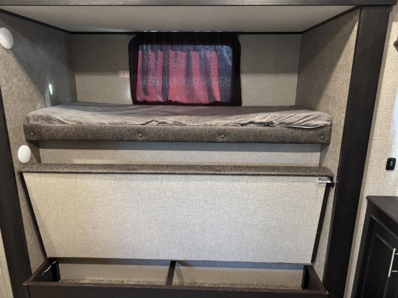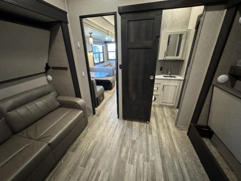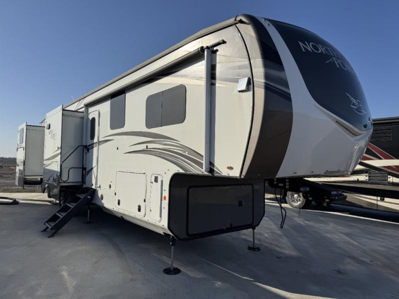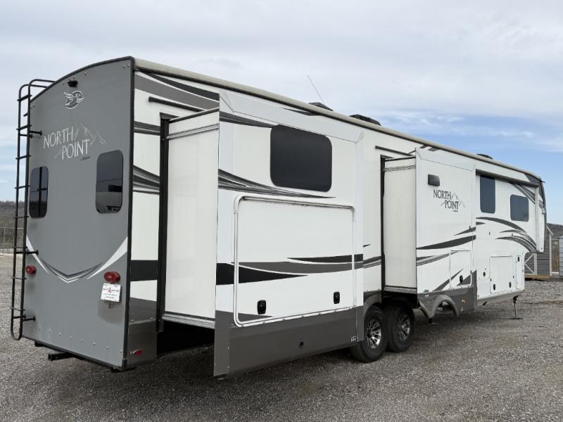 For fun, convenience, and luxury, you need this North Point fifth wheel! The ceiling fan above the kitchen island will keep you cool while you chop some veggies for tonight's stir fry, and your guests will be able to sit back and chat with you on the hide-a-bed sofa or lounge chairs while you prep dinner. The bunkhouse suite is such a convenient feature because it contains two opposing slides for more living space, a half bathroom for room to get ready in the morning, and the second exterior entry door for a quick entrance late at night.