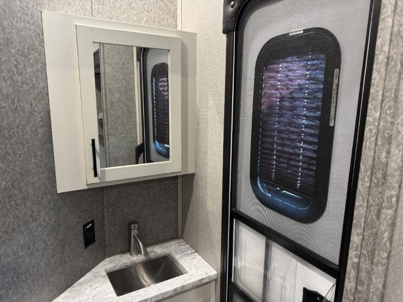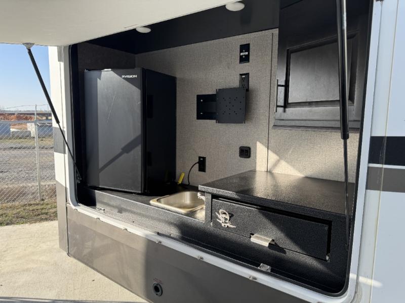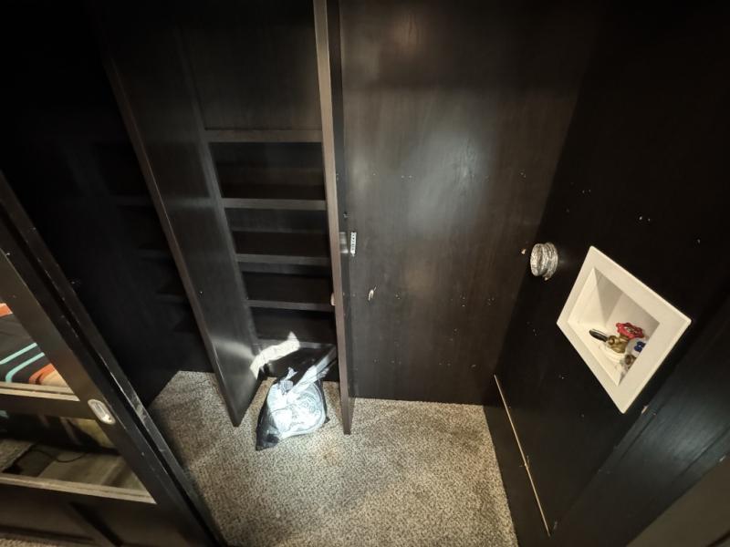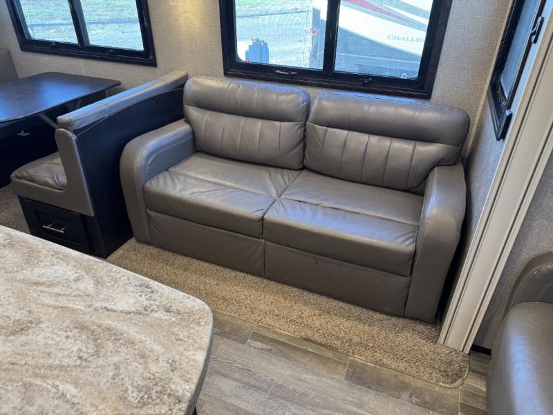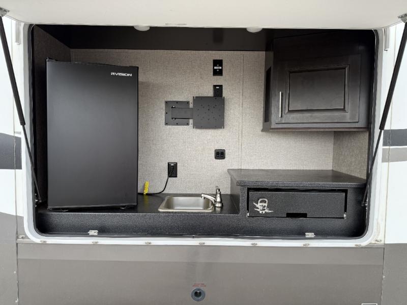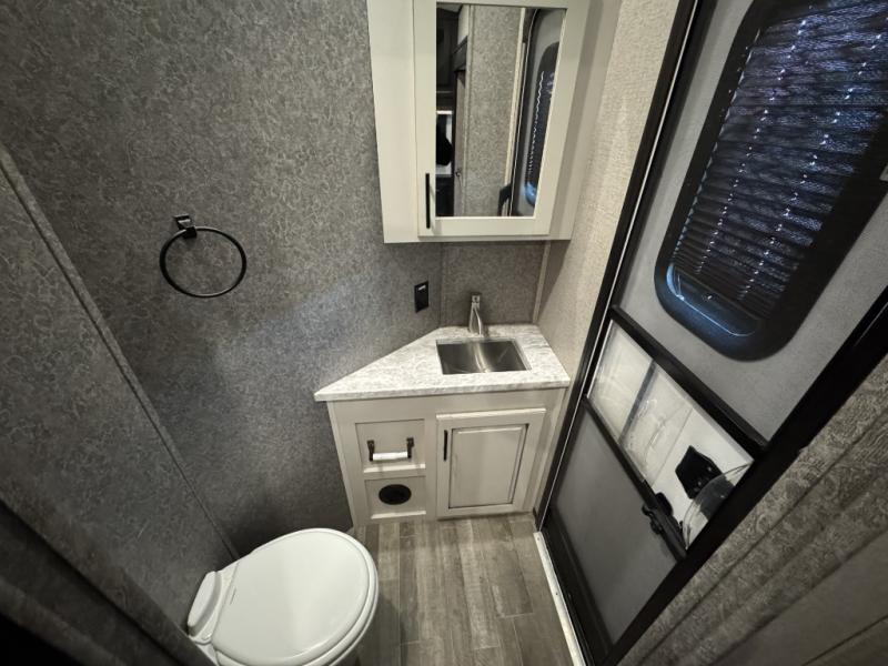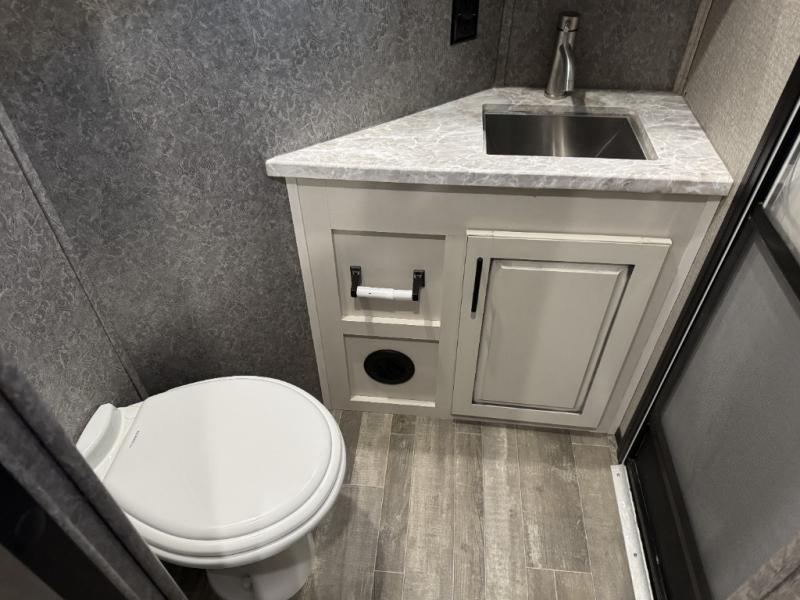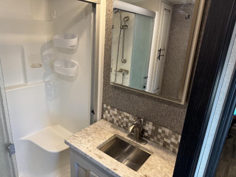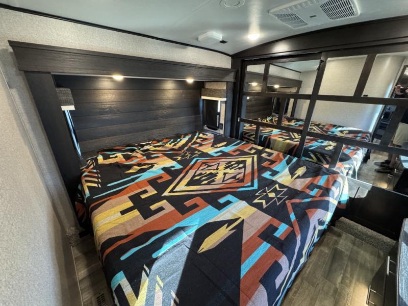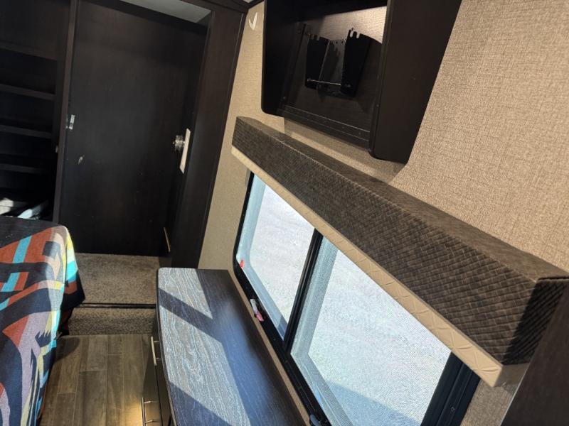 For fun, convenience, and luxury, you need this North Point fifth wheel! The ceiling fan above the kitchen island will keep you cool while you chop some veggies for tonight's stir fry, and your guests will be able to sit back and chat with you on the hide-a-bed sofa or lounge chairs while you prep dinner. The bunkhouse suite is such a convenient feature because it contains two opposing slides for more living space, a half bathroom for room to get ready in the morning, and the second exterior entry door for a quick entrance late at night.
