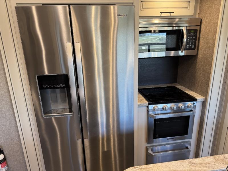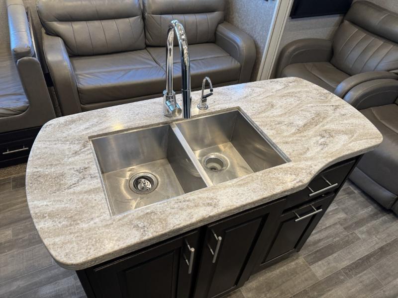 What I liked most: Very nice private three bunk bedroom with bath in the rear of the coach. Fireplace, island kitchen, two recliners, huge TV, full-size refrigerator.