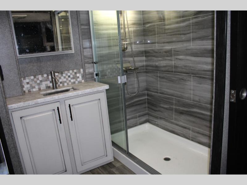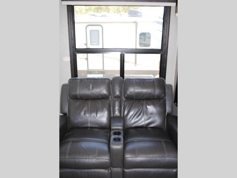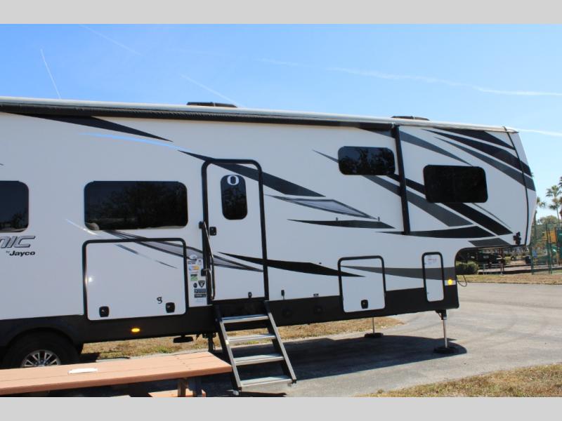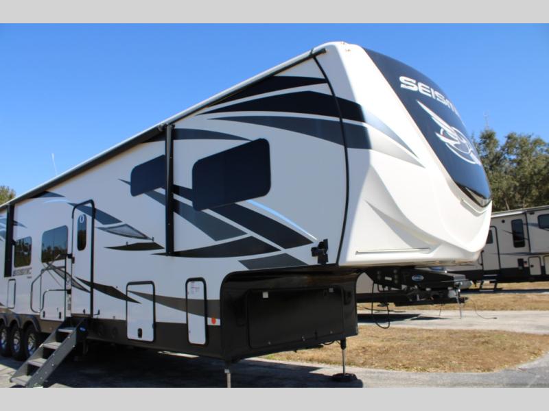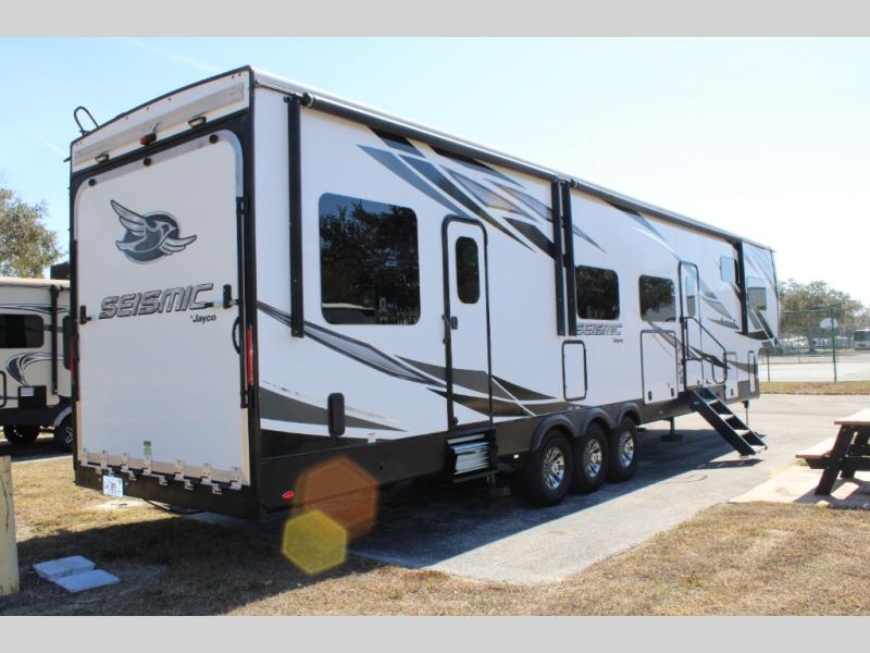 With any Jayco Seismic toy hauler fifth wheel you will appreciate the wide body structural steel I-beam construction, and the Magum Truss XL6 roof system, the strongest in the industry that will allow you to enjoy your RV for years to come. Each model features LED high-intensity ramp lights for easy loading and unloading, D-rings mounted to the steel frame to keep your toys secure, and a two inch block-foam insulated garage door to keep you comfortable in any weather. Inside, these models include a SuperSofa with heat, massage, and LED lighting, Shaw "Wood Plank" vinyl flooring, a central vacuum system, and the JAYCOMMAND Smart RV system that allows you to control many functions of your RV right from your smartphone or tablet.
