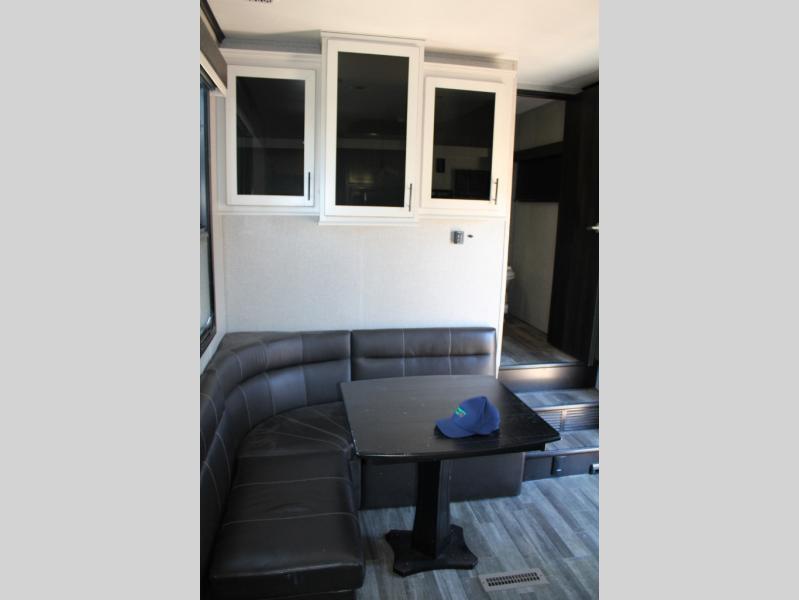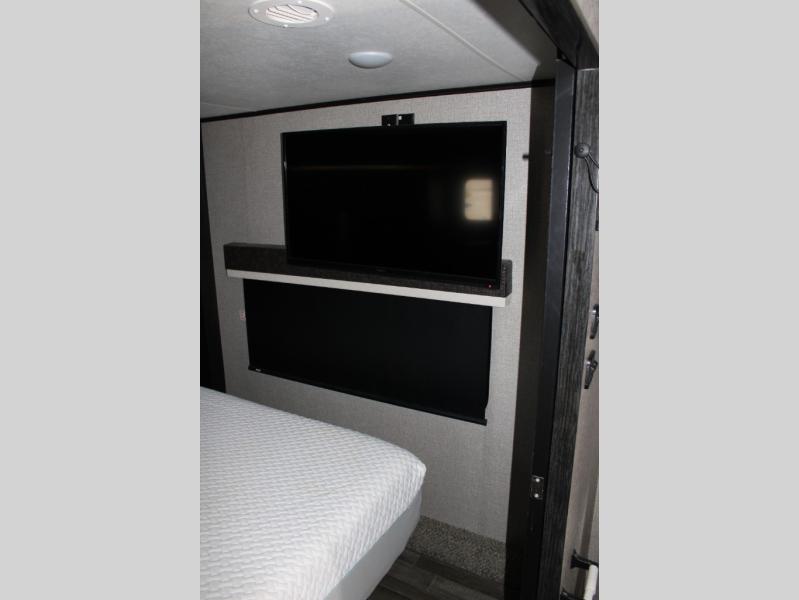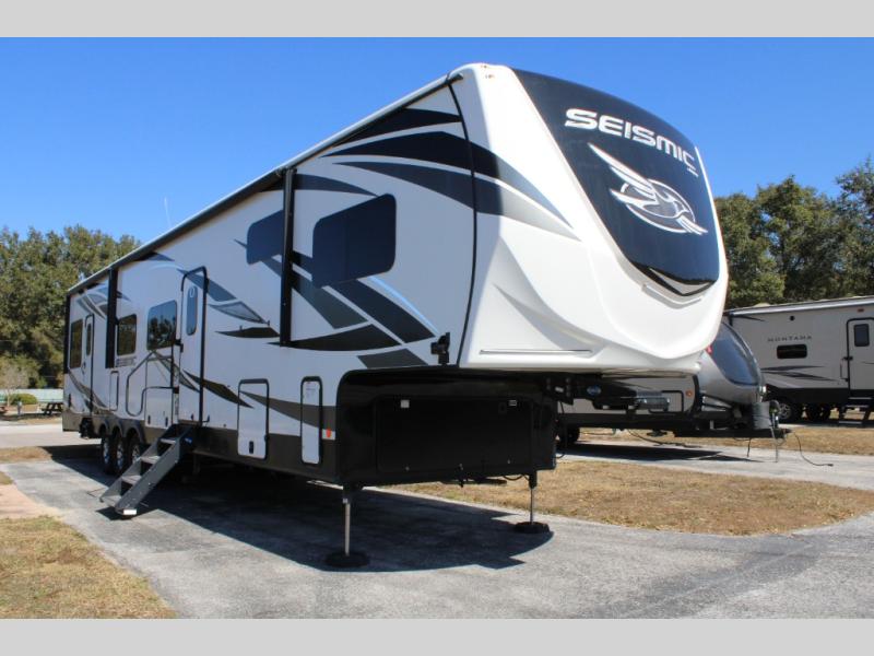 You will love every minute that you spend with this Seismic toy hauler! The 13' separate garage features a loft for the kids, plus a HappiJack electric queen bed, and its own exterior entry door. You can relax on the theater sofa with the 50" retractable TV, and the fireplace will make you feel right at home. There is also an L-shaped dinette that will be the perfect place to enjoy your morning coffee at. Mom and dad will love the front master bedroom that includes a queen bed, their own 40" TV, plus a wardrobe slide out. If you thought the inside is packed with features, just wait until you check out the outside. Here, you'll find two power awnings, an outside kitchen, plus an outdoor TV to watch the big game with friends!