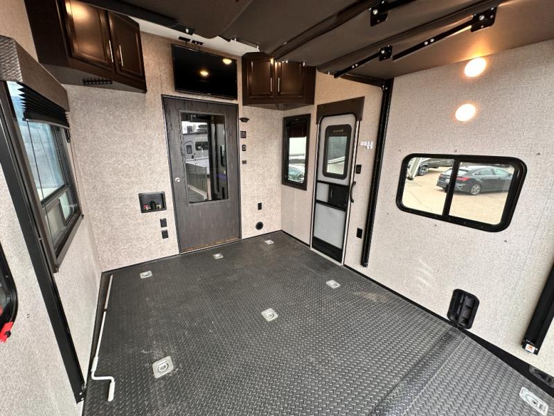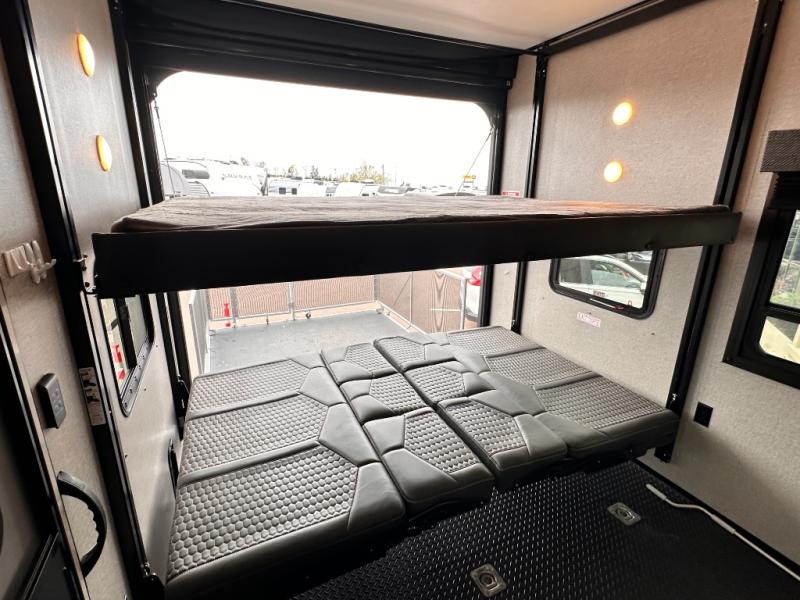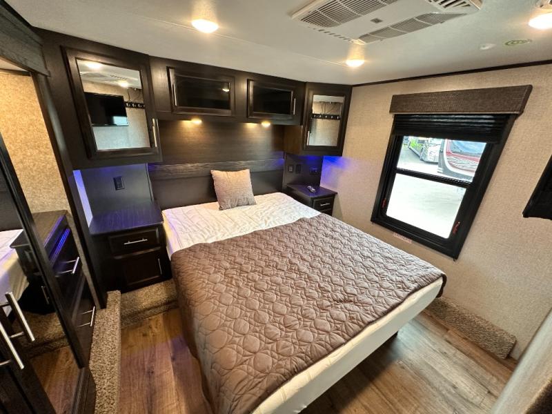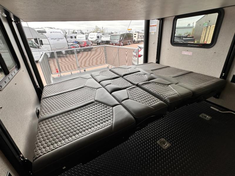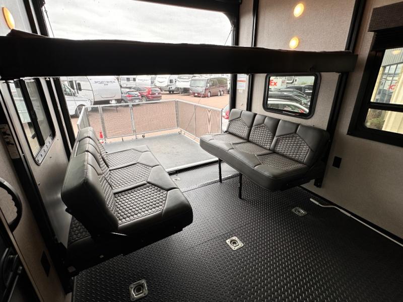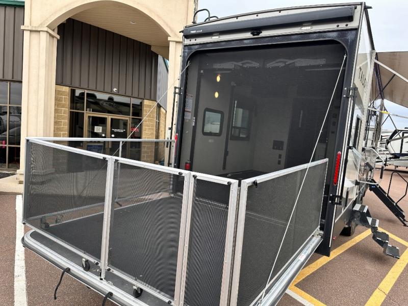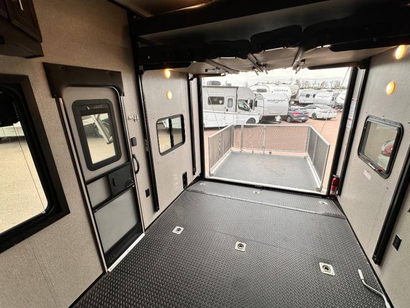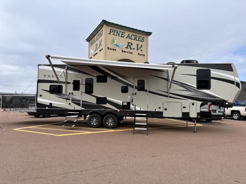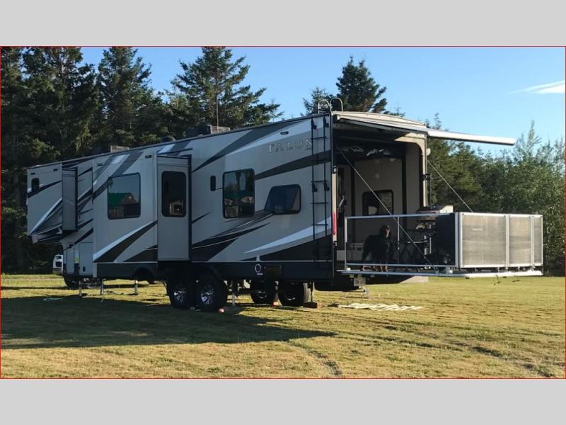 Each Talon toy hauler fifth wheel is constructed with a wide-body structural steel I-beam, a fully enclosed and heated underbelly and the industry exclusive HELIX Cooling System to keep you comfortable in all seasons. The hinged spring-assisted, radius-cornered ramp door has a 2,500 lb. capacity with anti-slip and non-skid flooring, making it easier then ever to load and unload your toys and each model includes a 40 gal. fuel tank with a timer. These models include plenty of storage, including gas-strutted under-bed storage, a pass-through storage with Slam-Latch baggage doors, and at least two slides for added interior space. With comfortable features such as Shaw residential carpeting and vinyl flooring, a residential queen Serta mattress, and USB ports in the kitchen and bedroom, you won't even notice you're away from home!