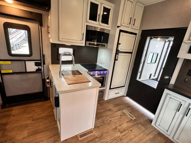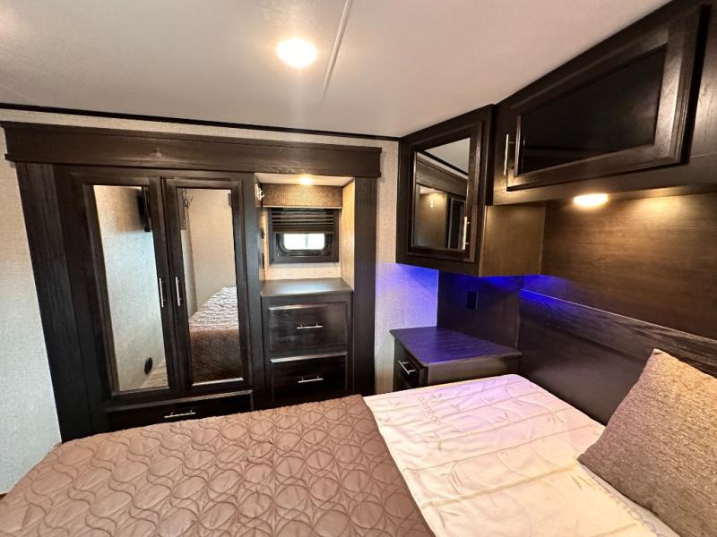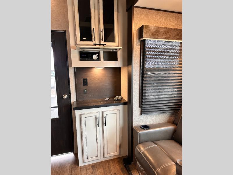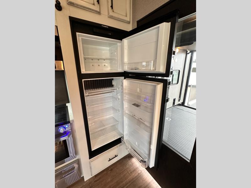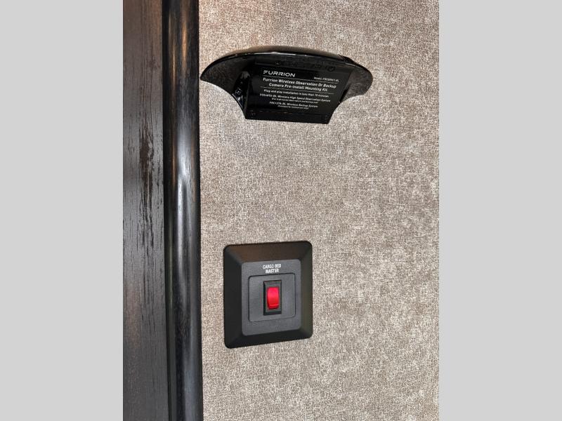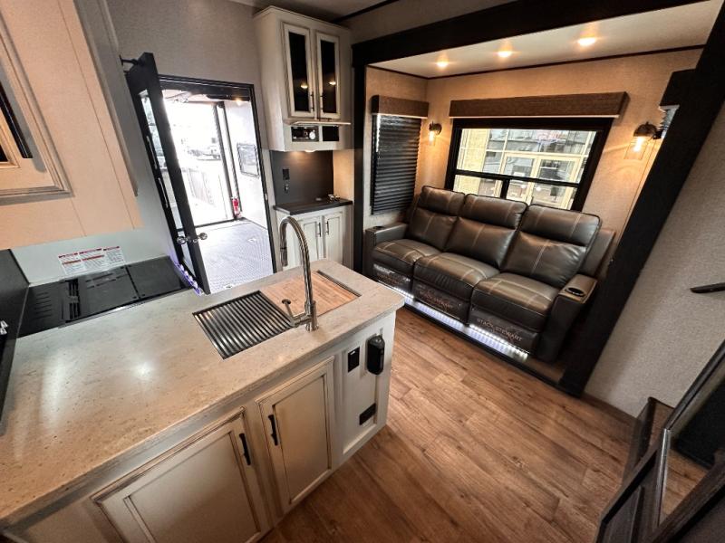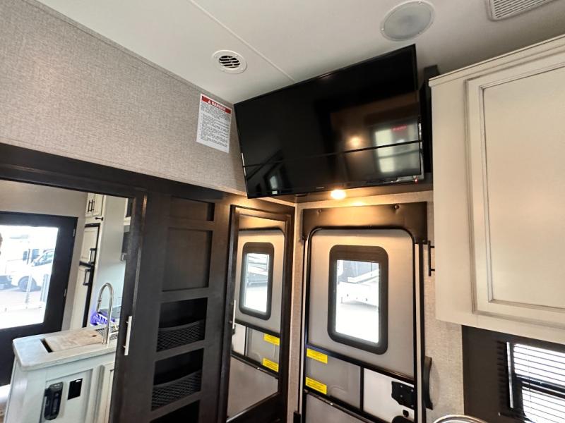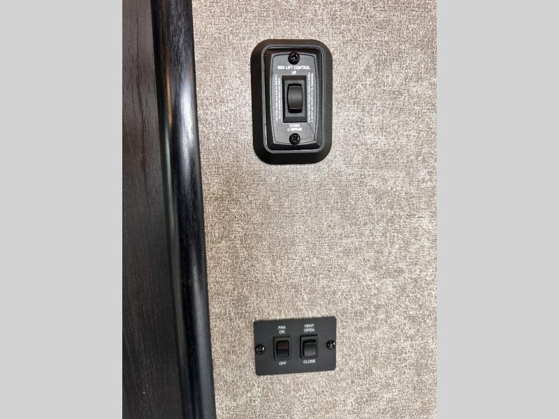 Each Talon toy hauler fifth wheel is constructed with a wide-body structural steel I-beam, a fully enclosed and heated underbelly and the industry exclusive HELIX Cooling System to keep you comfortable in all seasons. The hinged spring-assisted, radius-cornered ramp door has a 2,500 lb. capacity with anti-slip and non-skid flooring, making it easier then ever to load and unload your toys and each model includes a 40 gal. fuel tank with a timer. These models include plenty of storage, including gas-strutted under-bed storage, a pass-through storage with Slam-Latch baggage doors, and at least two slides for added interior space. With comfortable features such as Shaw residential carpeting and vinyl flooring, a residential queen Serta mattress, and USB ports in the kitchen and bedroom, you won't even notice you're away from home!