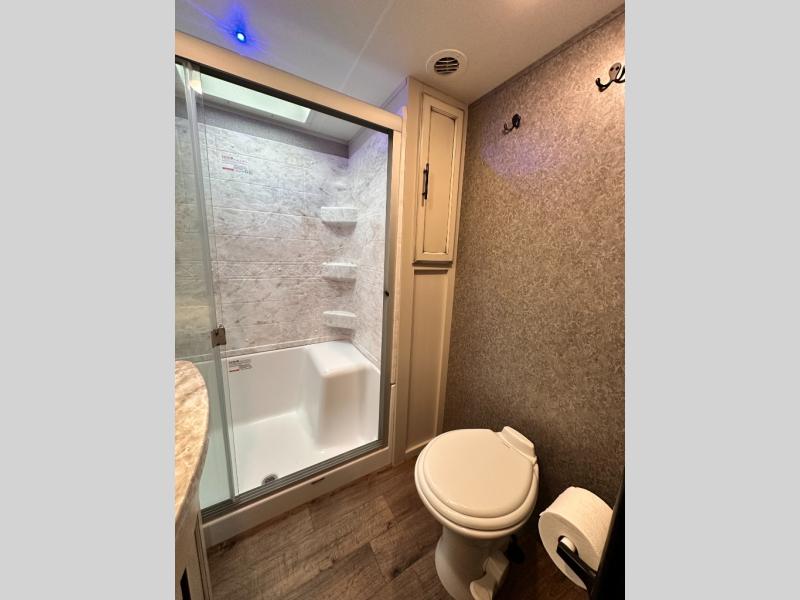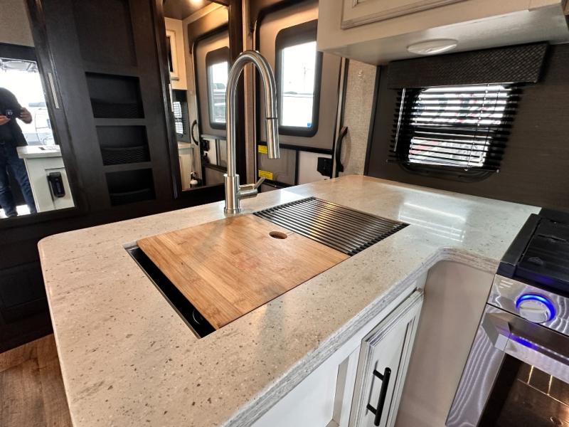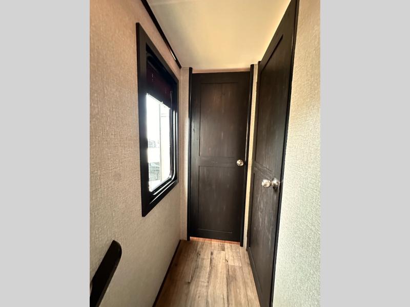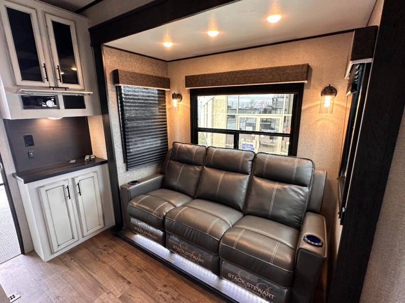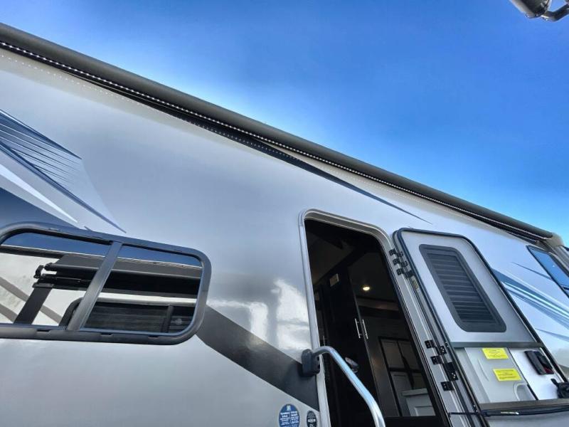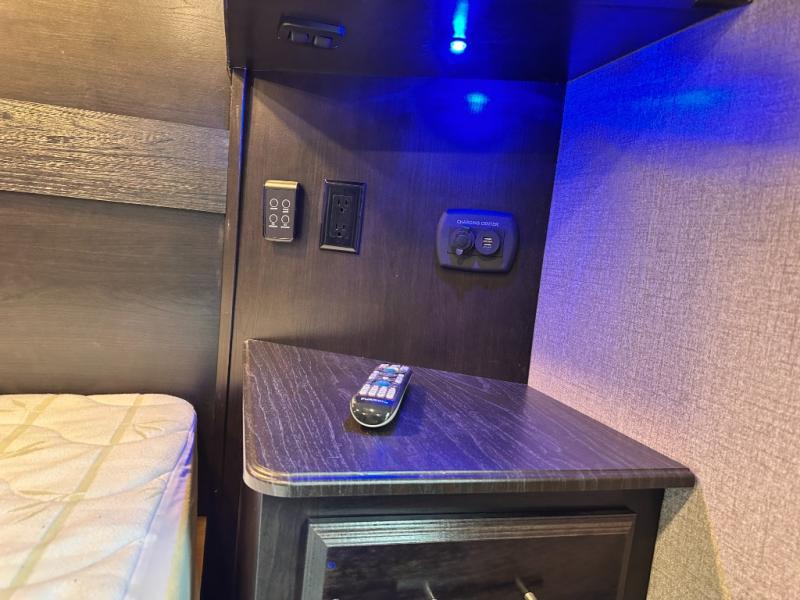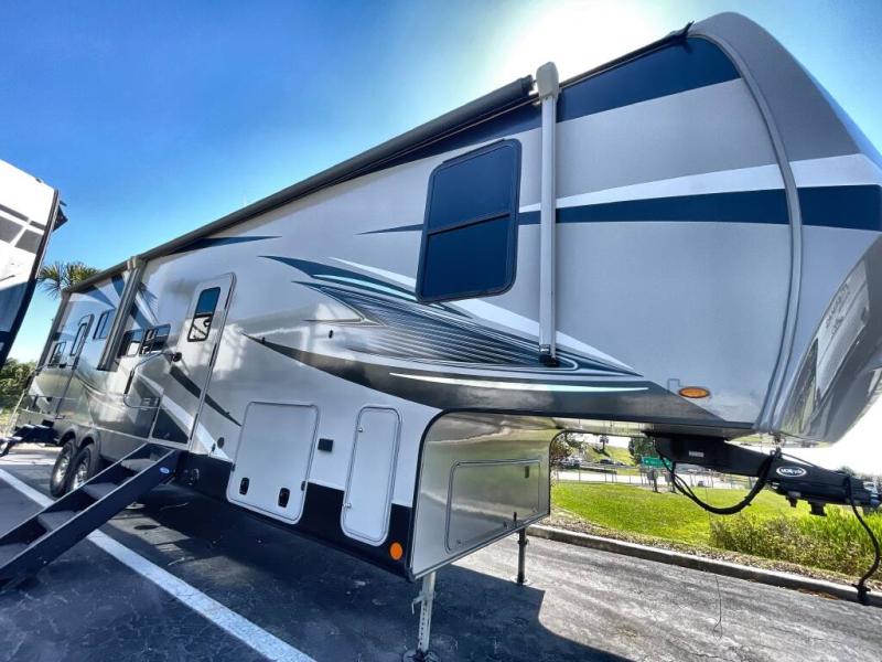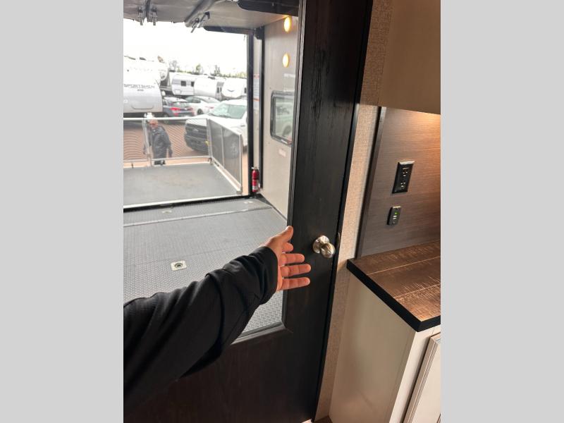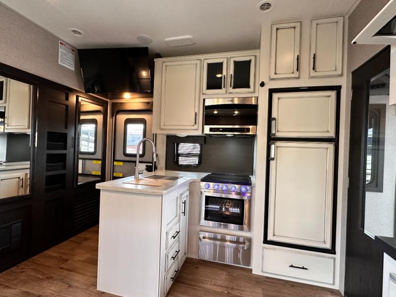 Each Talon toy hauler fifth wheel is constructed with a wide-body structural steel I-beam, a fully enclosed and heated underbelly and the industry exclusive HELIX Cooling System to keep you comfortable in all seasons. The hinged spring-assisted, radius-cornered ramp door has a 2,500 lb. capacity with anti-slip and non-skid flooring, making it easier then ever to load and unload your toys and each model includes a 40 gal. fuel tank with a timer. These models include plenty of storage, including gas-strutted under-bed storage, a pass-through storage with Slam-Latch baggage doors, and at least two slides for added interior space. With comfortable features such as Shaw residential carpeting and vinyl flooring, a residential queen Serta mattress, and USB ports in the kitchen and bedroom, you won't even notice you're away from home!