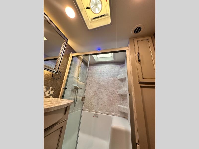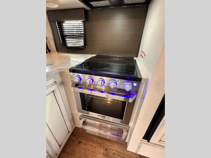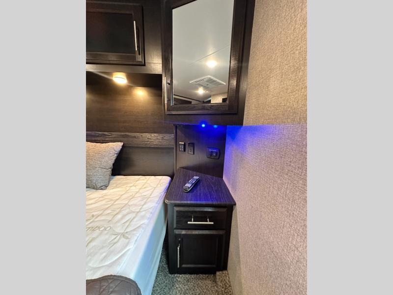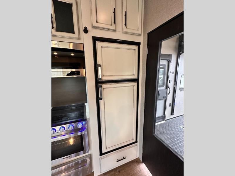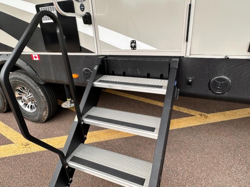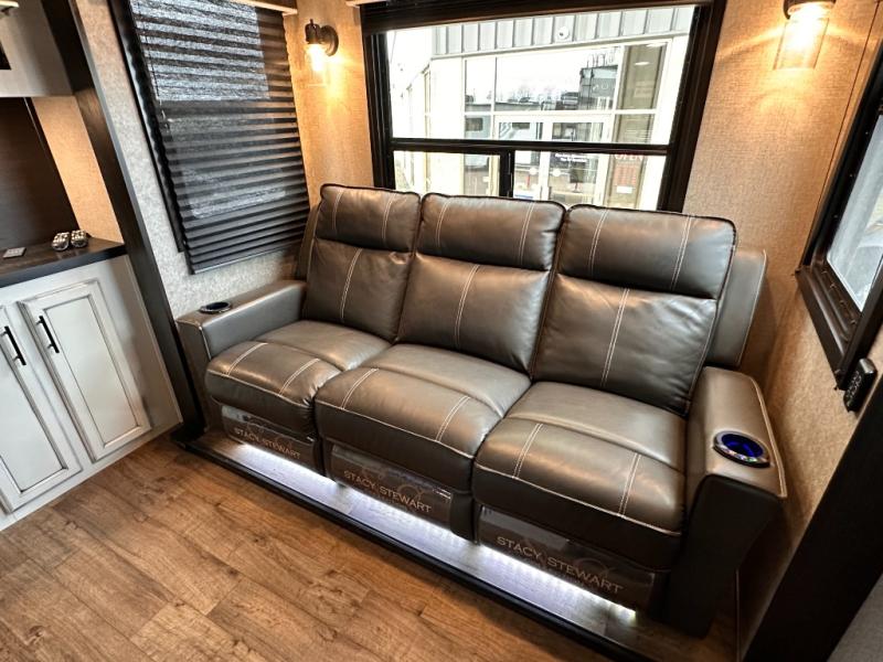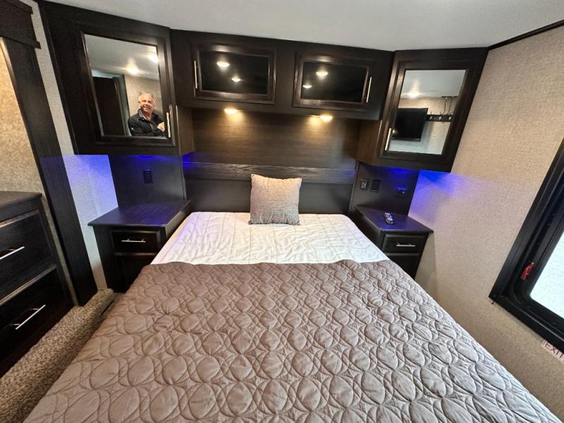 Load up the riding toys and head to the lake in this toy hauler that features a 11' 1" garage and double slides for more space. Your guests will enjoy the HappiJac electric-lift queen bed and the convertible sofas below can offer additional sleeping space. This model includes all the kitchen amenities you need to make meals each day, including a stainless steel range and microwave, and the 8 cu.ft. refrigerator with a freezer can hold food for the weekend. After a day of riding, relax on the super sofa that includes heat, massage, and LED lighting and the queen bed in the front private bedroom will make you feel right at home.