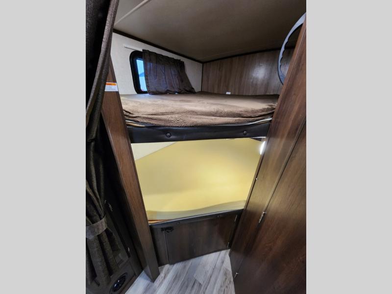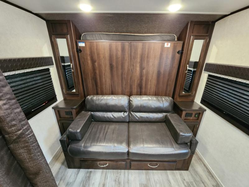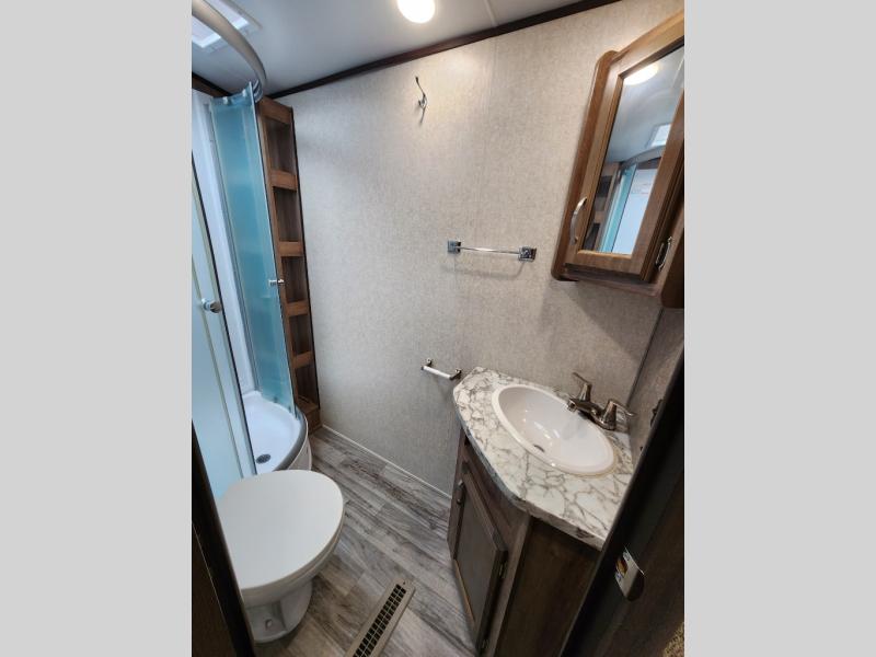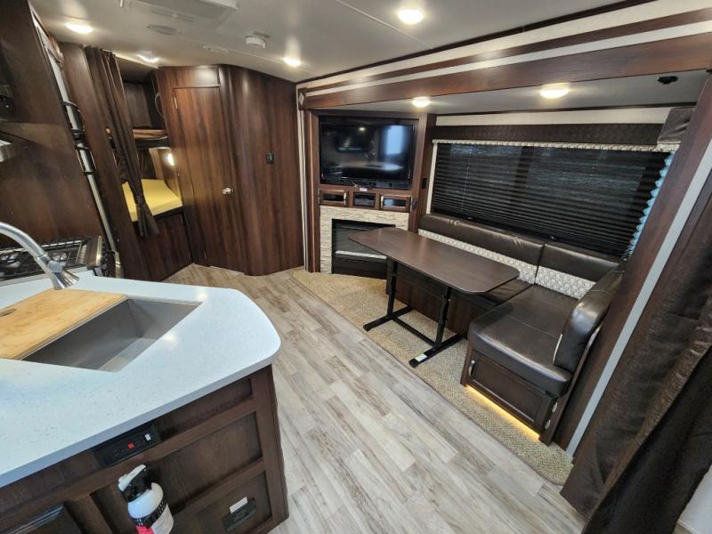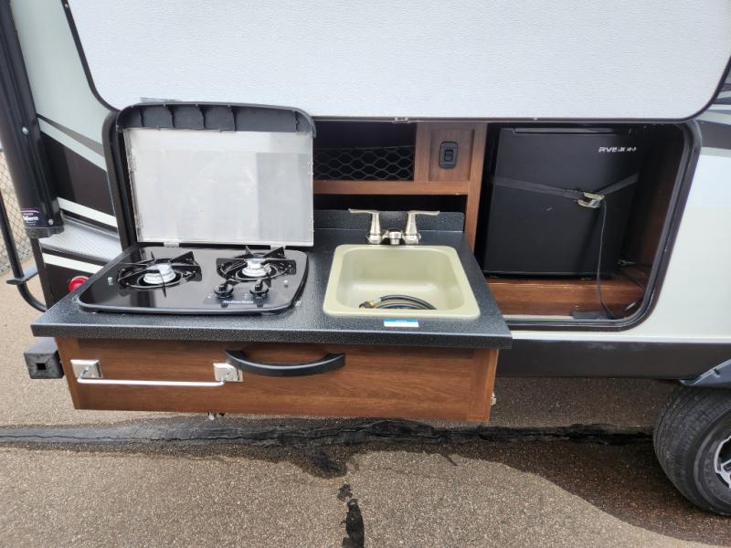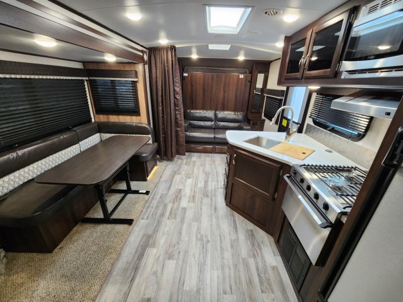 Traveling in this White Hawk travel trailer is like traveling in the lap of luxury. With the addition of the Murphy bed, you can decide whether or not you want the front of the trailer to be used as extra seating for the living area or as a semi-private bedroom. The semi-private bunks give you the space that you need in this model to sleep seven people comfortably. If you get tired of spending every day cooking indoors, then you can take your preparations outside to prepare dinner in the outdoor kitchen, and the bathroom skylight allows some of that outdoor sunshine to brighten up the 34" radius shower.